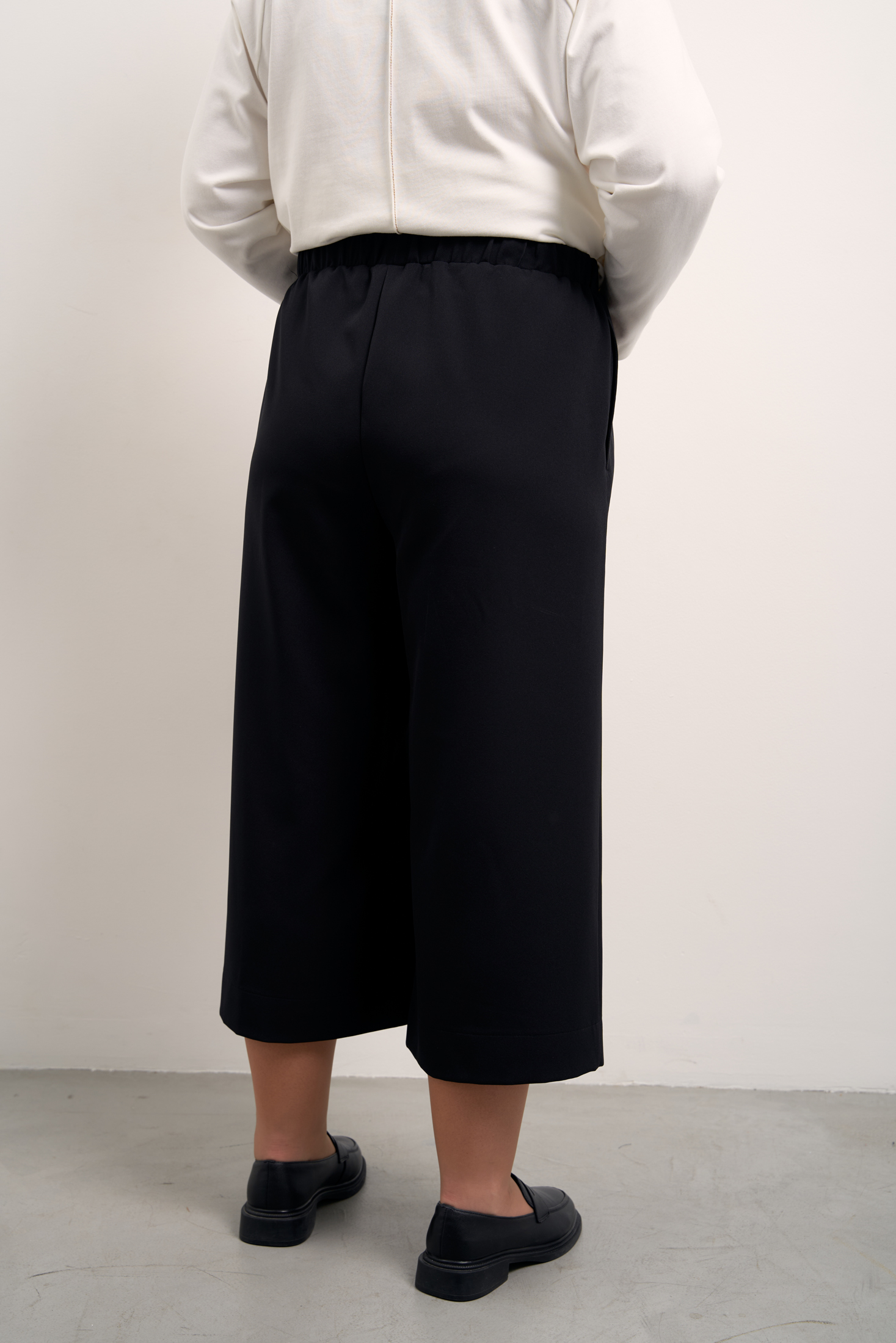 Брюки-кюлоты свободного кроя. Пояс притачной с эластичной тесьмой внутри.  Боковые карманы на передних половинках. Длина брюк прикрывающая икры. Выполнены из костюмной ткани с содержанием вискозы в черном цвете.