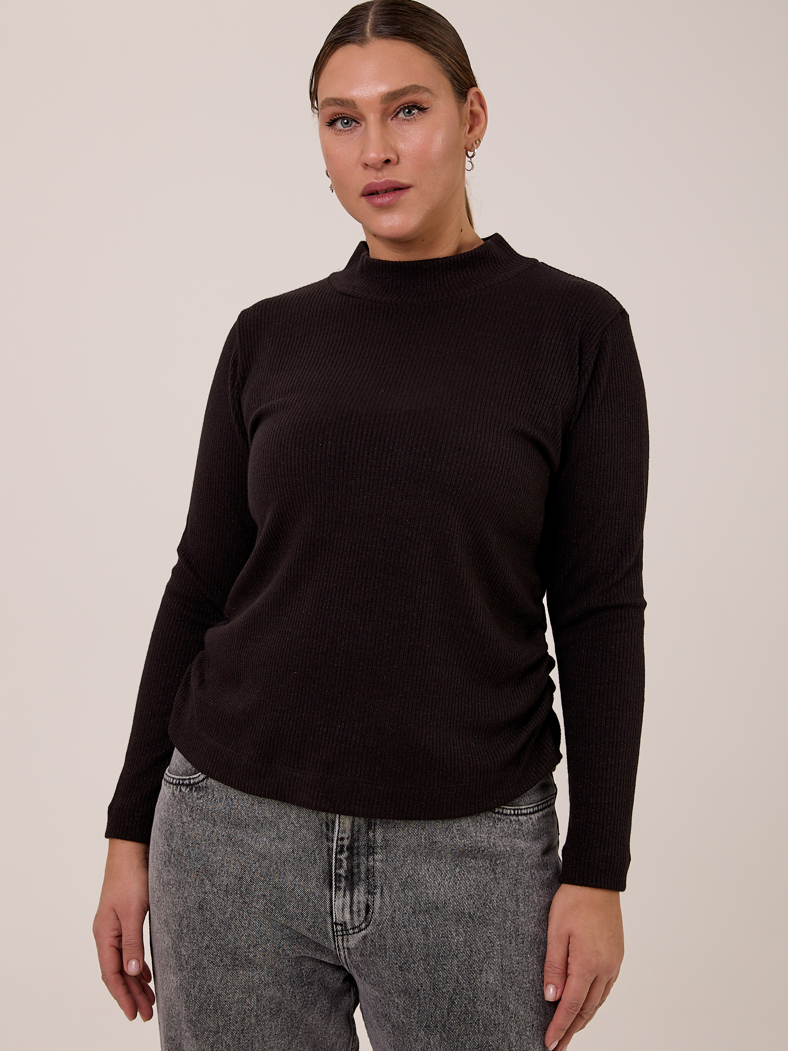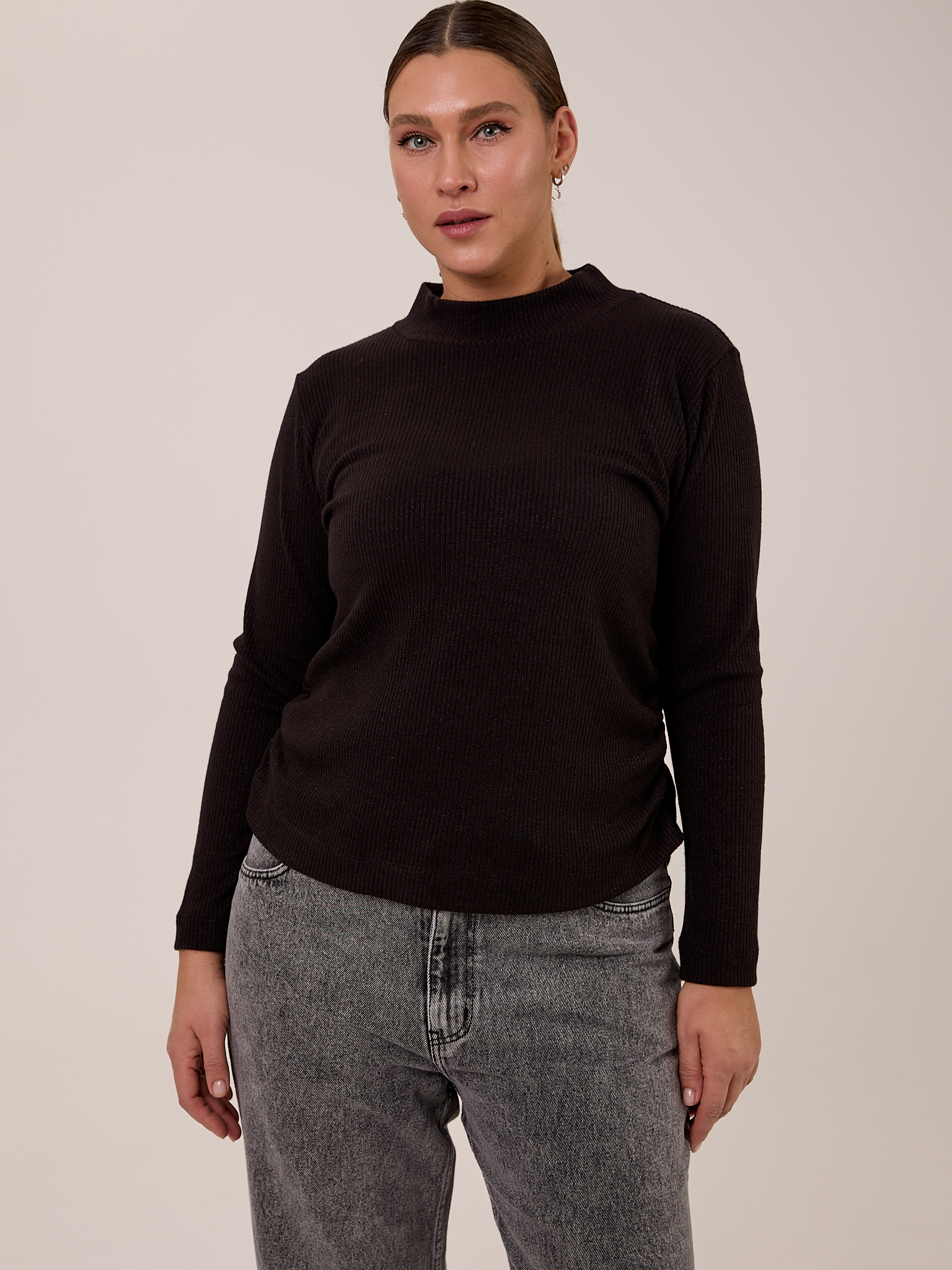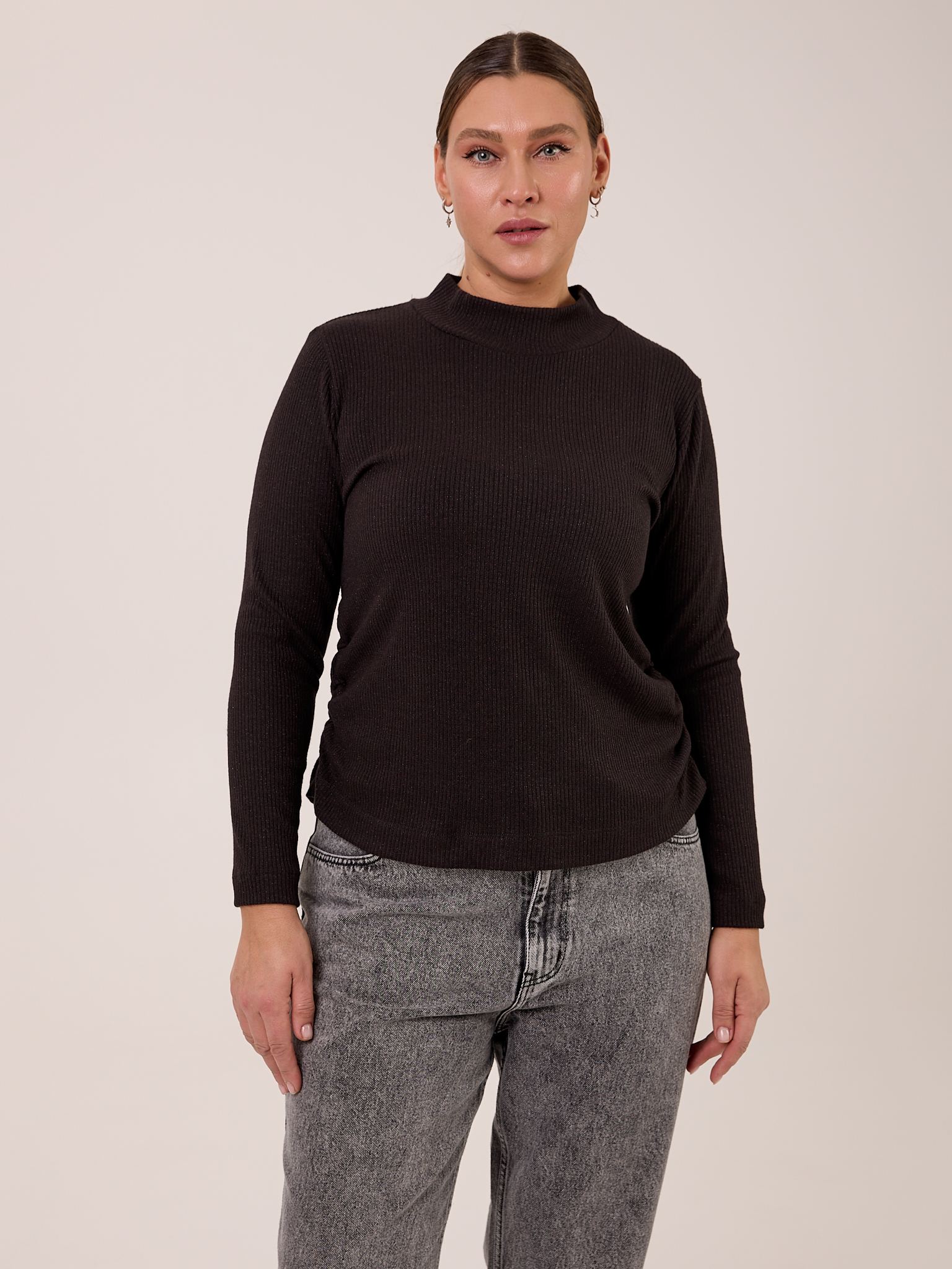 Блузон полуприлегающего силуэта, типа водолазки с невысокой стойкой. Рукава длинные. Боковые швы присобраны и образуют мягкие складки. Блузон выполнен из мягкого вязанного трикотажа с содержанием вискозы