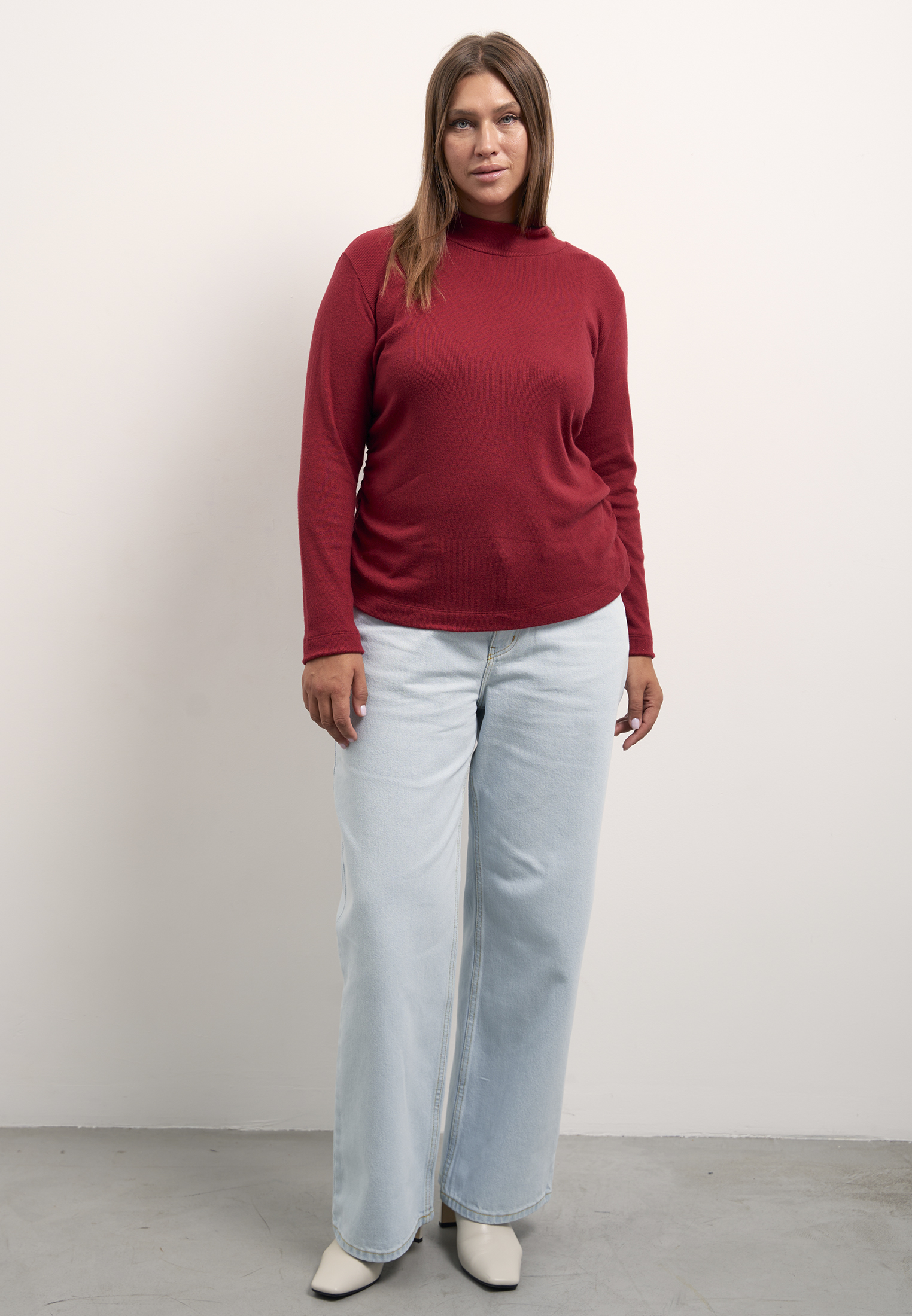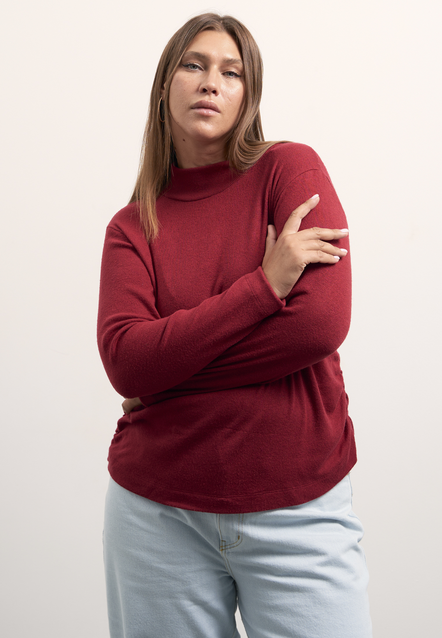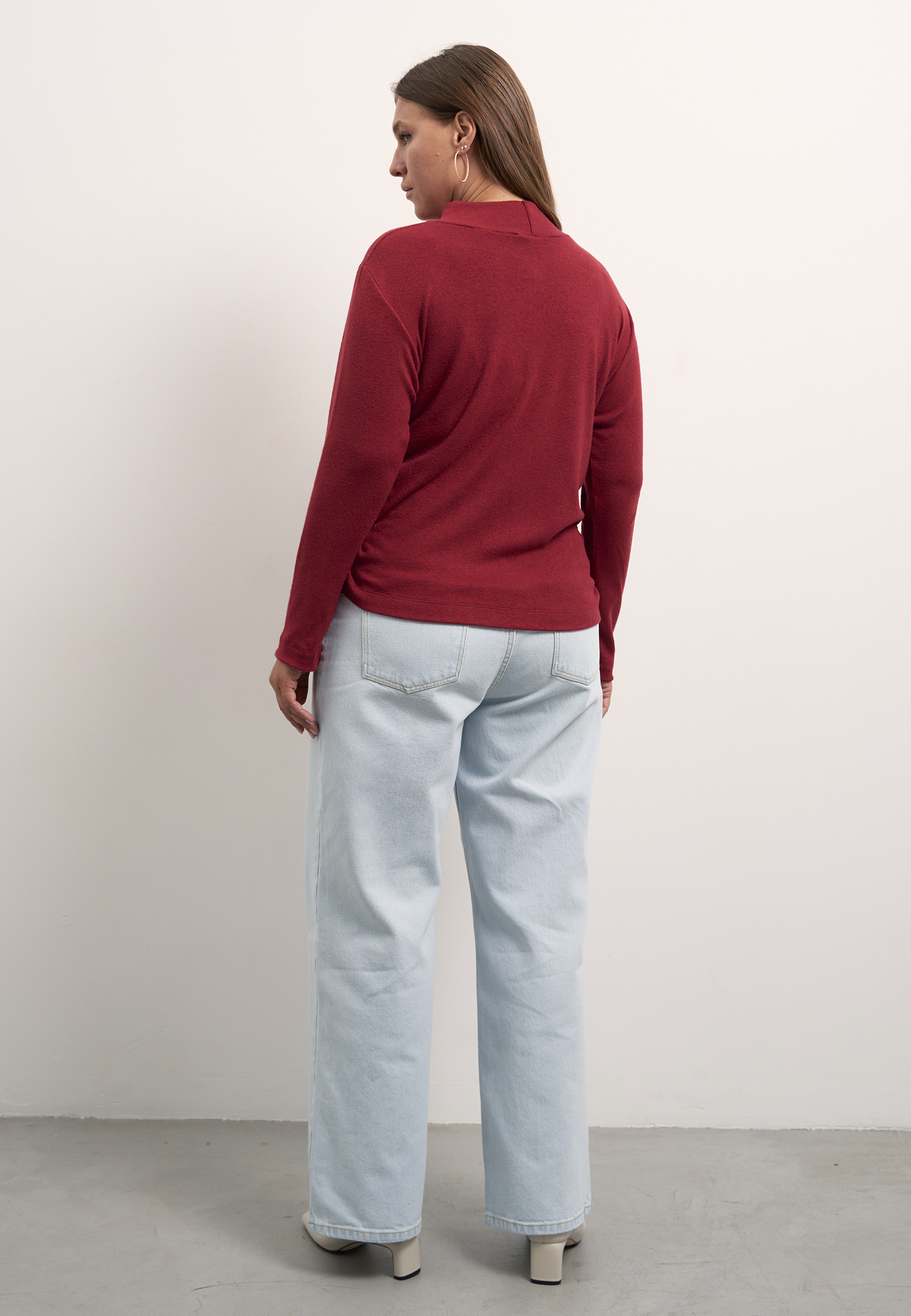 Блузон полуприлегающего силуэта, типа водолазки с невысокой стойкой. Рукава длинные. Боковые швы присобраны и образуют мягкие складки. Блузон выполнен из мягкого вязанного трикотажа с содержанием вискозы в сером и т. красном цветах.