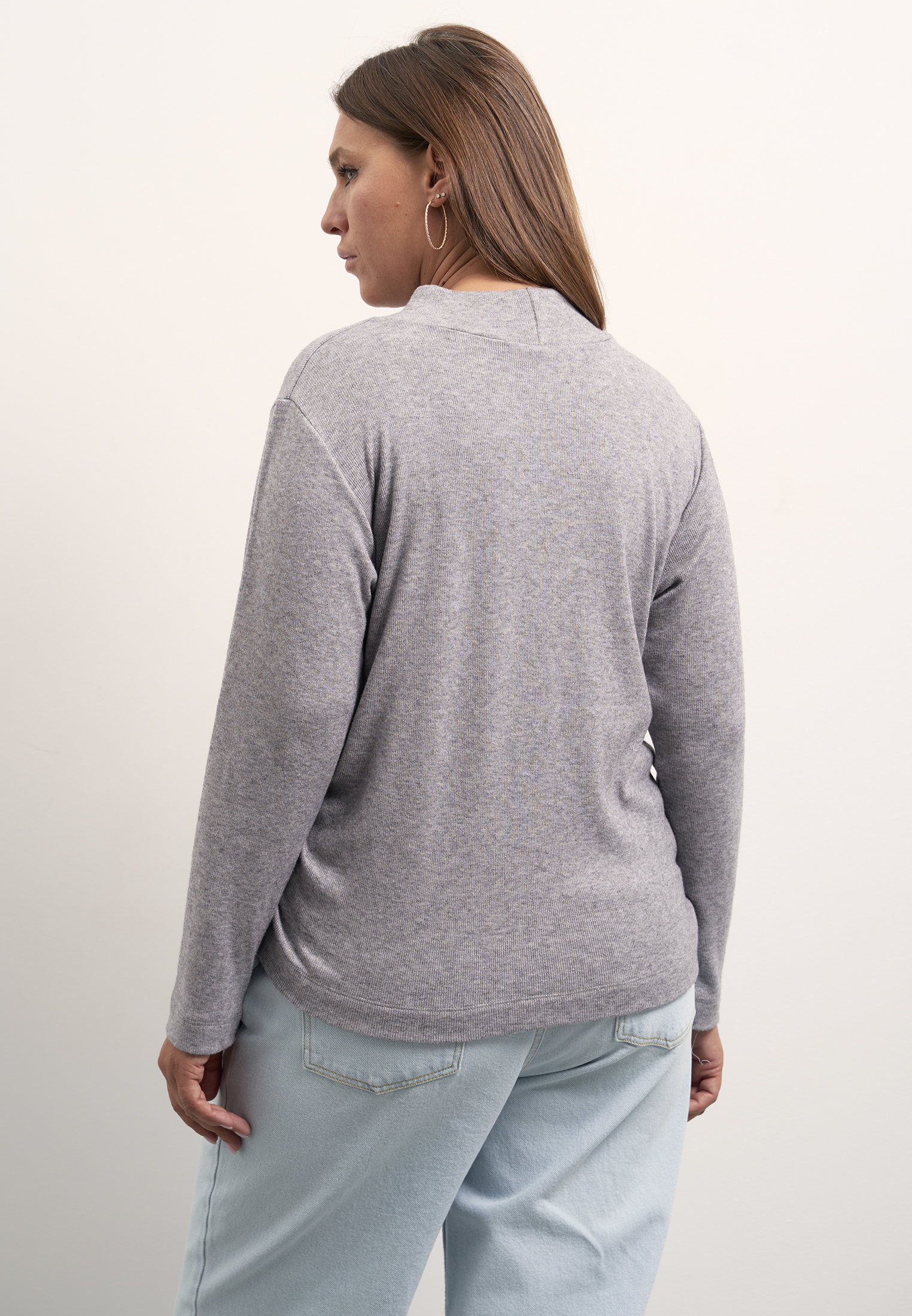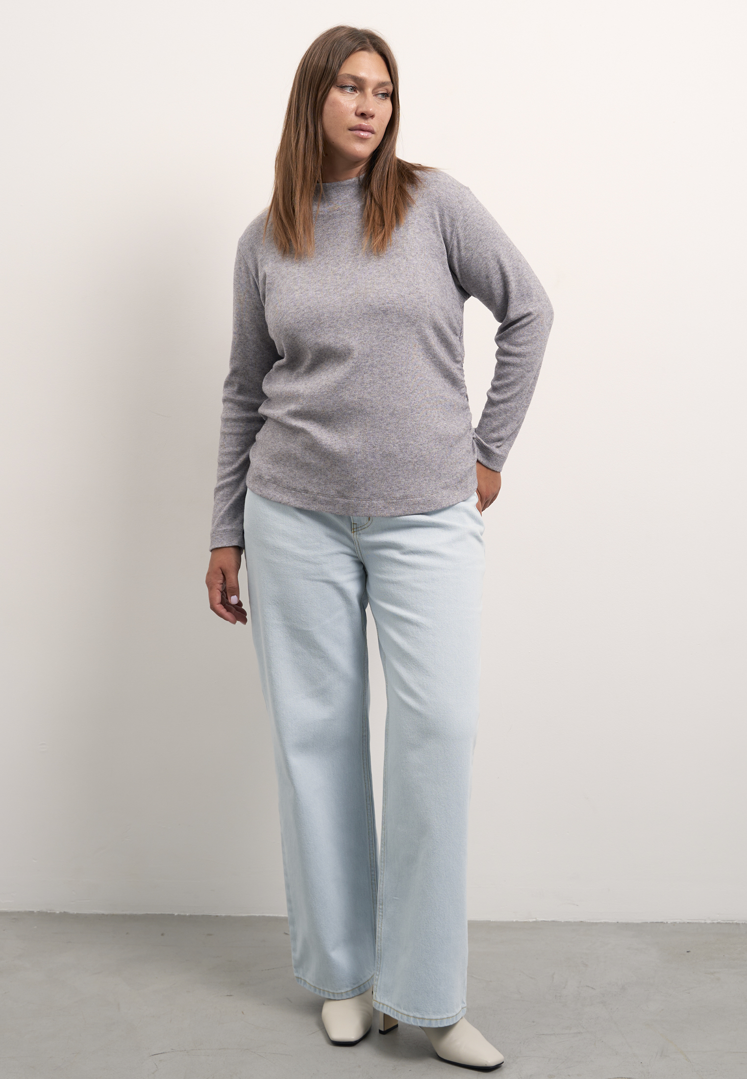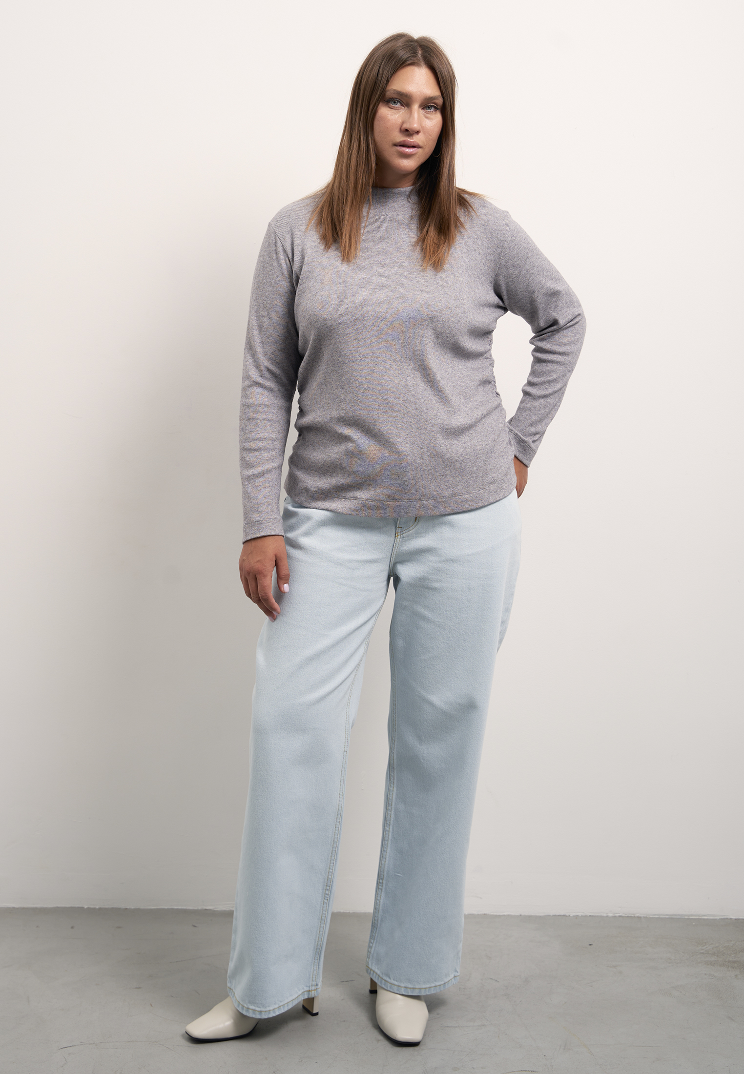 Блузон полуприлегающего силуэта, типа водолазки с невысокой стойкой. Рукава длинные. Боковые швы присобраны и образуют мягкие складки. Блузон выполнен из мягкого вязанного трикотажа с содержанием вискозы в сером и т. красном цветах.