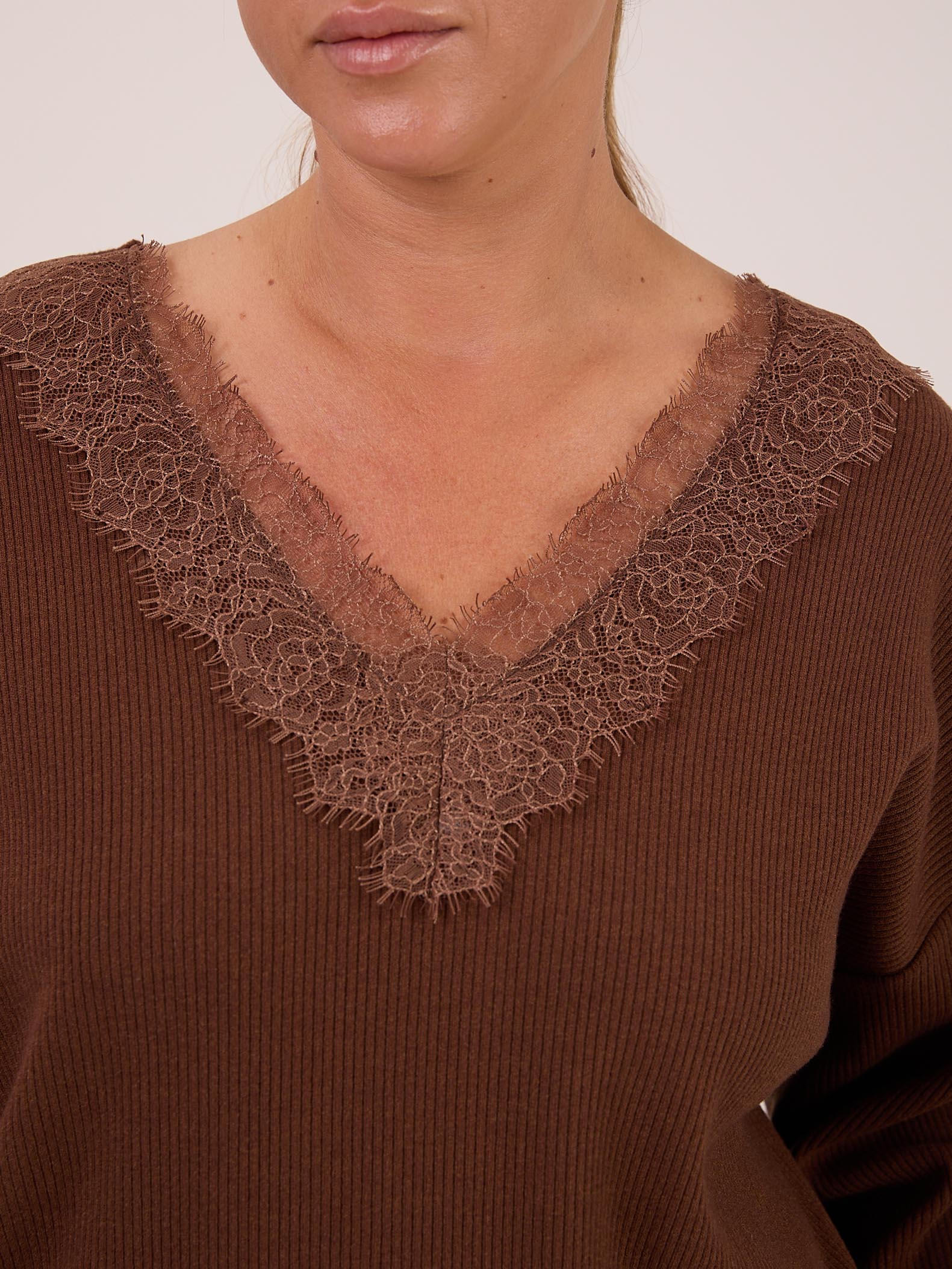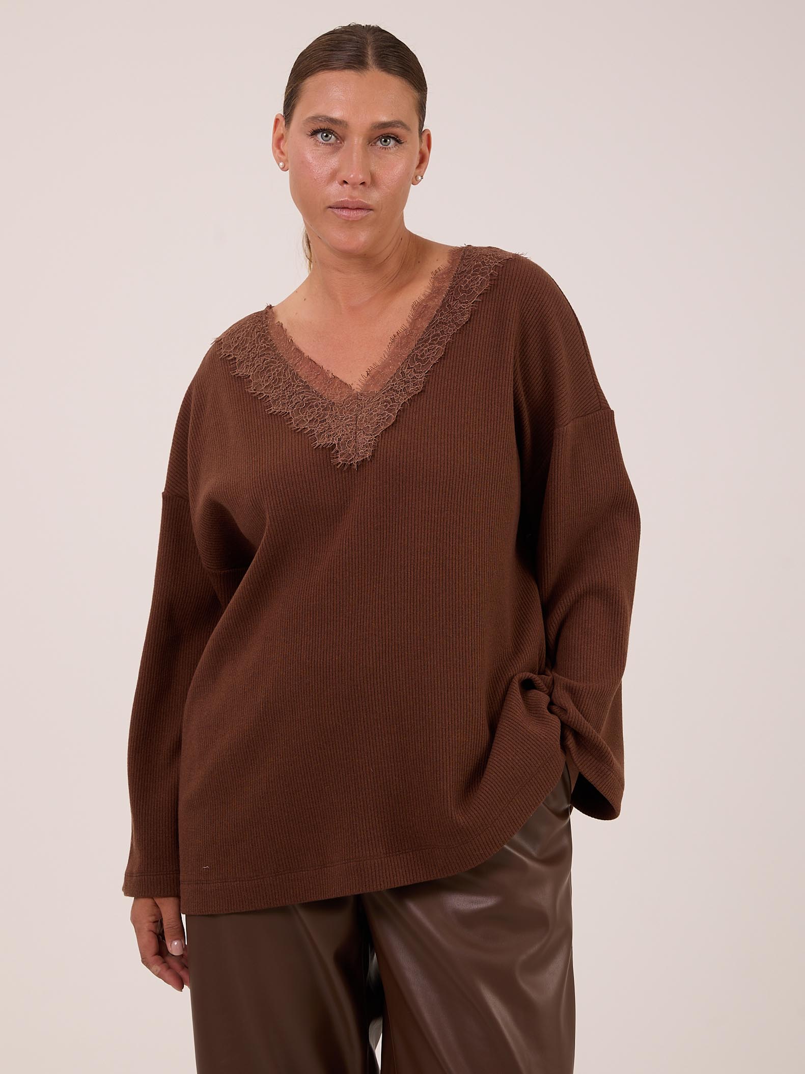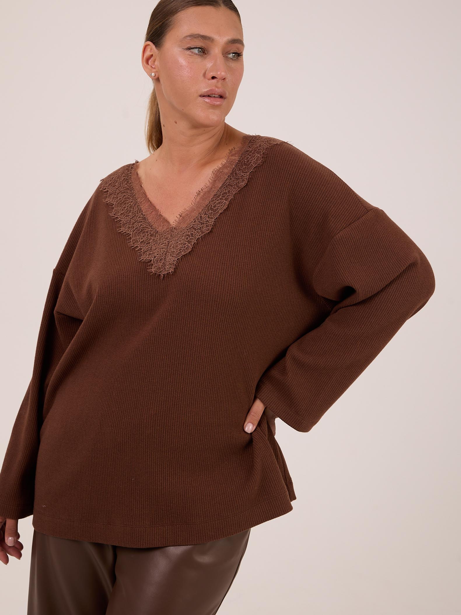 Трикотажный джемпер прямого силуэта со спущенным плечевым поясом. Рукава умеренно широкие. Горловина V-образная, отделана изящным кружевом. Джемпер выполнен из мягкого трикотажа с высоким содержанием вискозы. Цвета молочный и коричневый.