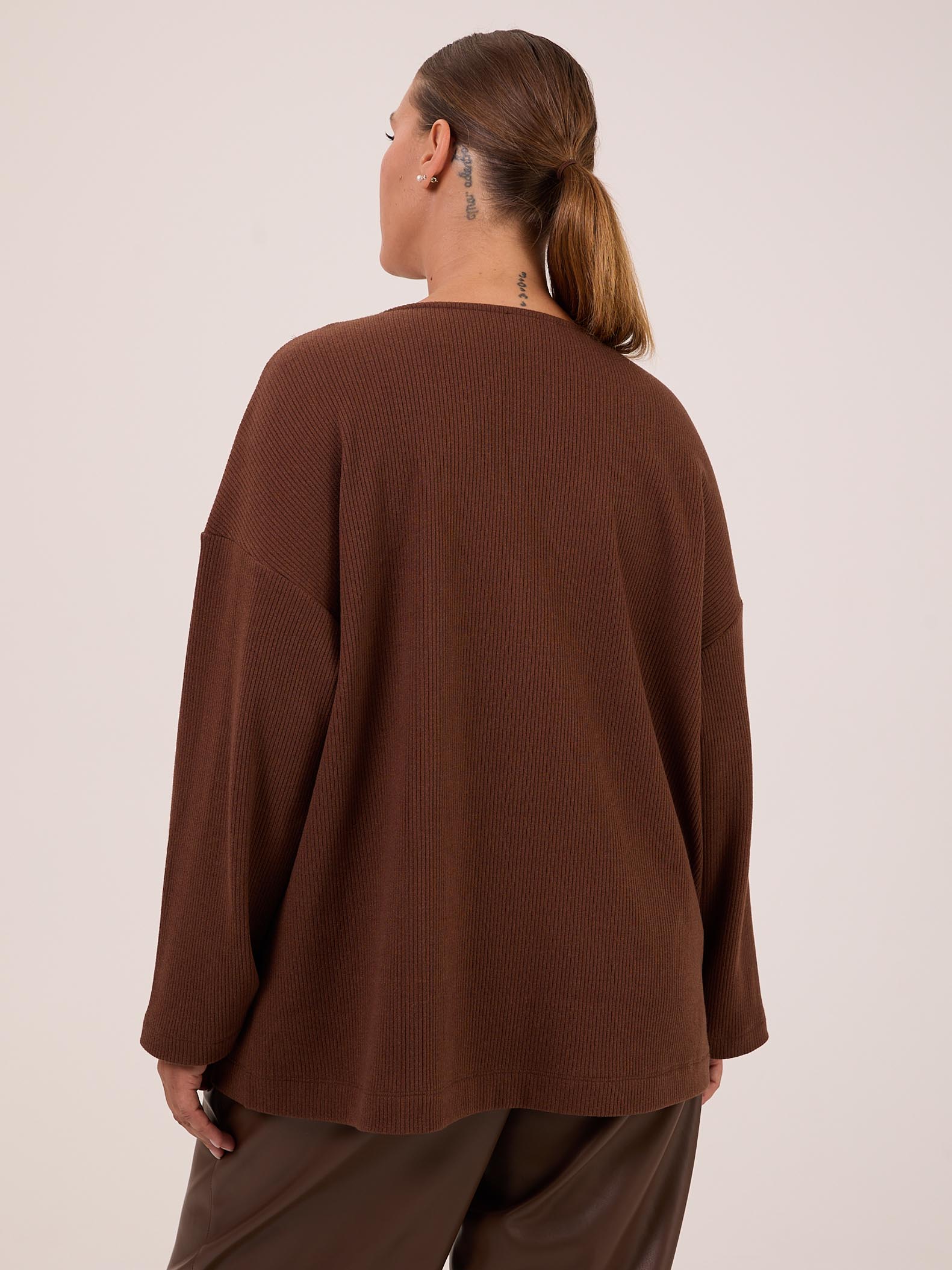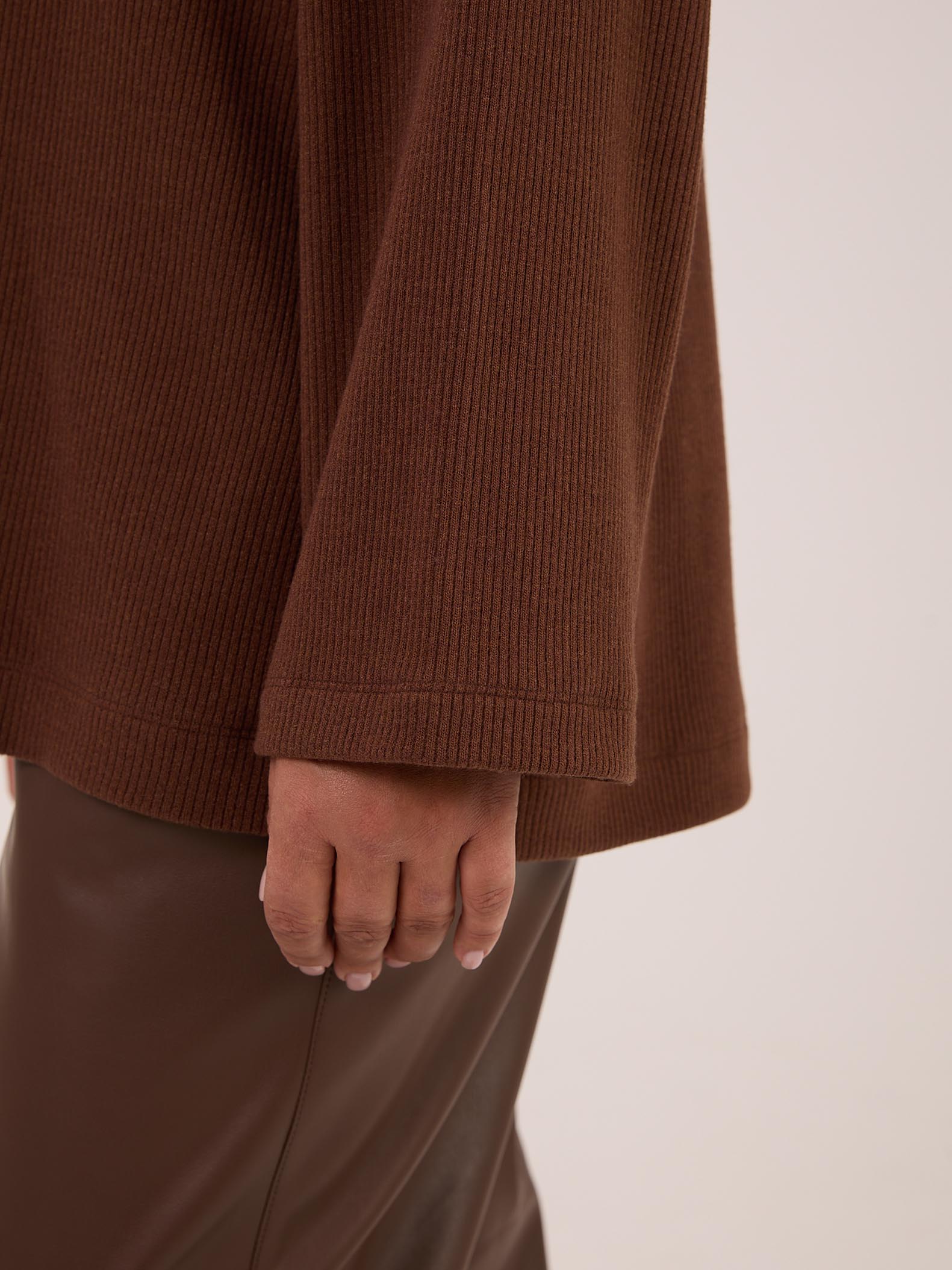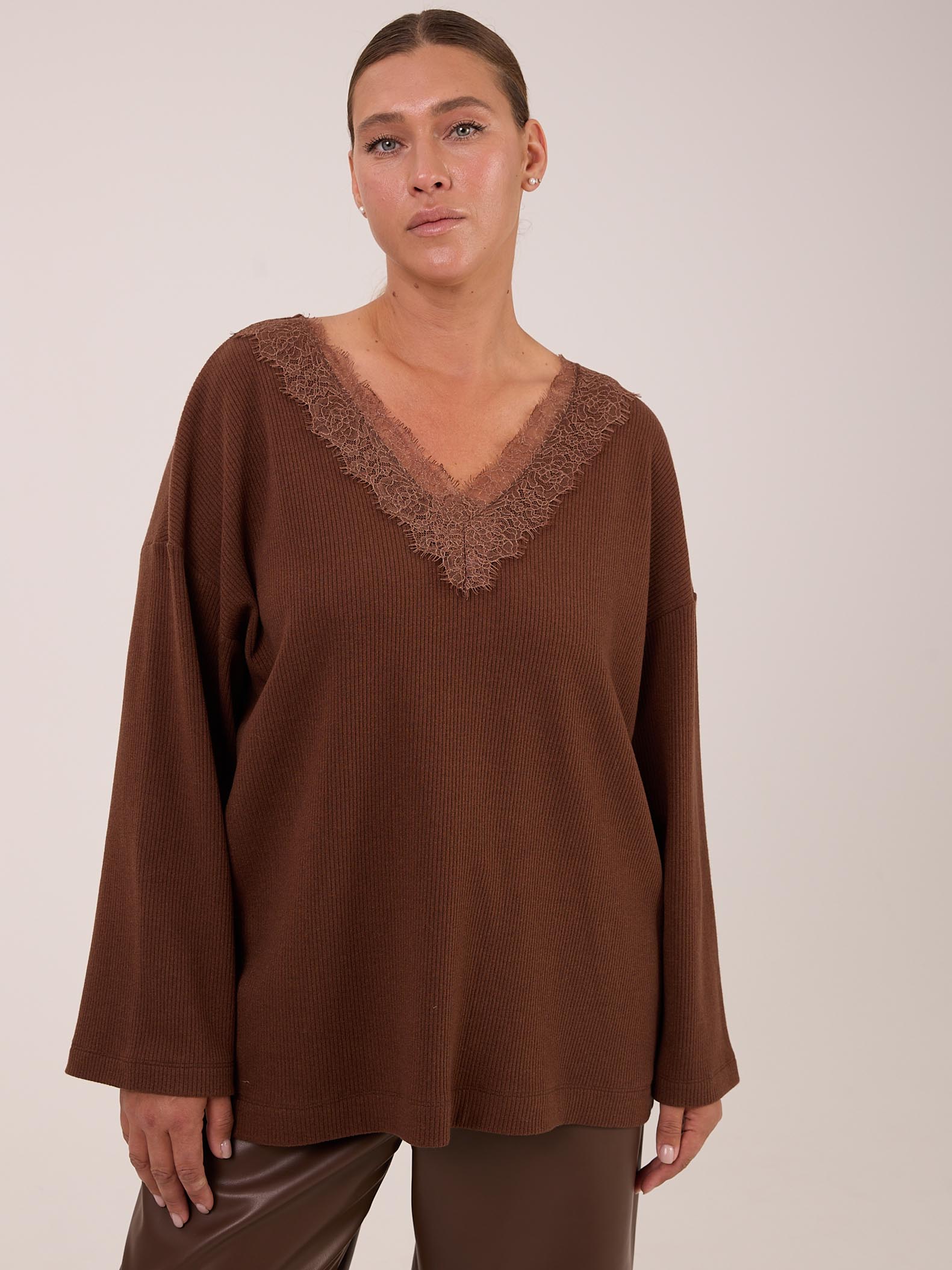 Трикотажный джемпер прямого силуэта со спущенным плечевым поясом. Рукава умеренно широкие. Горловина V-образная, отделана изящным кружевом. Джемпер выполнен из мягкого трикотажа с высоким содержанием вискозы. Цвета молочный и коричневый.
