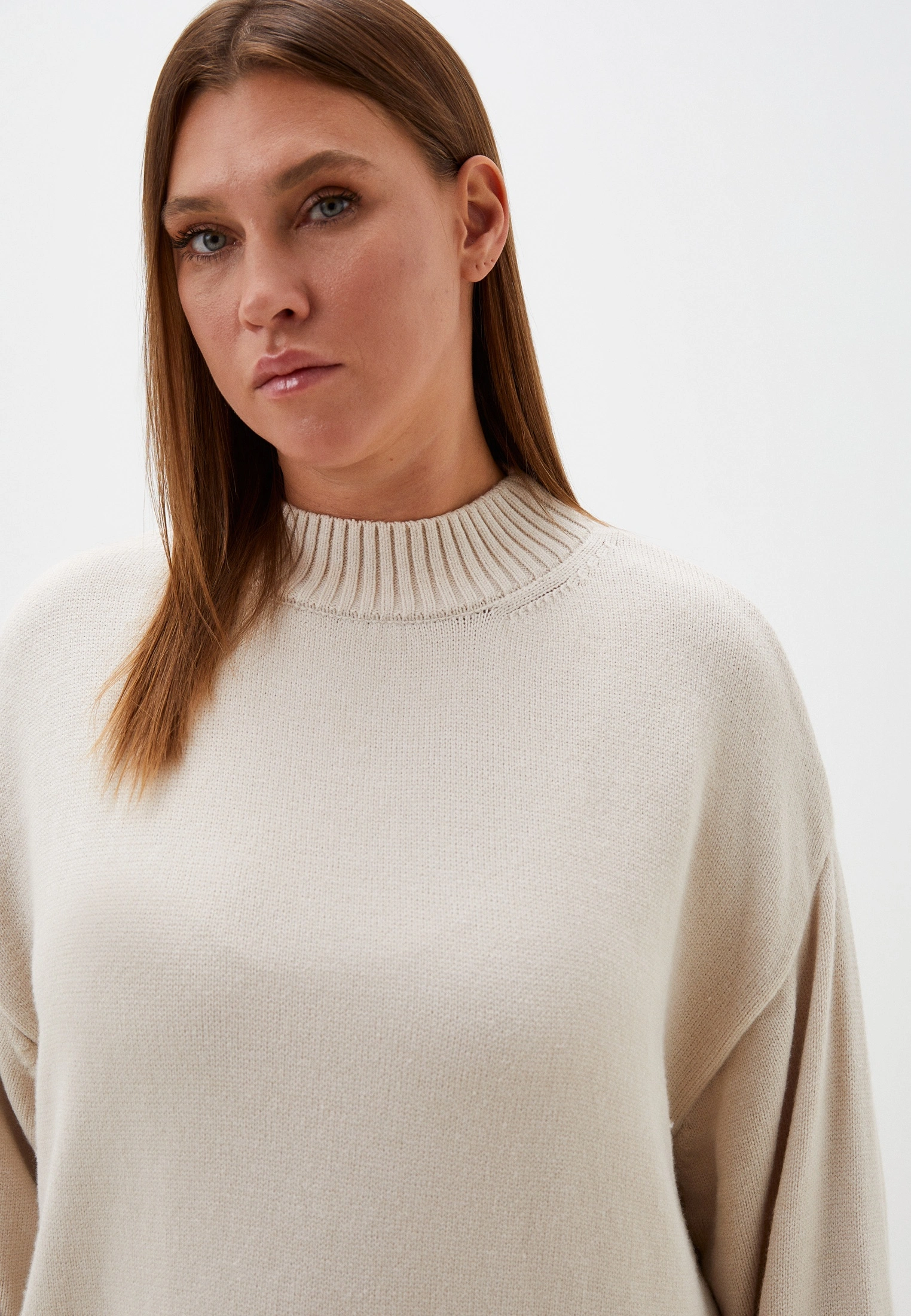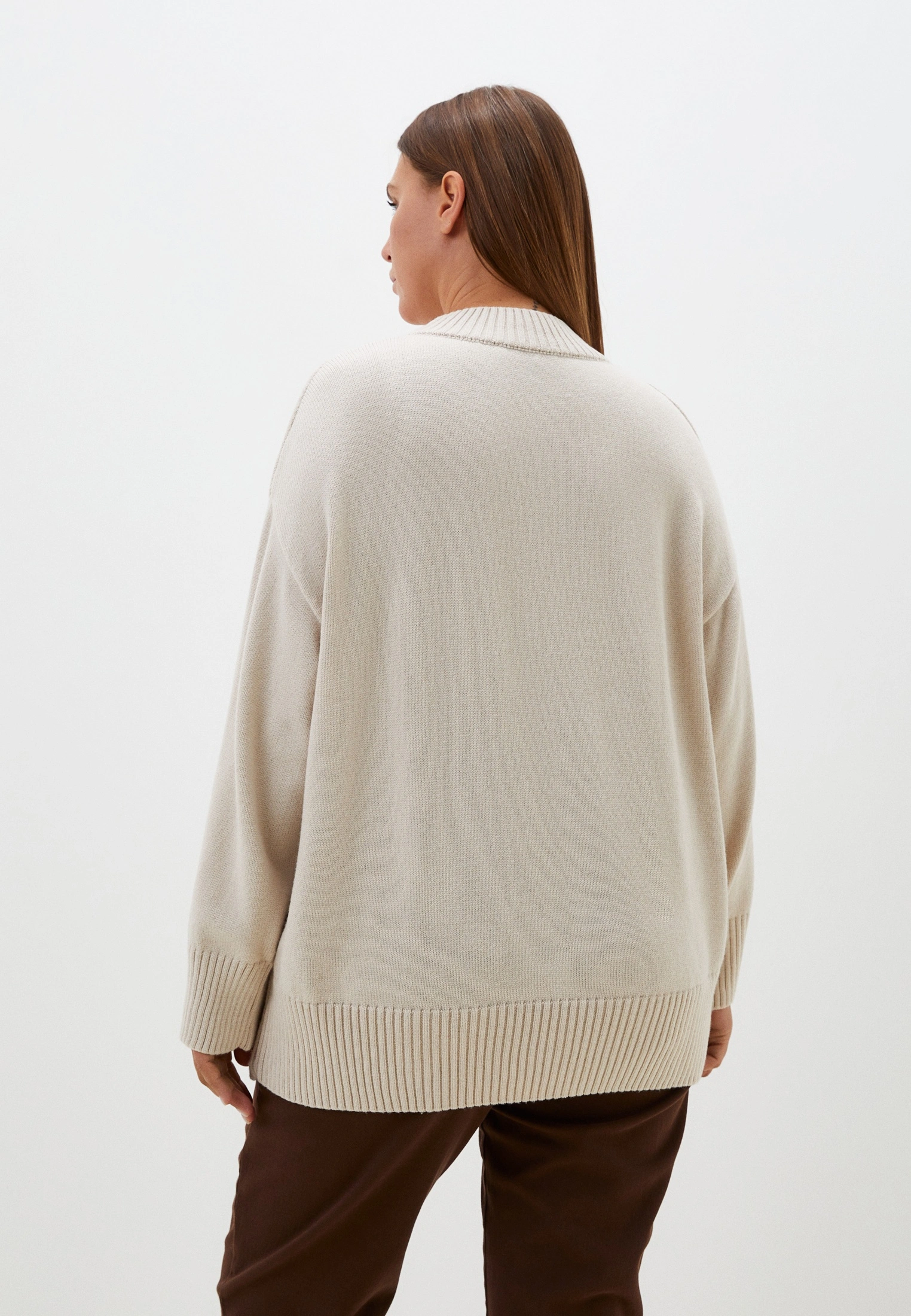Вязаный джемпер прямого силуэта с широкой эластичной стойкой. Плечевой пояс спущенный. Рукава с широкими подвязанными манжетами. Длина джемпера чуть ниже линии бедер. Внизу изделия - широкий эластичный пояс. Выполнена модель из мягкой вискозосодержащей пряжи.