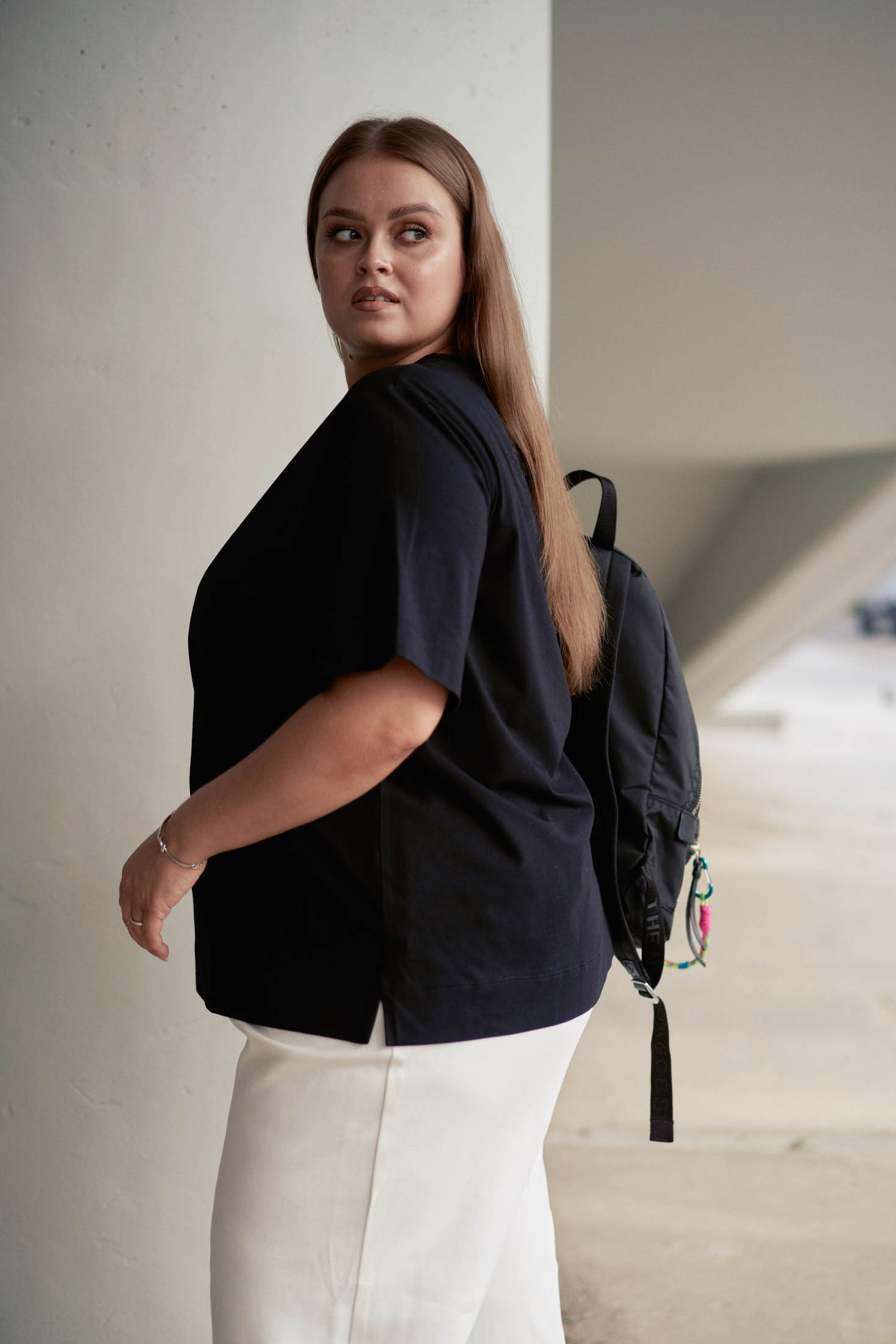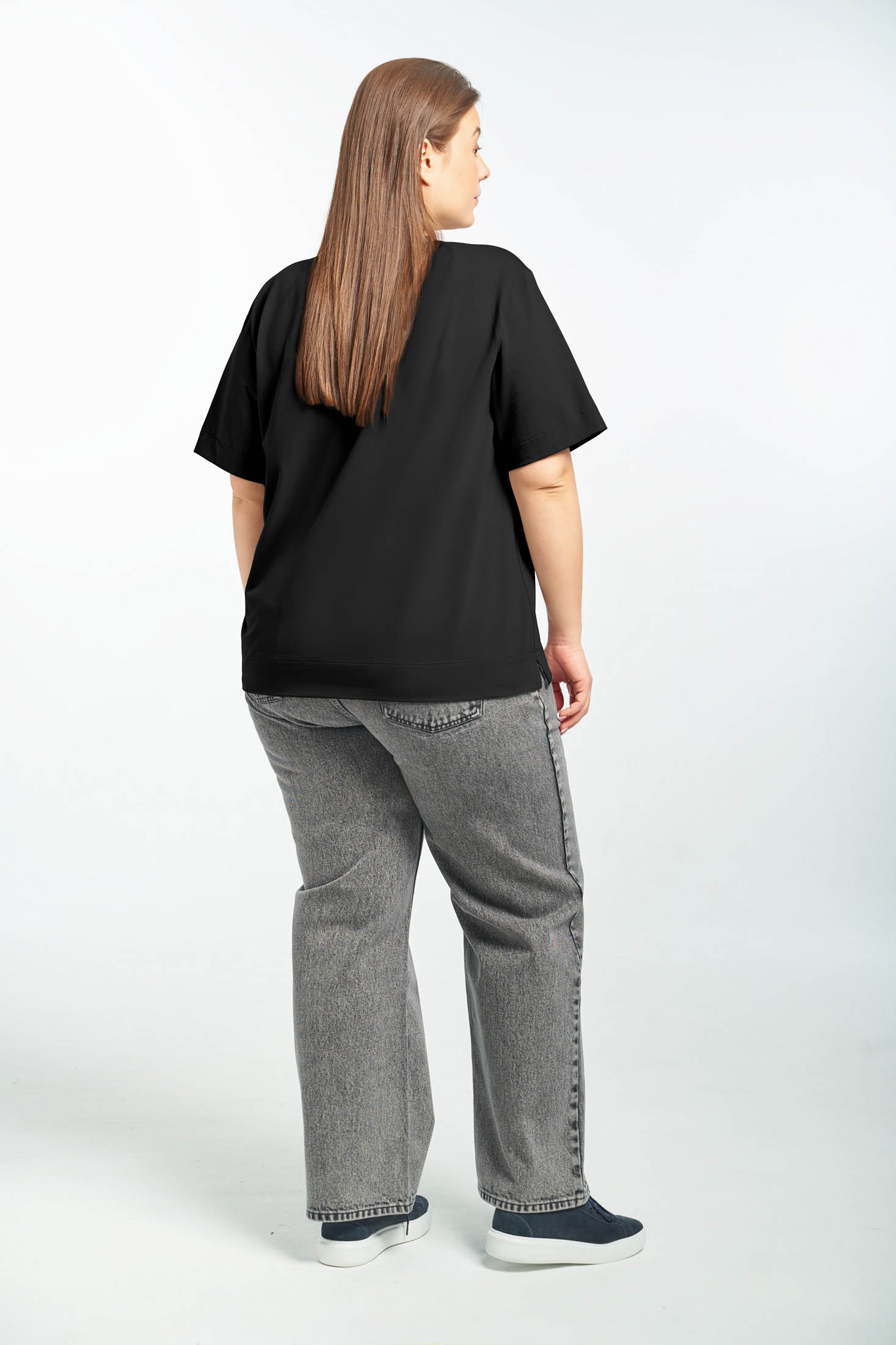 Блузон типа Т-shirt прямого силуэта, длиной до бедер. Рукава короткие прямые, вырез горловины круглый. В боковых швах небольшие разрезы. Рукава и низ изделия имеют широкую эффектную подгибку.