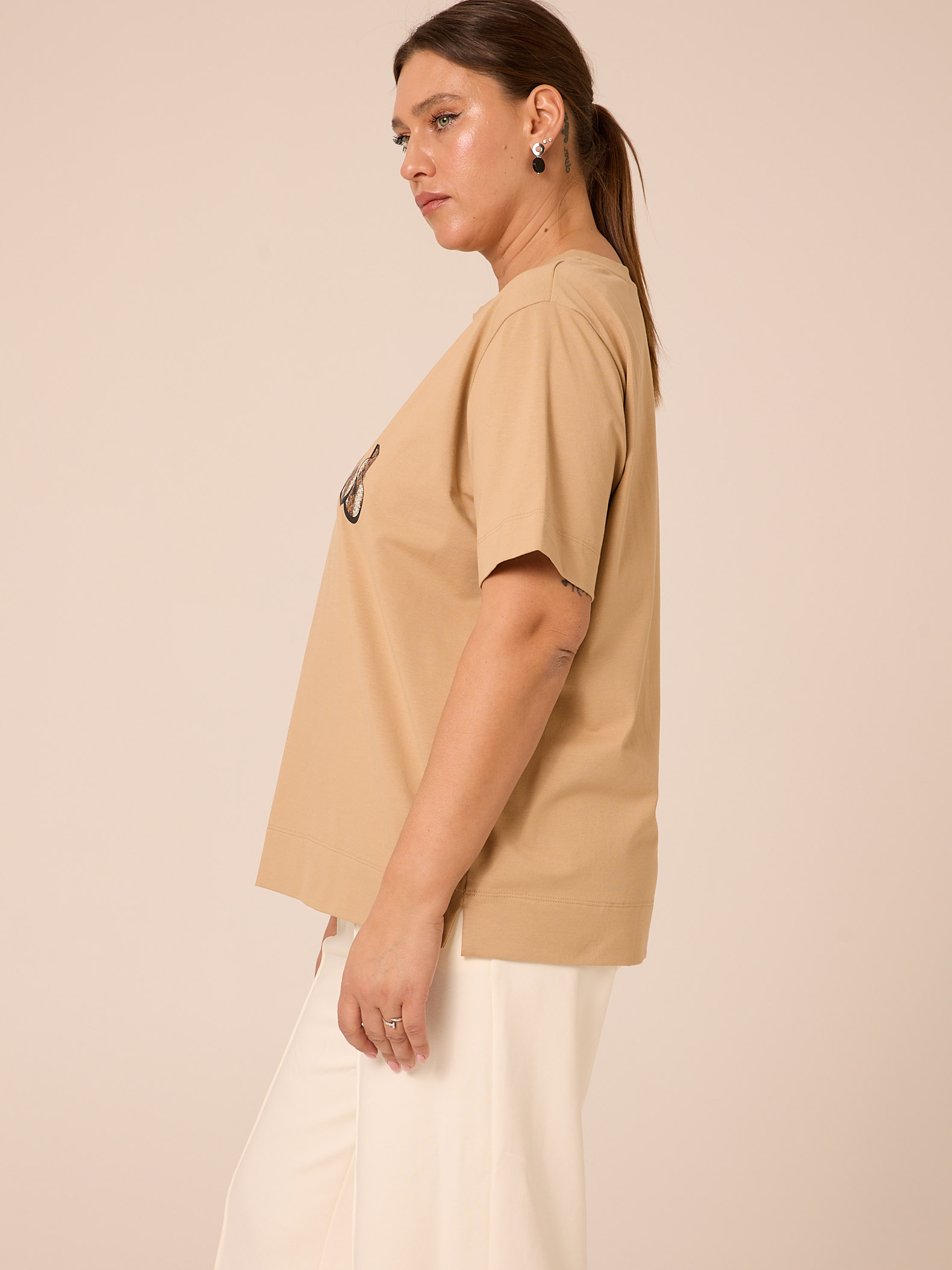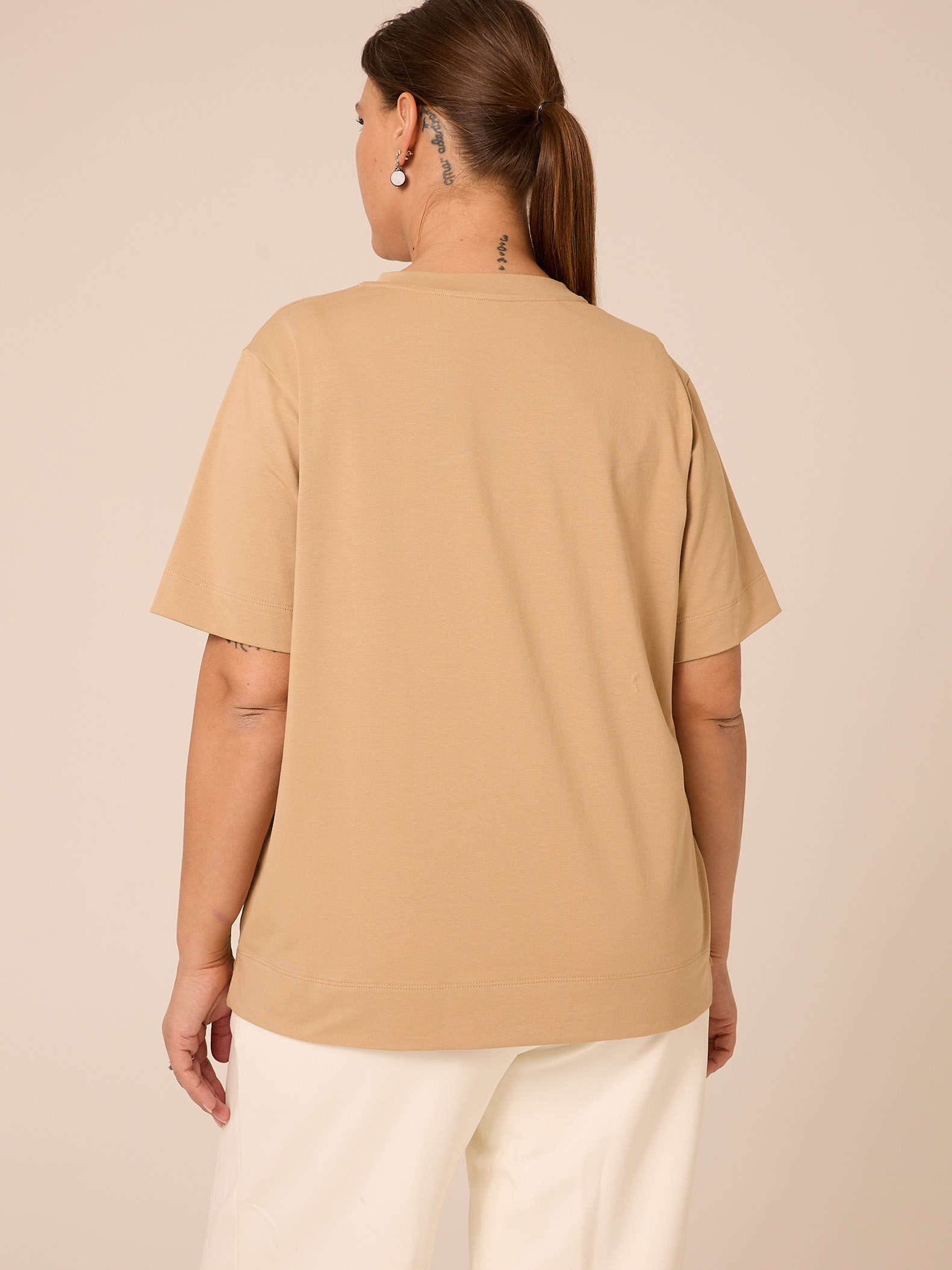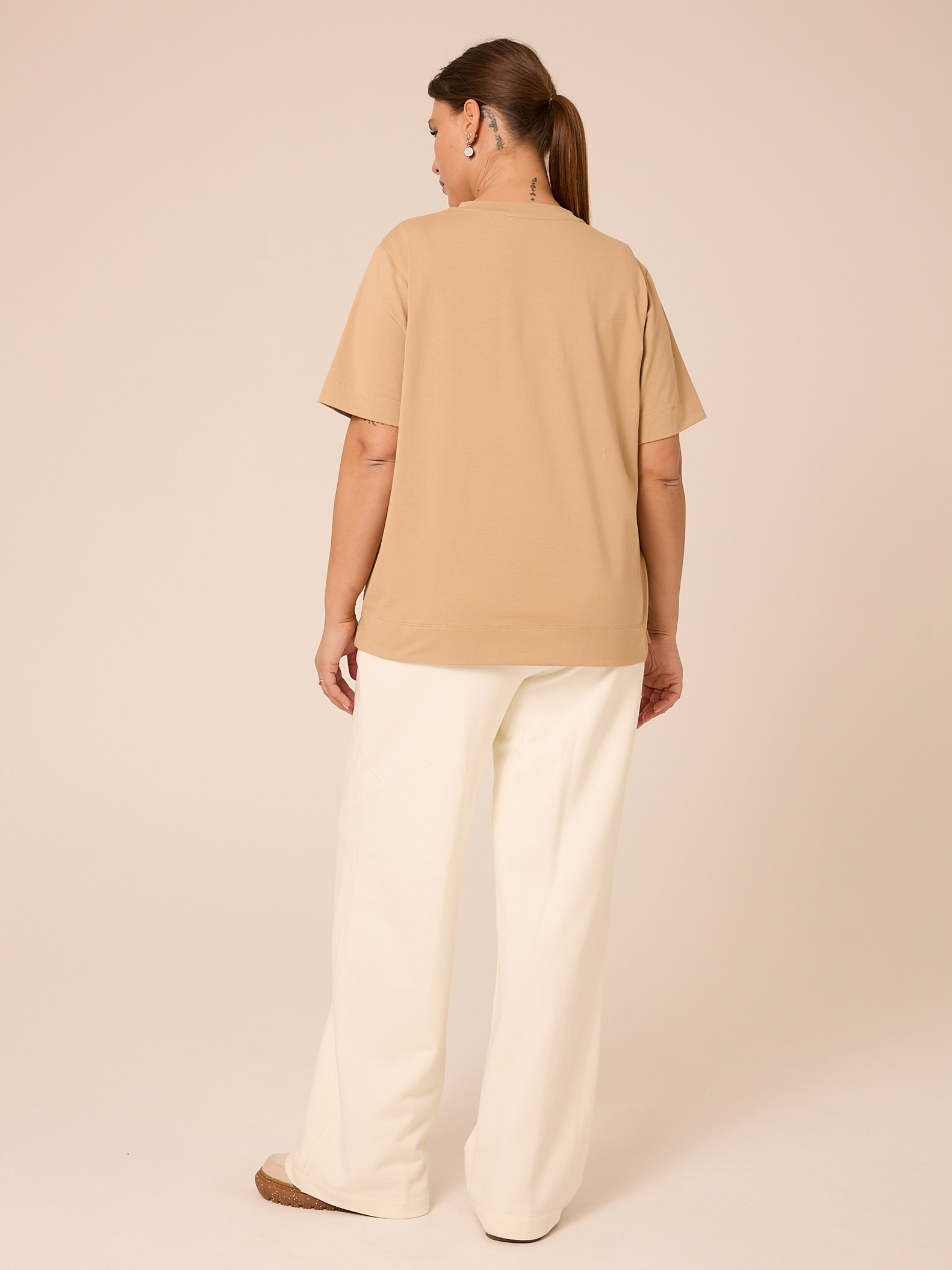 прямого силуэта, длиной до бедер. Рукава короткие прямые, вырез горловины круглый. В боковых швах небольшие разрезы. Рукава и низ изделия имеют широкую эффектную подгибку. Принт термопленка.