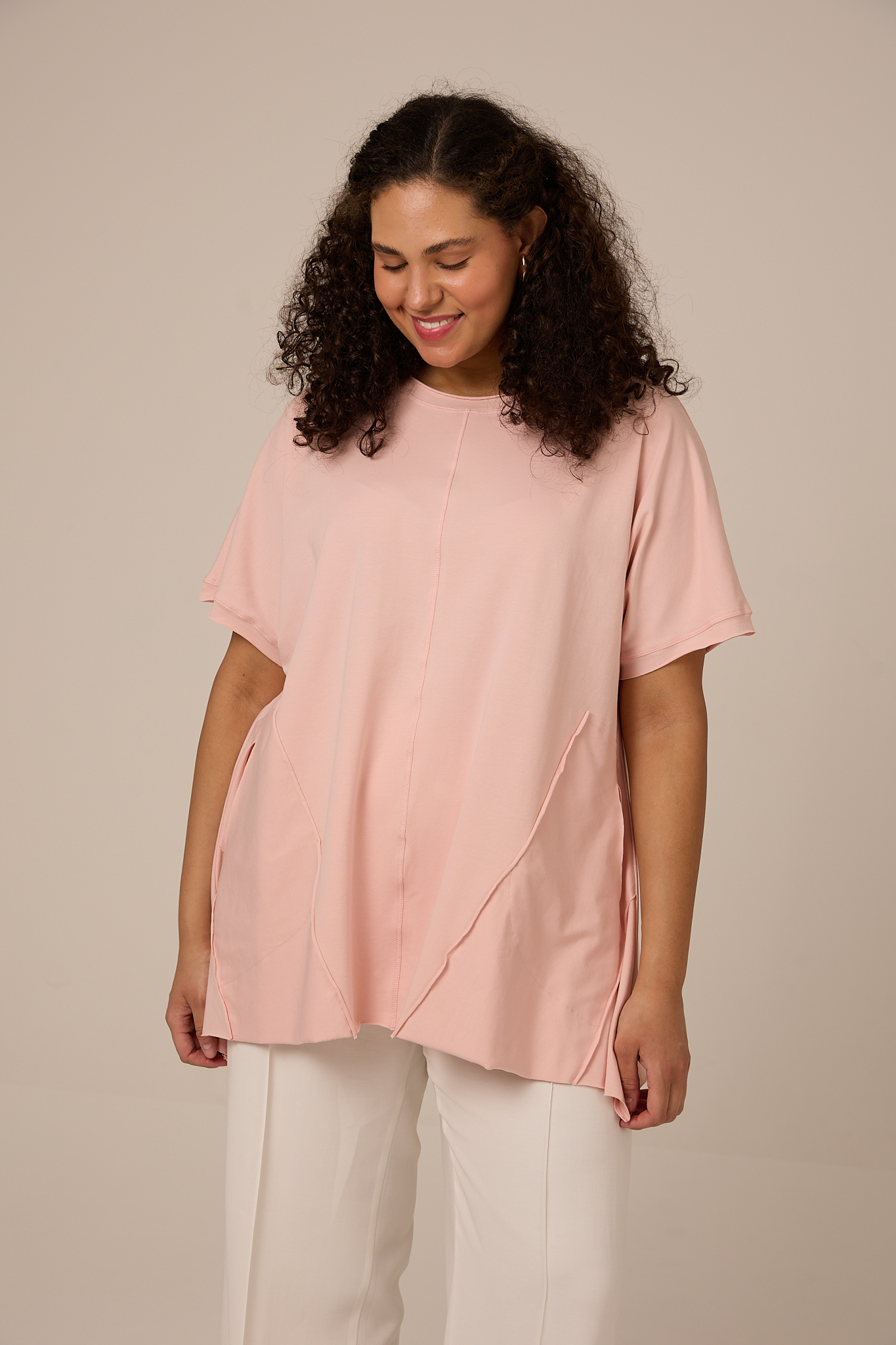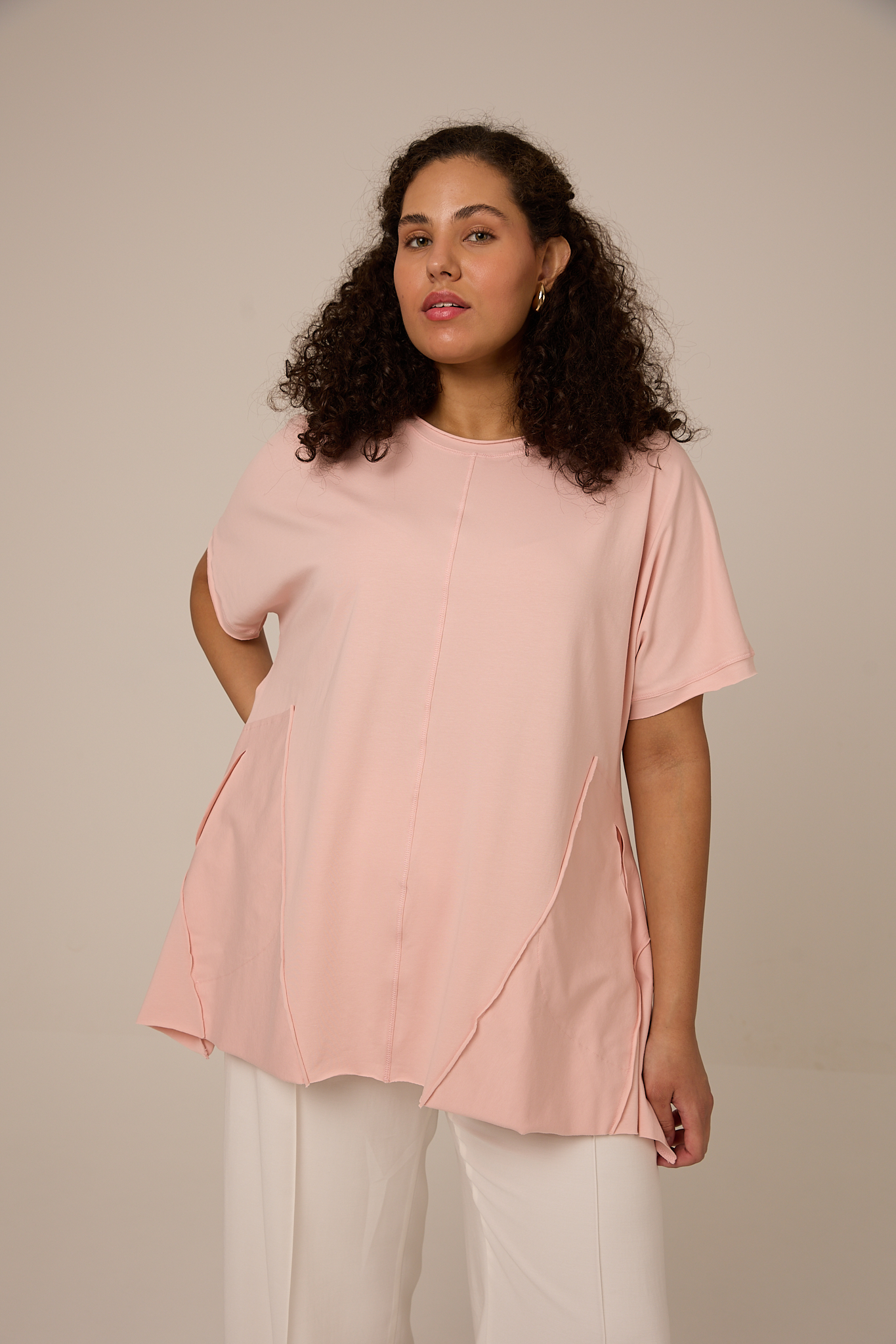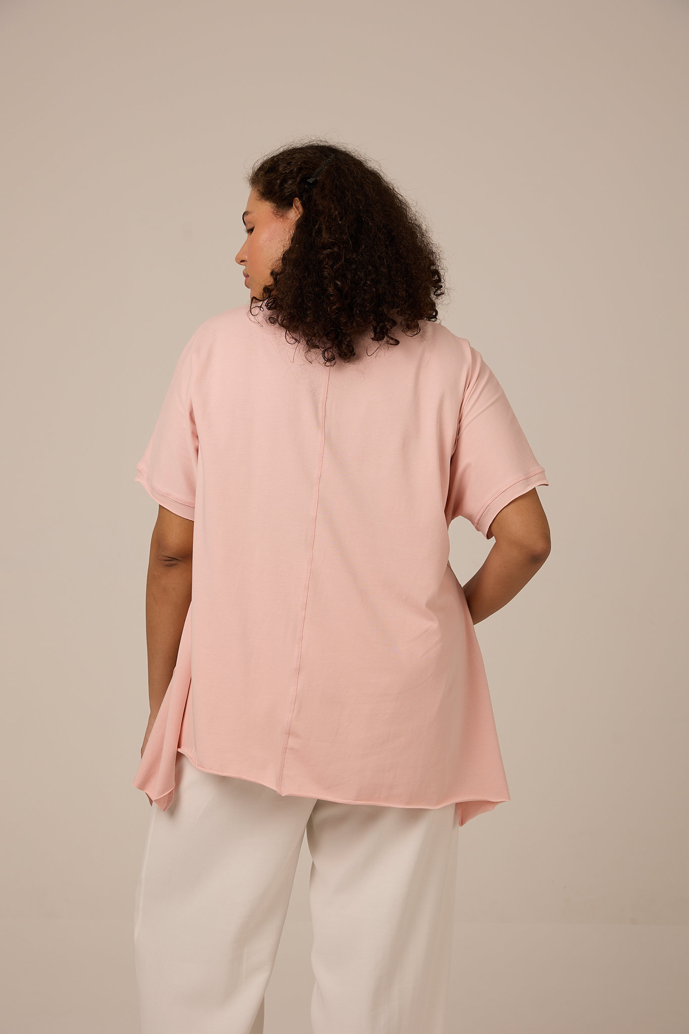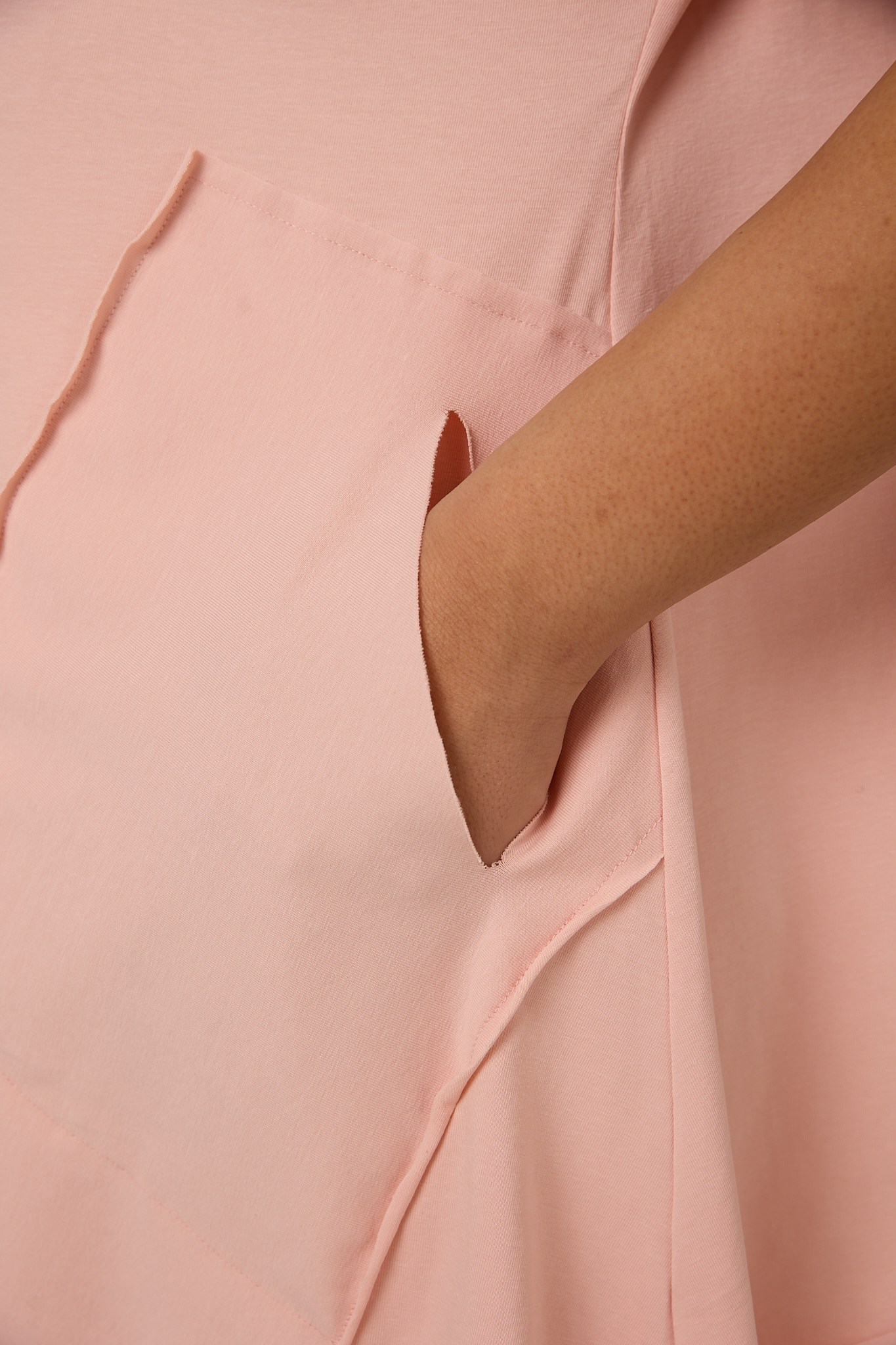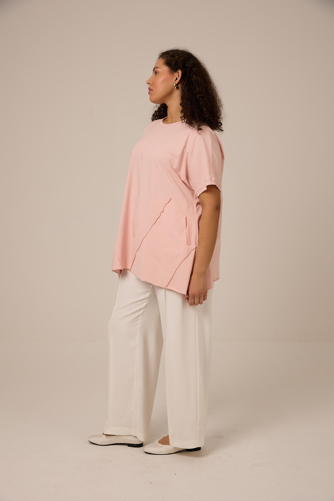 Блузон свободного кроя со спущенным коротким рукавом. Силуэт А-образный. Широкая круглая горловина обработана обтачкой с открытым срезом. На полочке выполнены накладные карманы. Особенностью блузона являются необработанные края деталей и изделия в целом. Изготовлено из мягкого хлопкового трикотажа (кулирки).