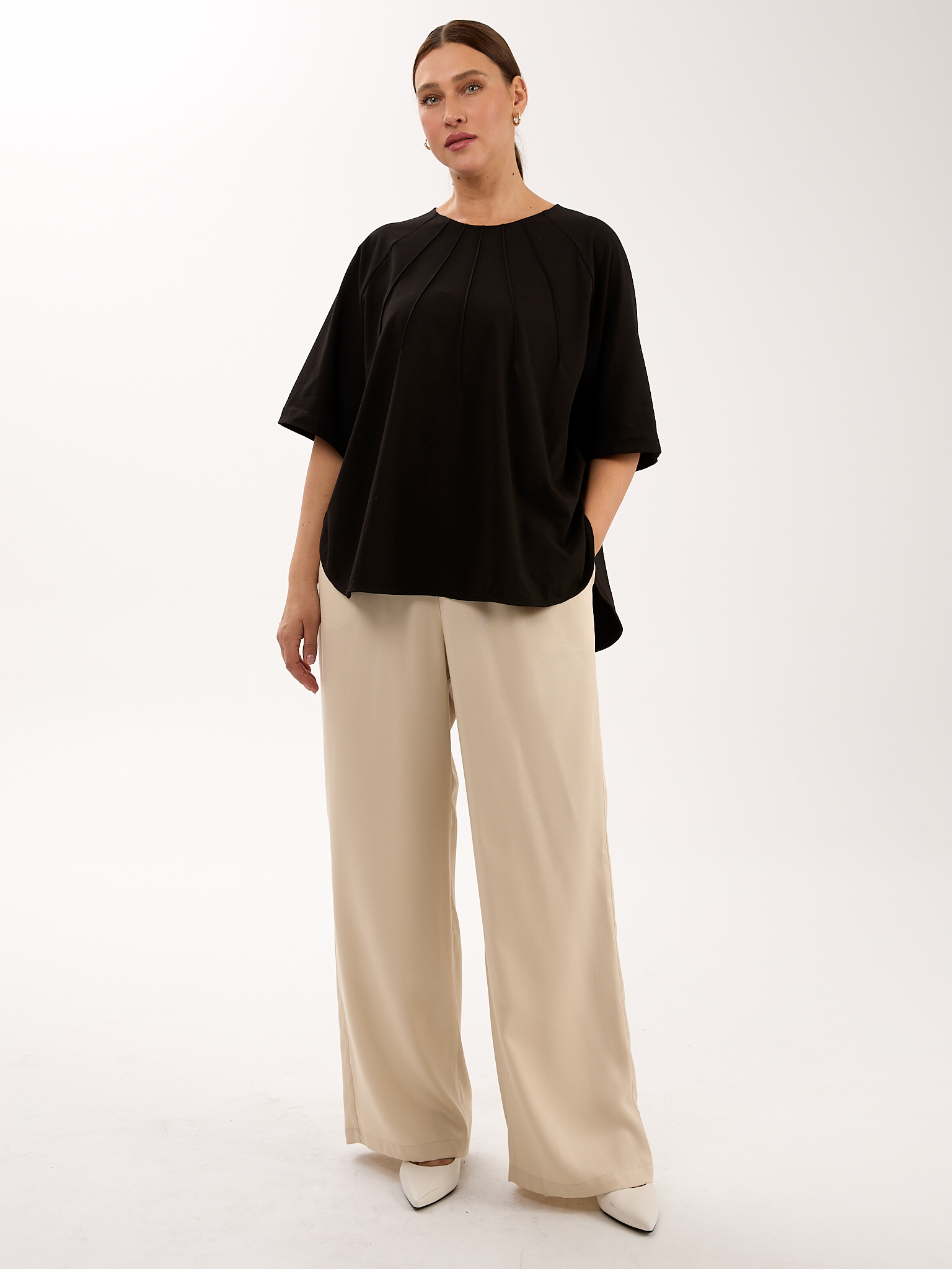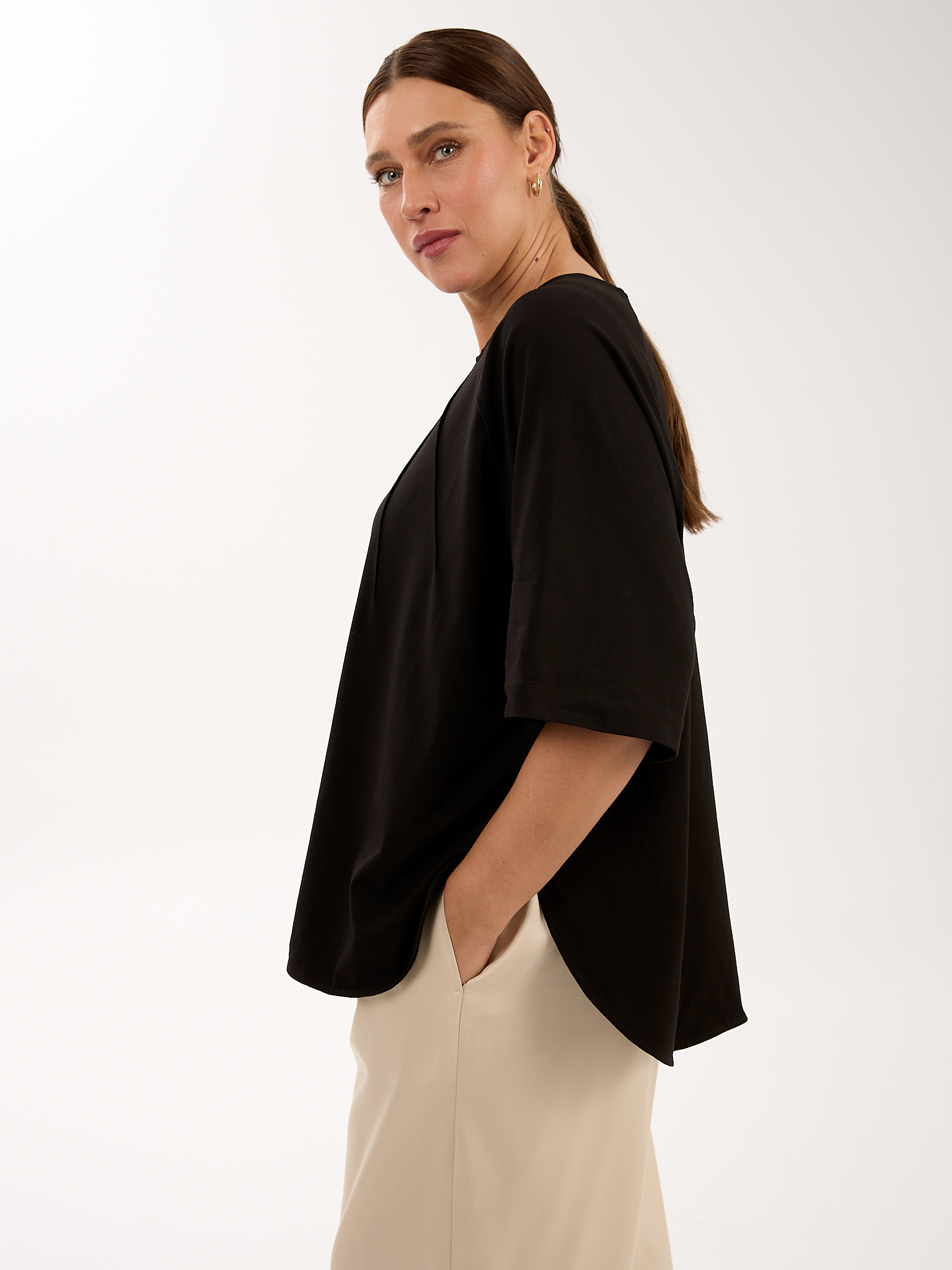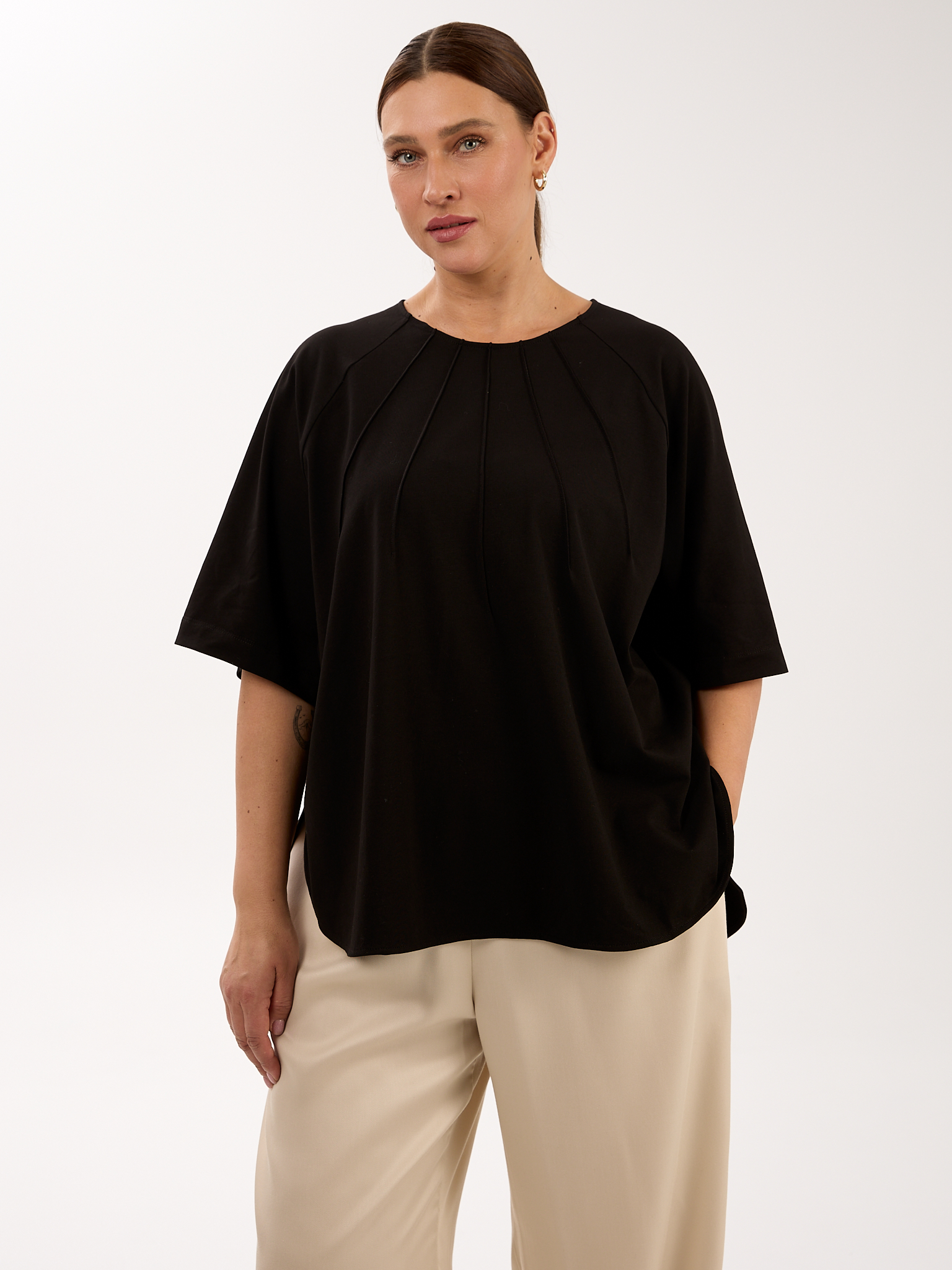 Объемный блузон прямого кроя. Вырез горловины круглый. Рукава – реглан, широкие, длиной до локтя. В боковых швах глубокие закругленные разрезы. Блузон выполнен из эластичного хлопкового трикотажа