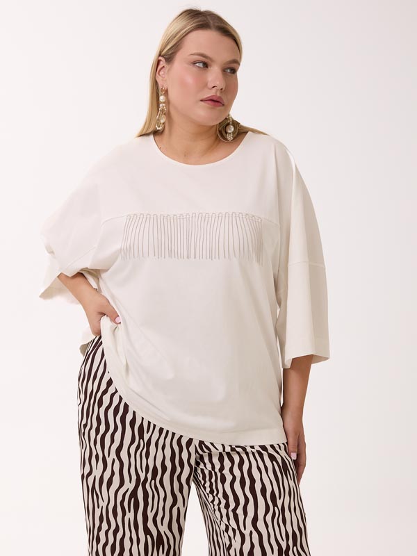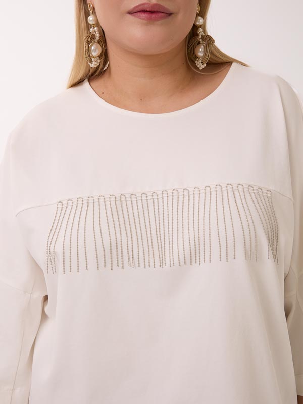 бахромы из металлической цепочки. Блузон выполнен из эластичного