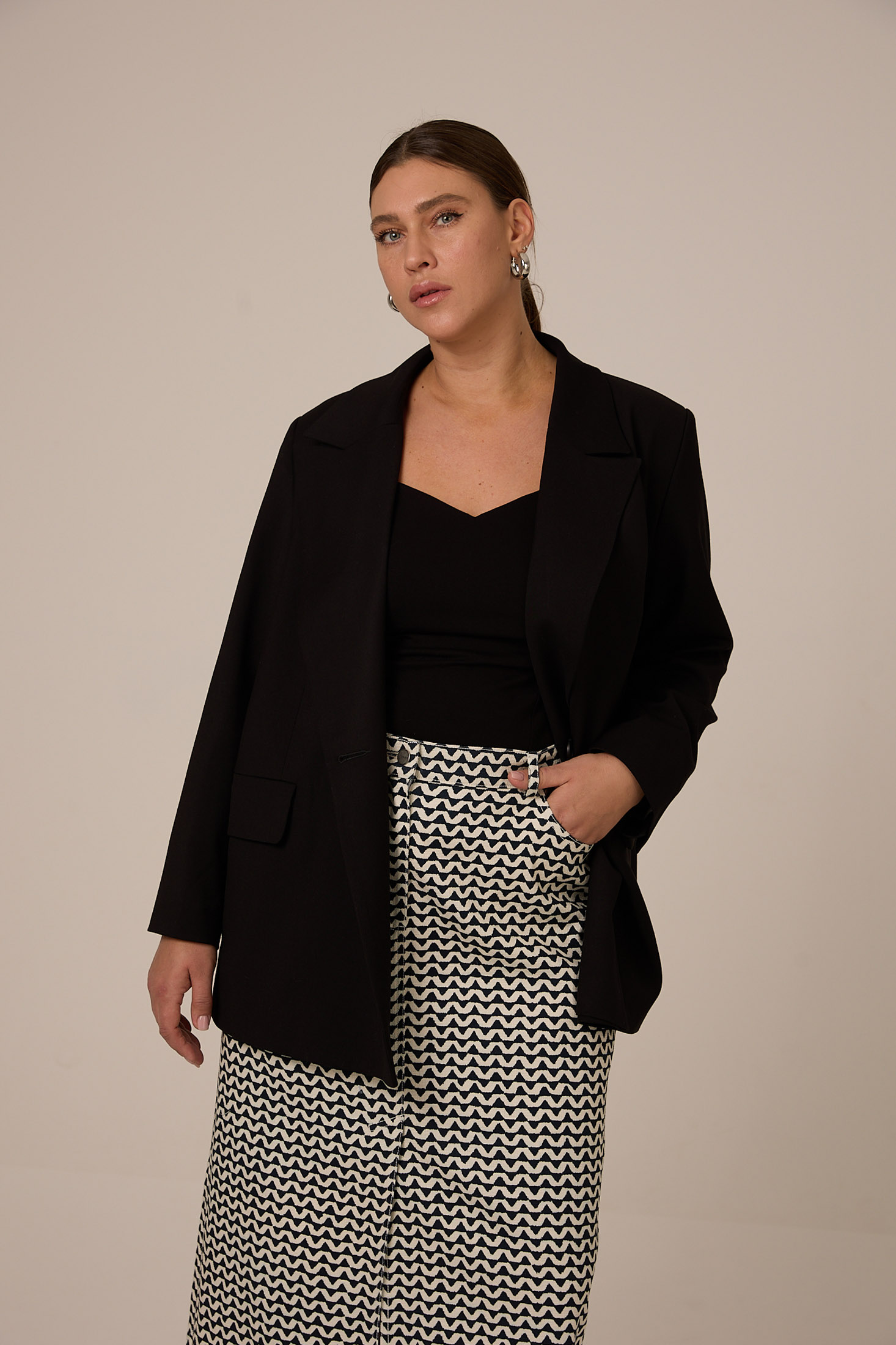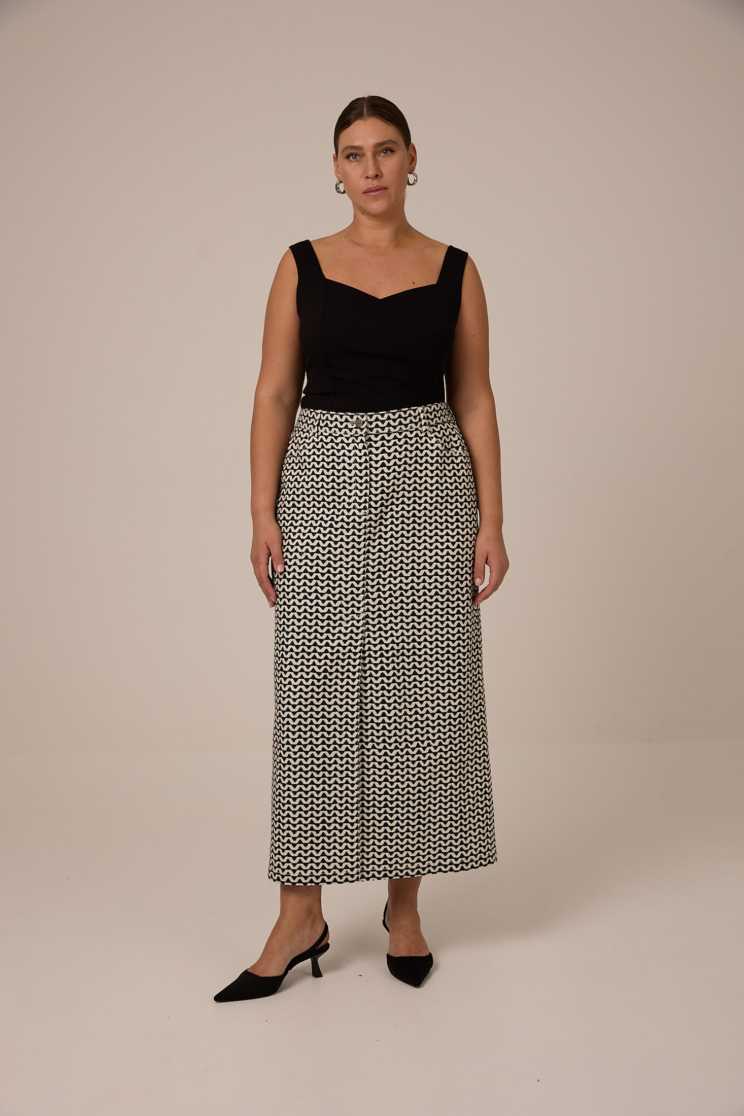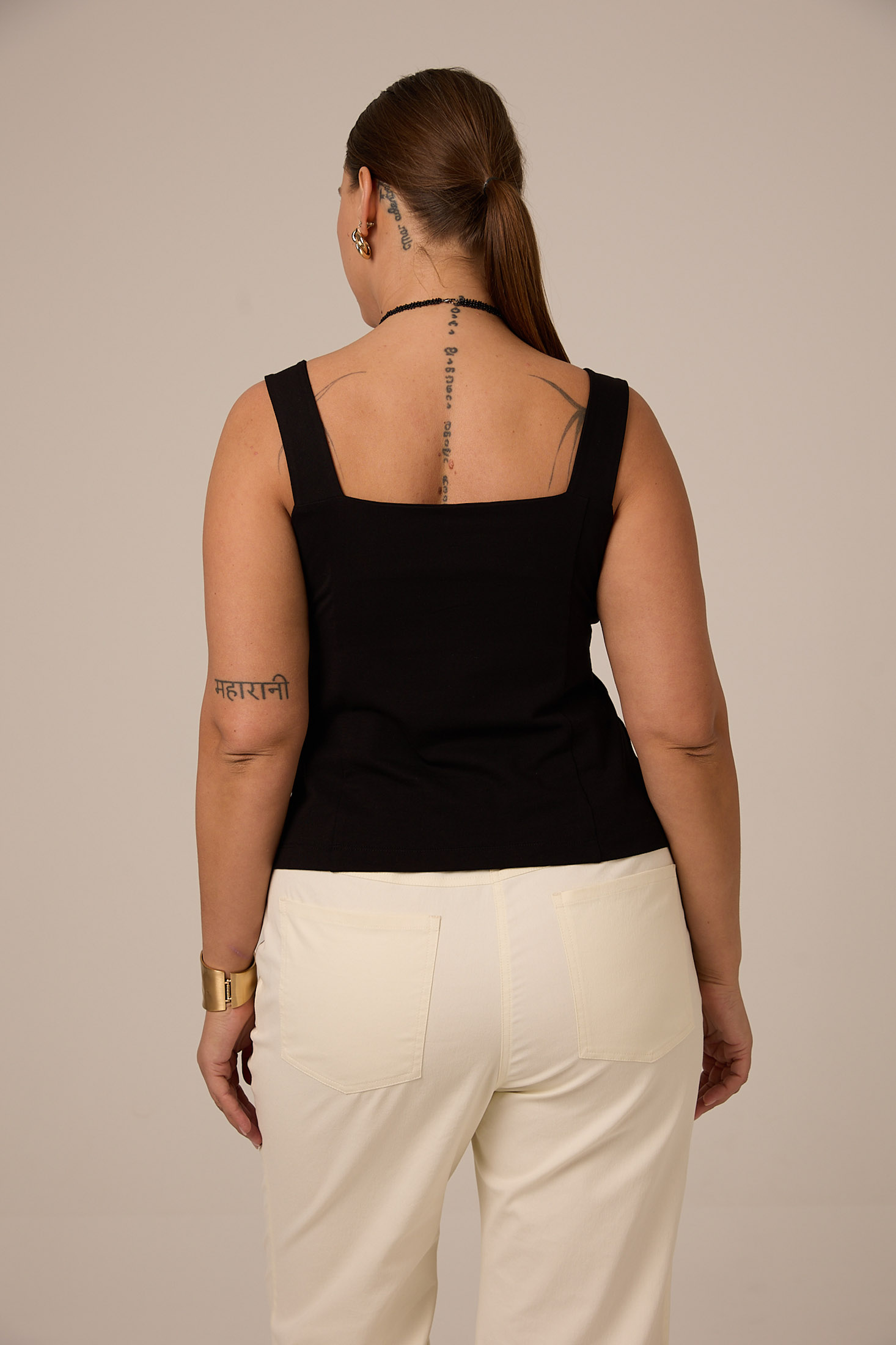 Облегающий, приталенный топ с фигурным вырезом на широких лямках. Выполнен из хлопкового трикотажа в двух цветах черном и молочном.