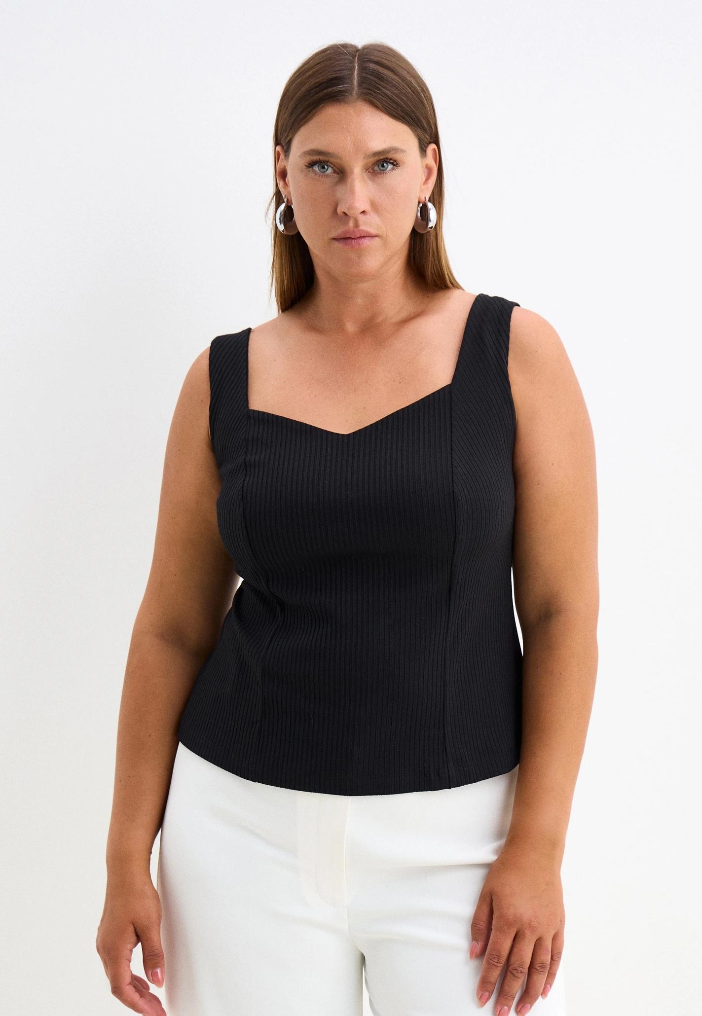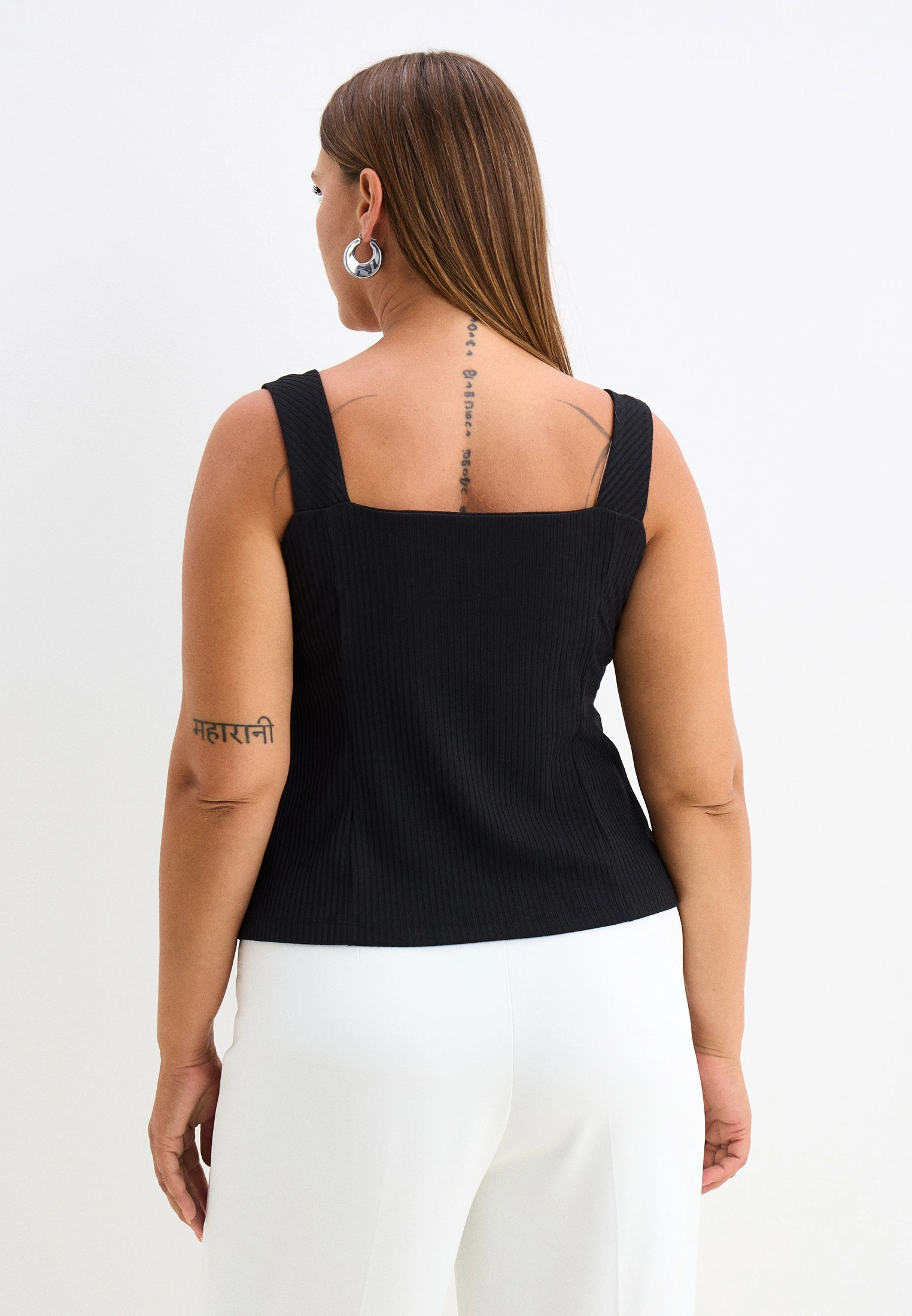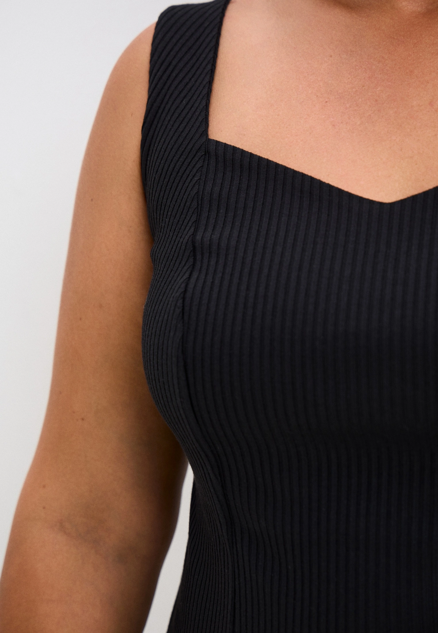Облегающий, приталенный топ с фигурным вырезом на широких лямках. Выполнен из хлопкового трикотажа в двух цветах черном и молочном.