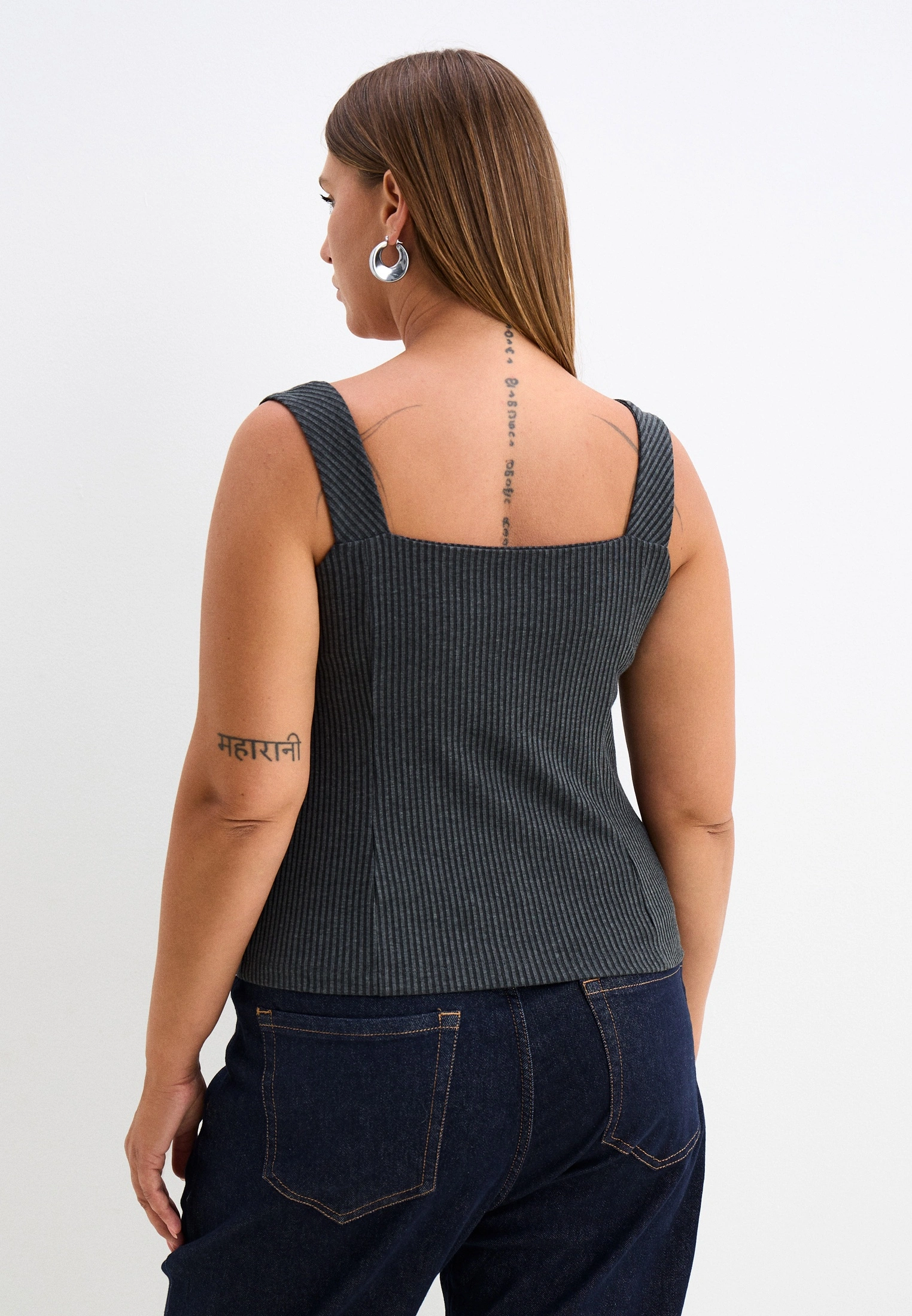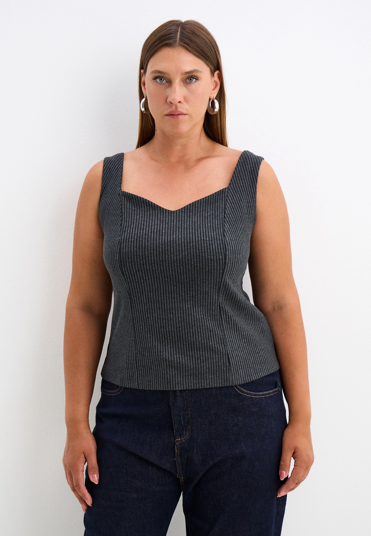 Облегающий, приталенный топ с фигурным вырезом на широких лямках. Выполнен из хлопкового трикотажа в двух цветах черном и молочном.