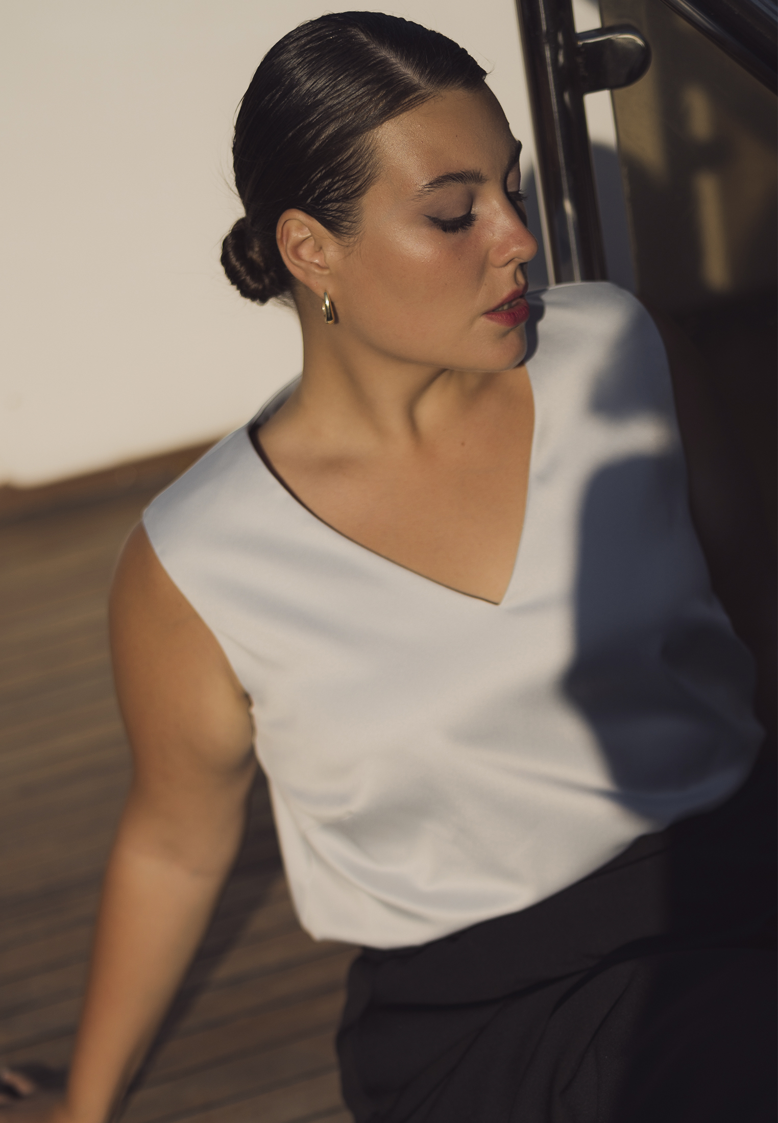 Топ прямого силуэта без рукавов. Вырез горловины V-образный. Длина до бедер. Выполнен из вискозосодержащего атласа в черном и св. сером цвете.