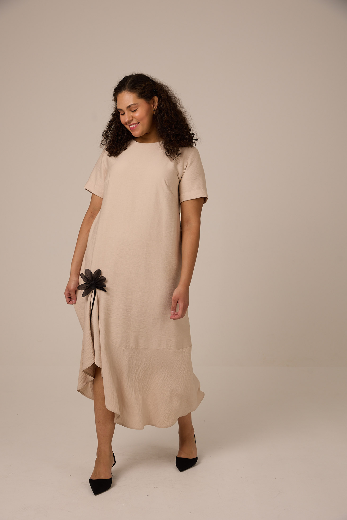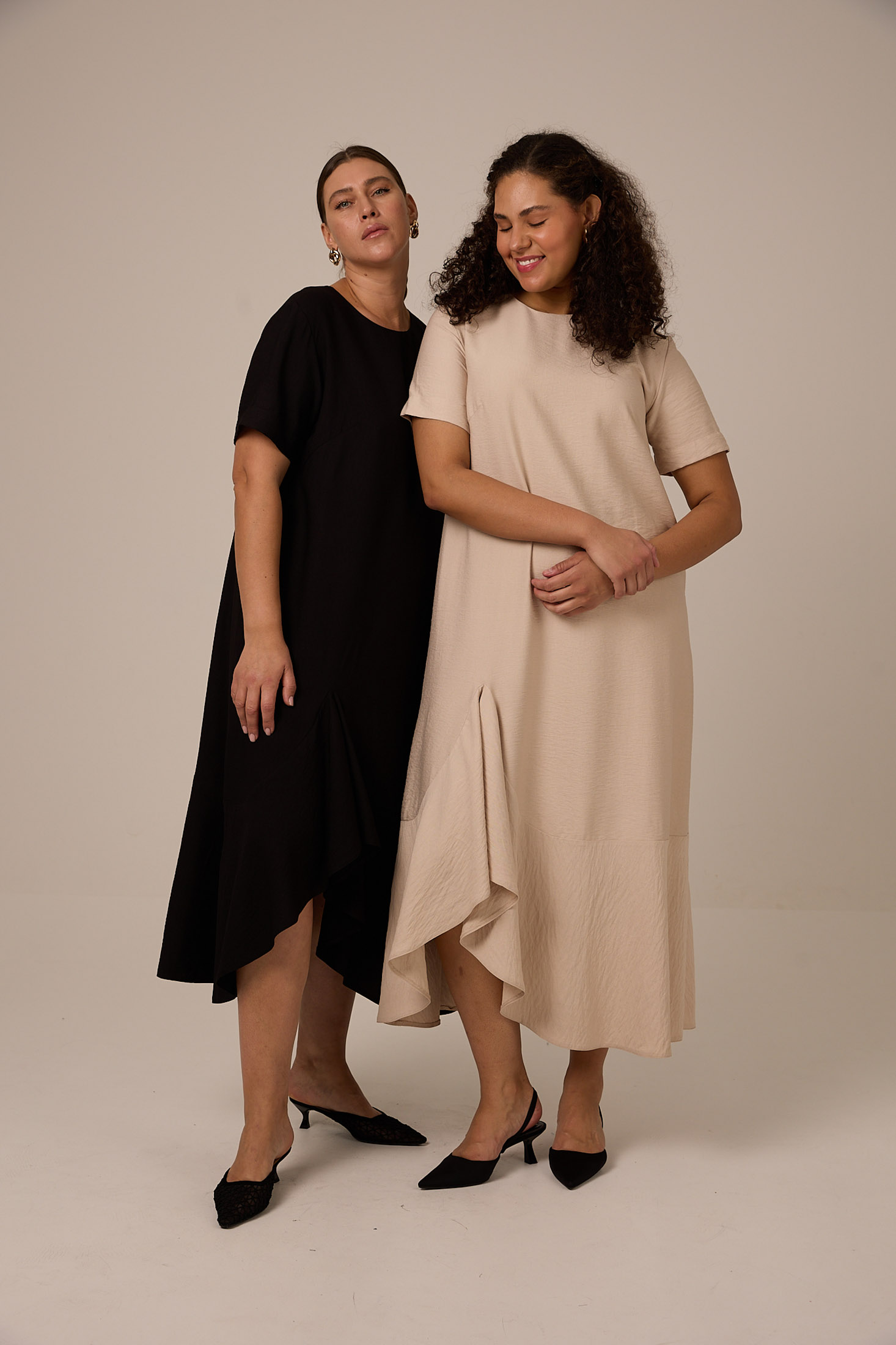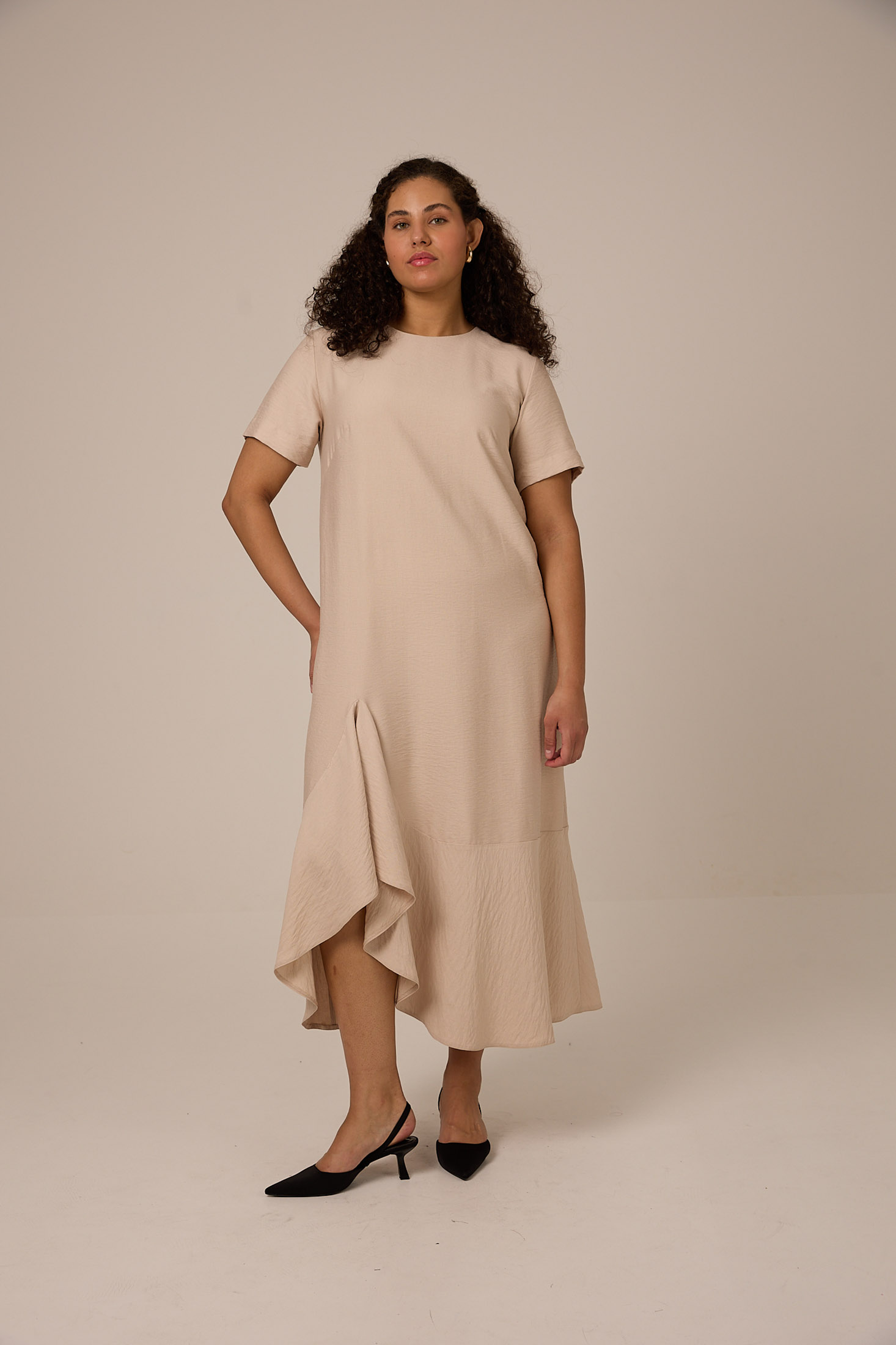 Платье А-образного силуэта. Вырез горловины круглый, высокий. Рукава прямые, короткие. Нагрудные вытачки обеспечивают хорошую посадку. По ассиметричному низу изделия выполнен притачной широкий волан. Платье выполнено из струящейся ткани с высоким содержанием вискозы в черном и светло бежевом цветах.