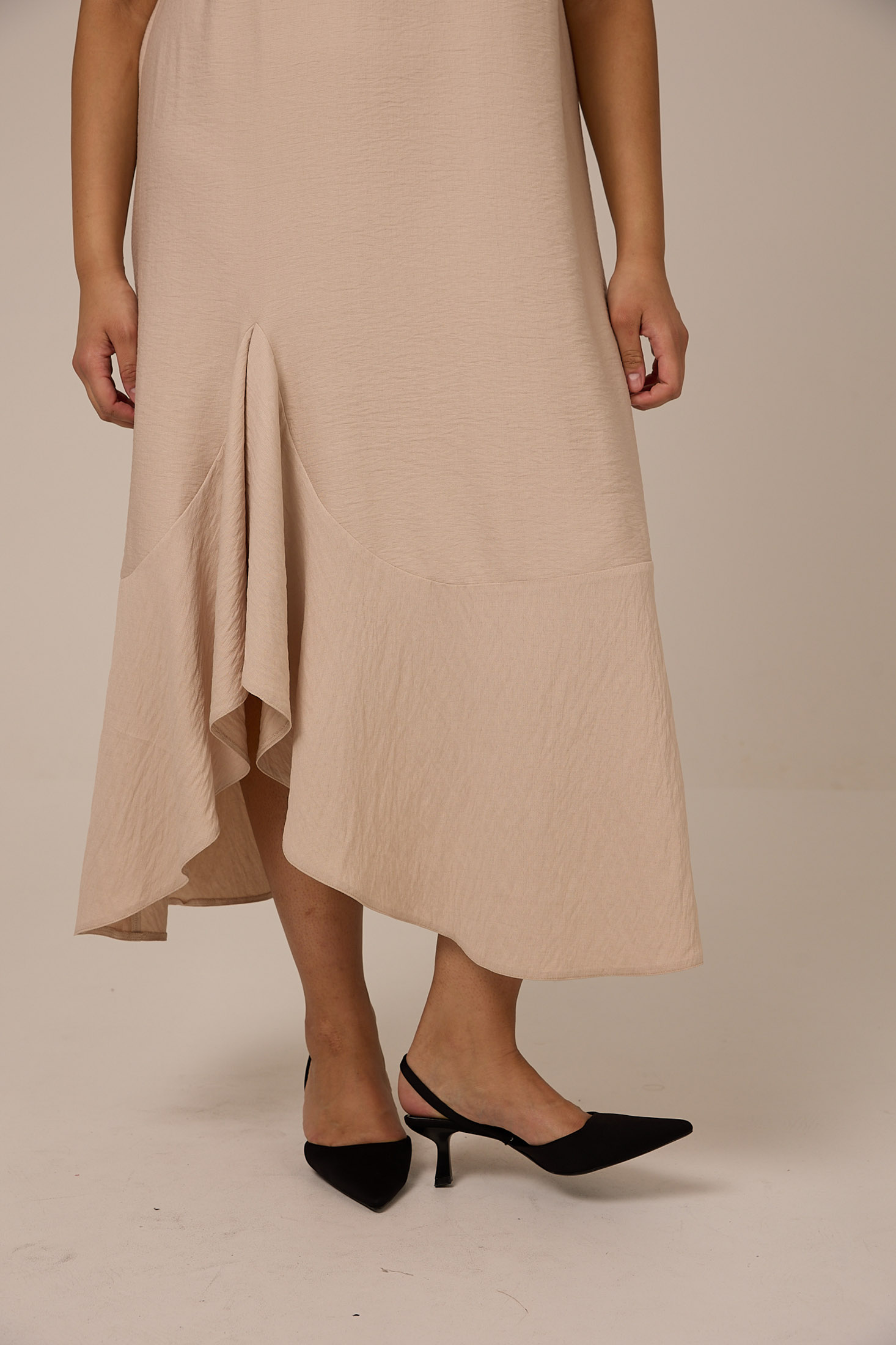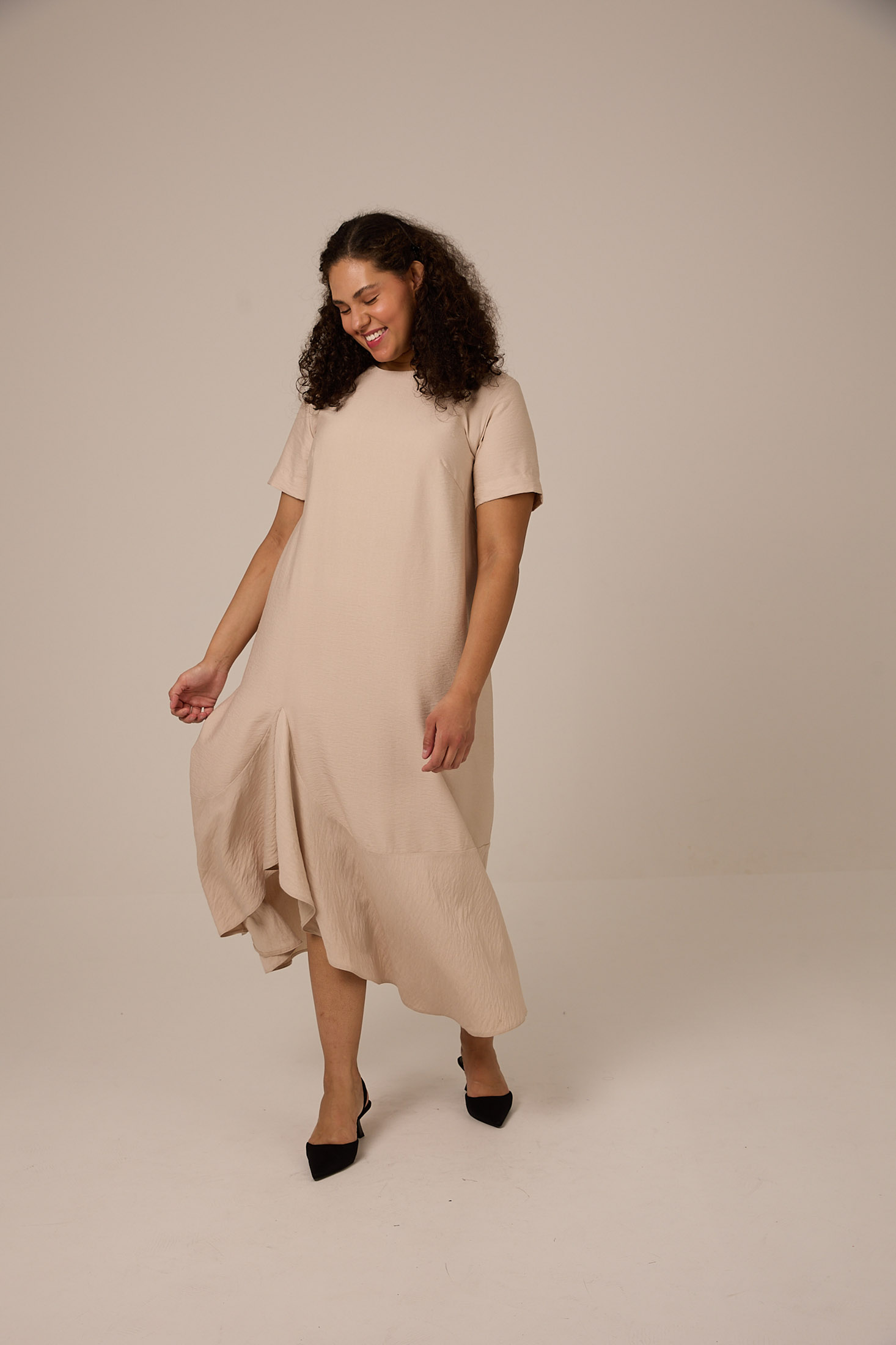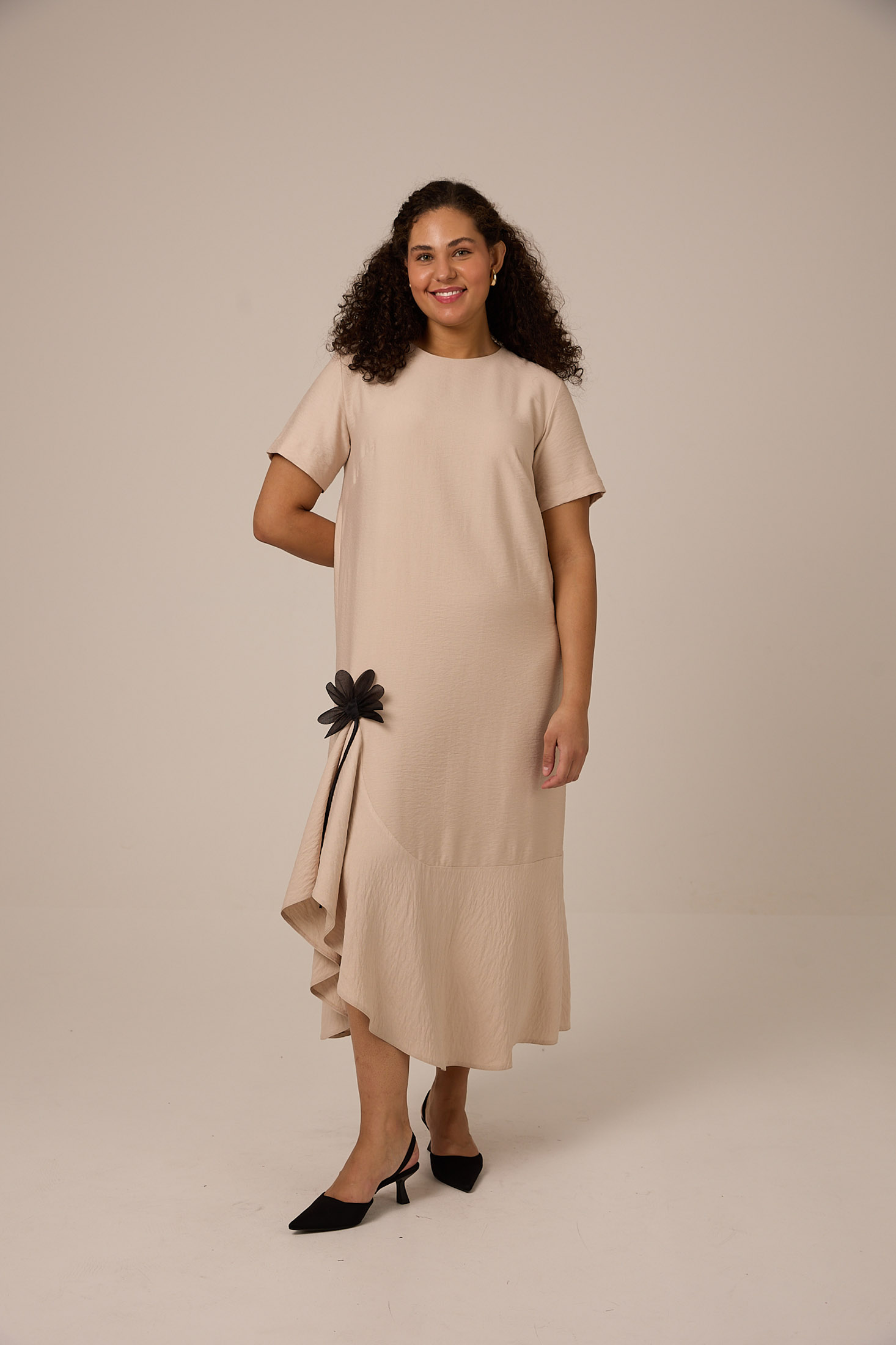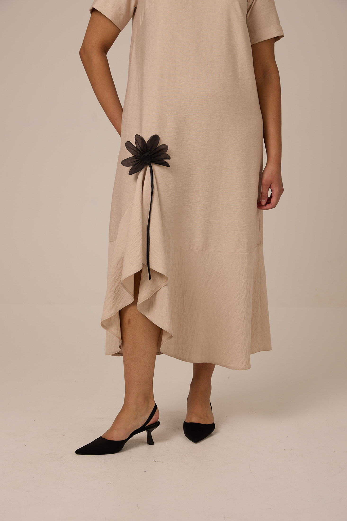 Платье А-образного силуэта. Вырез горловины круглый, высокий. Рукава прямые, короткие. Нагрудные вытачки обеспечивают хорошую посадку. По ассиметричному низу изделия выполнен притачной широкий волан. Платье выполнено из струящейся ткани с высоким содержанием вискозы в черном и светло бежевом цветах.