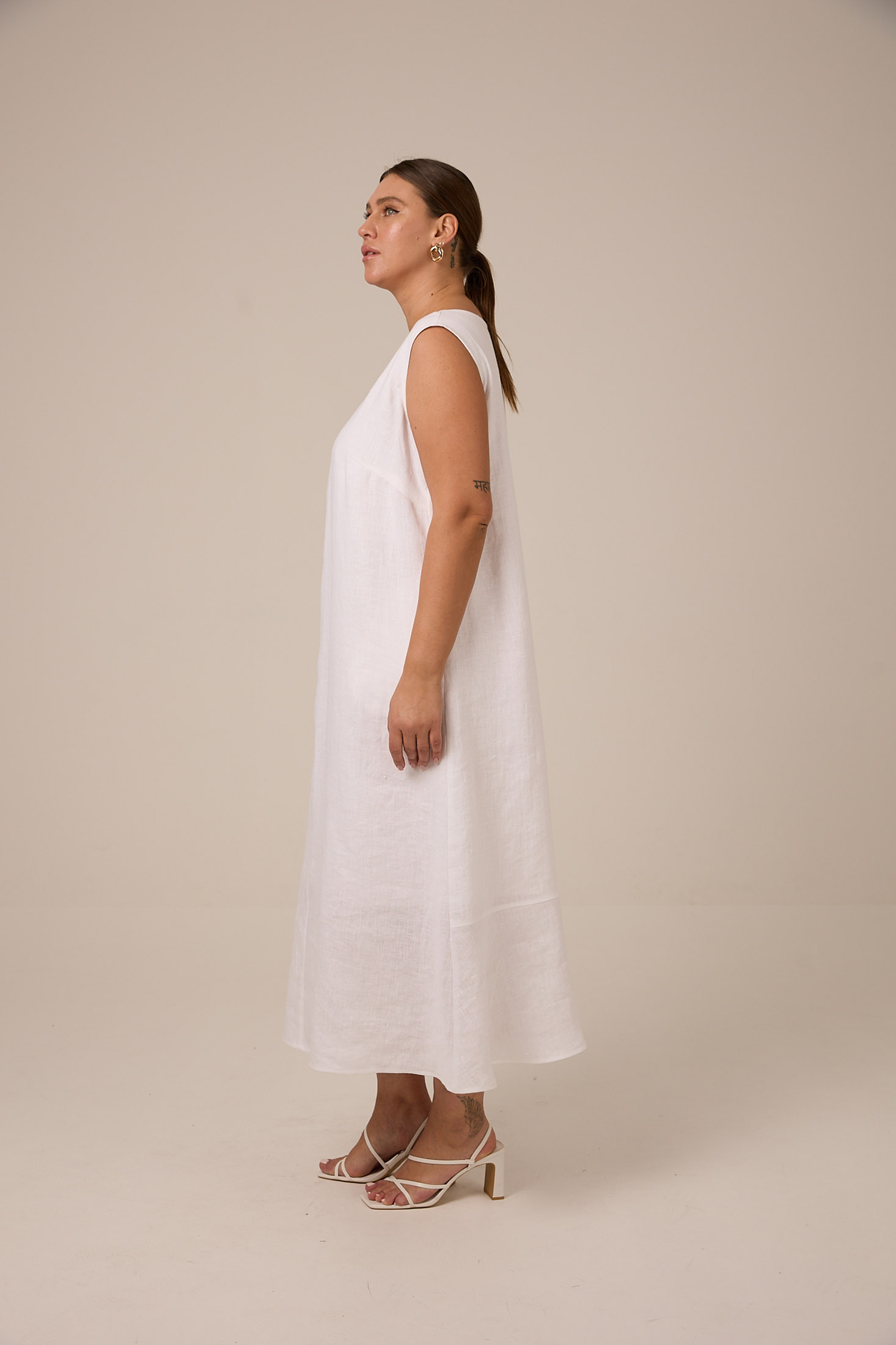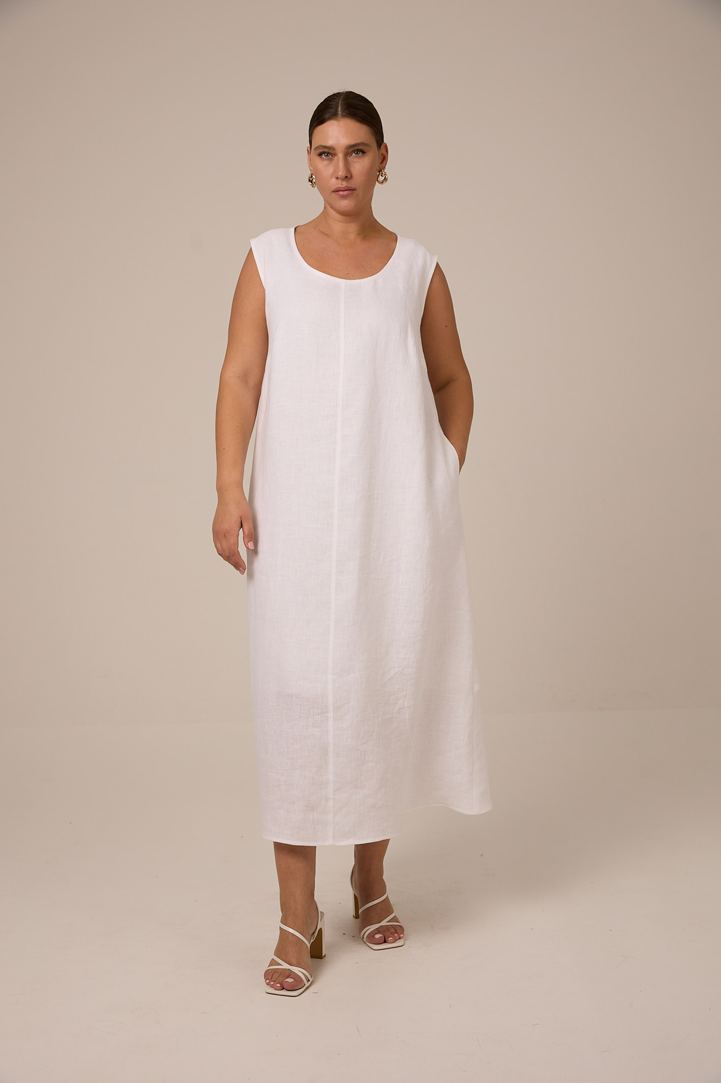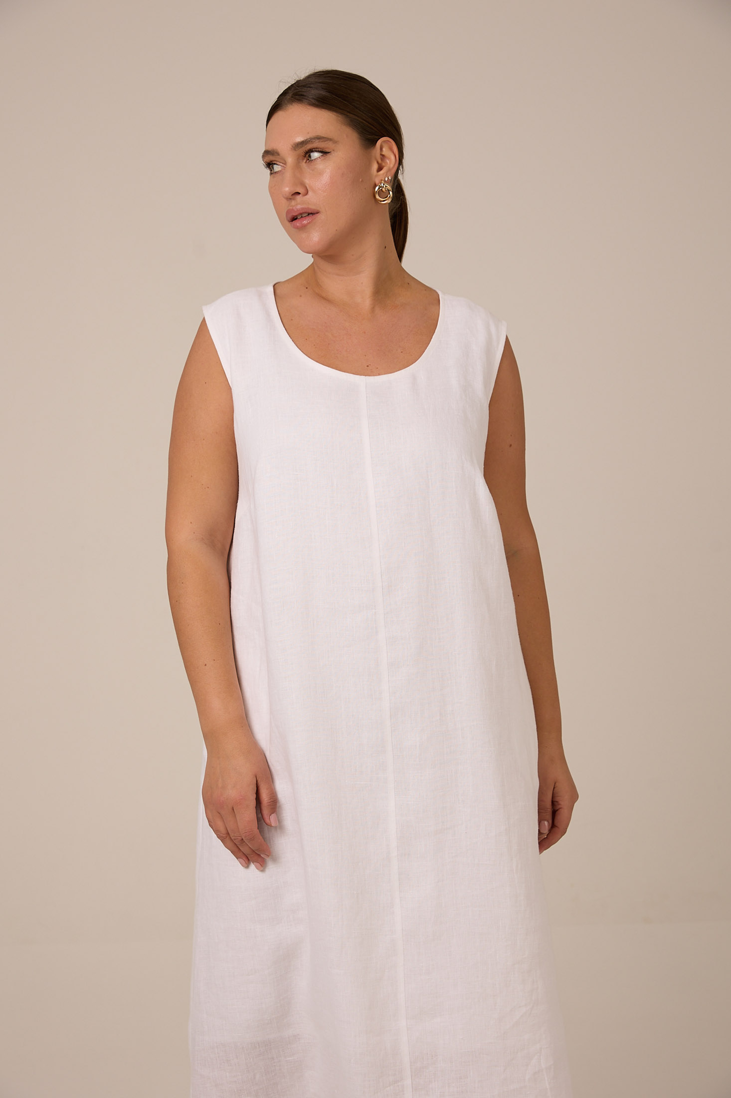 Платье длиной макси, А-образного силуэта, без рукавов. Вырез горловины круглый. Нагрудные вытачки обеспечивают хорошую посадку. По низу спинки широкий притачной волан. Платье из натурального 100% крэшированного льна (эффект жатки). Цвета черный, голубой, белый. Платье белого цвета выполнено на вискозной подкладке.