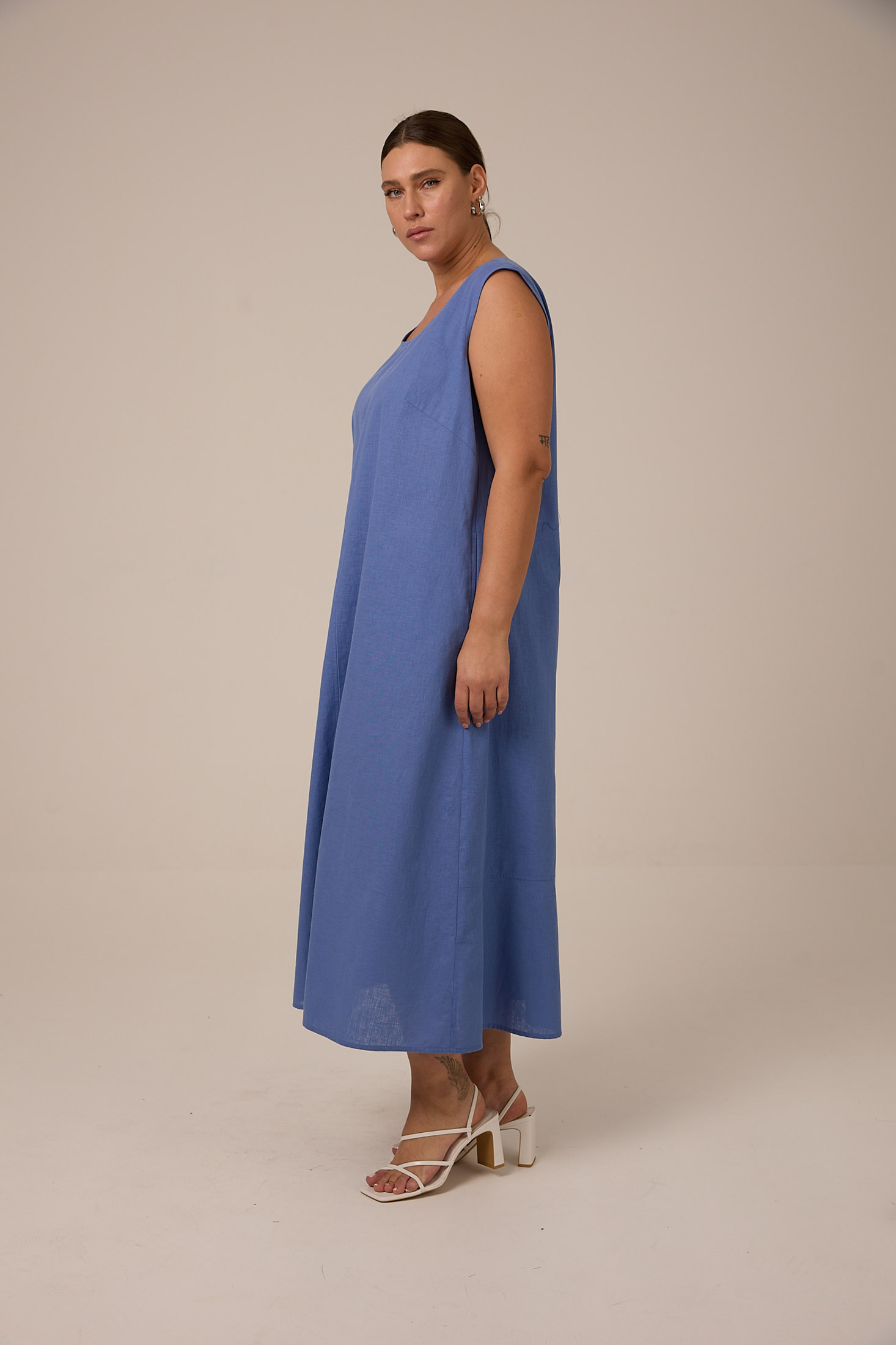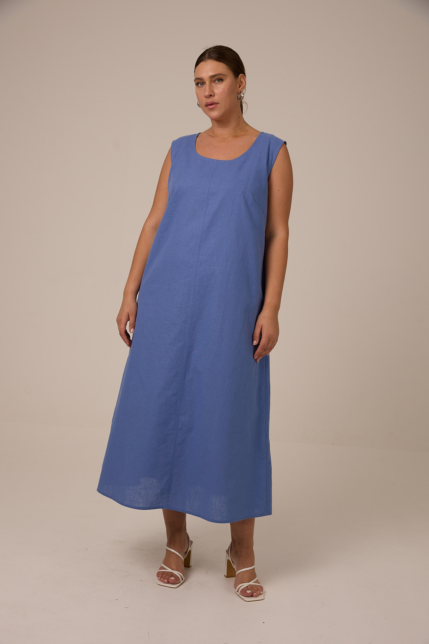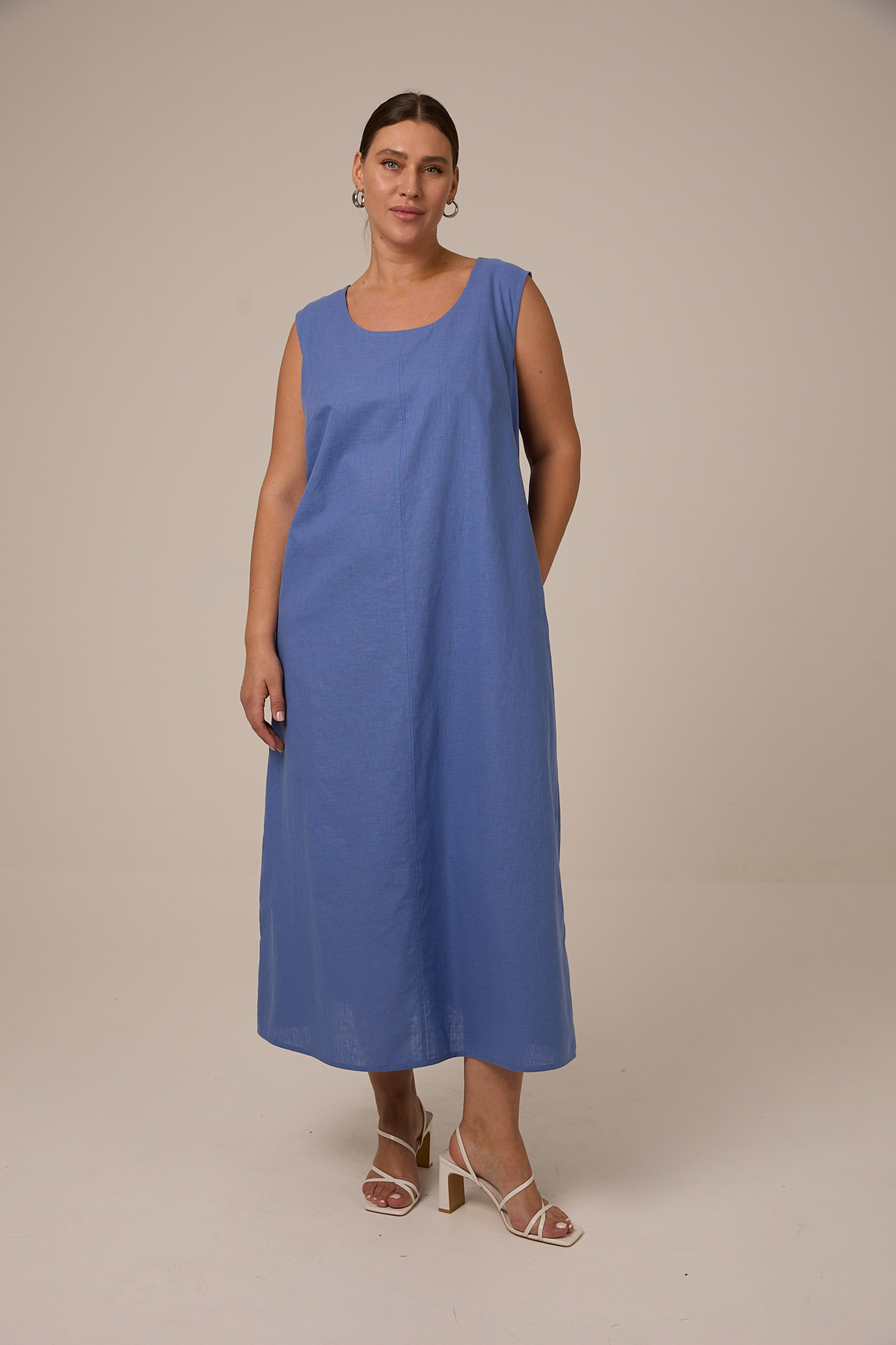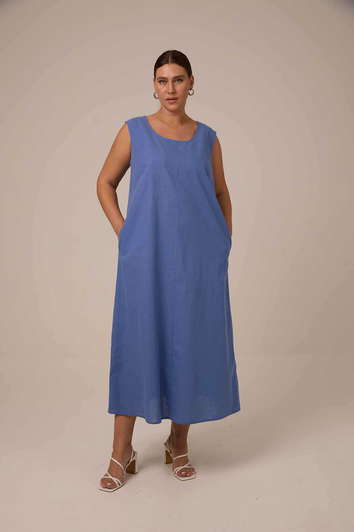 Платье длиной макси, А-образного силуэта, без рукавов. Вырез горловины круглый. Нагрудные вытачки обеспечивают хорошую посадку. По низу спинки широкий притачной волан. Платье из натурального 100% крэшированного льна (эффект жатки). Цвета черный, голубой, белый. Платье белого цвета выполнено на вискозной подкладке.