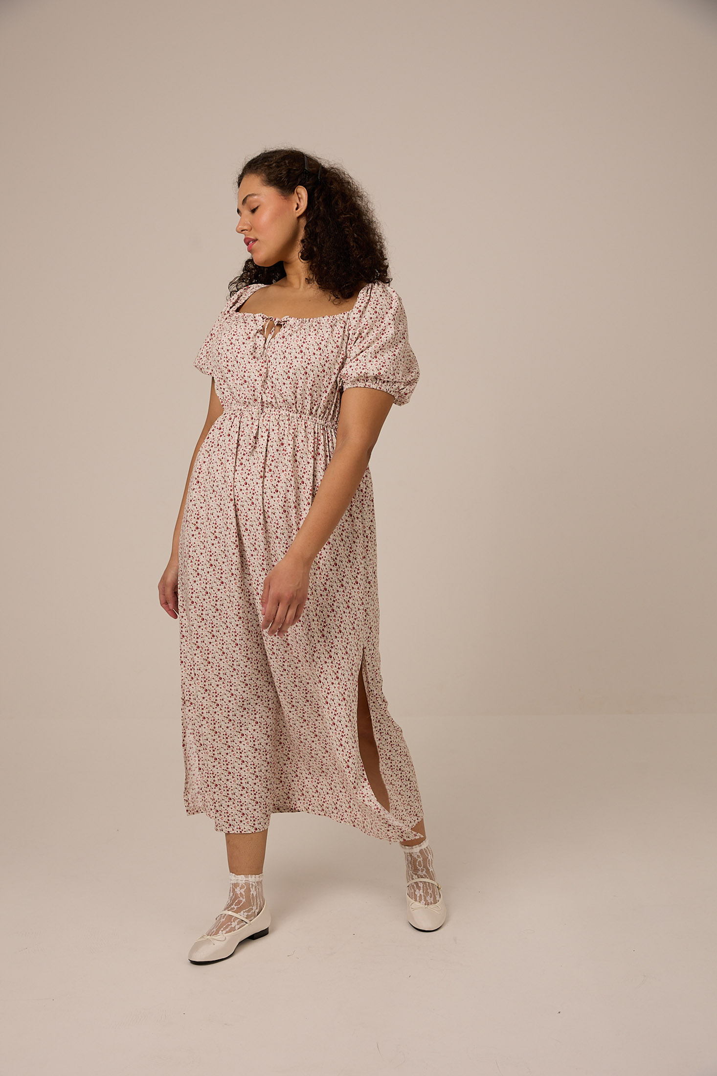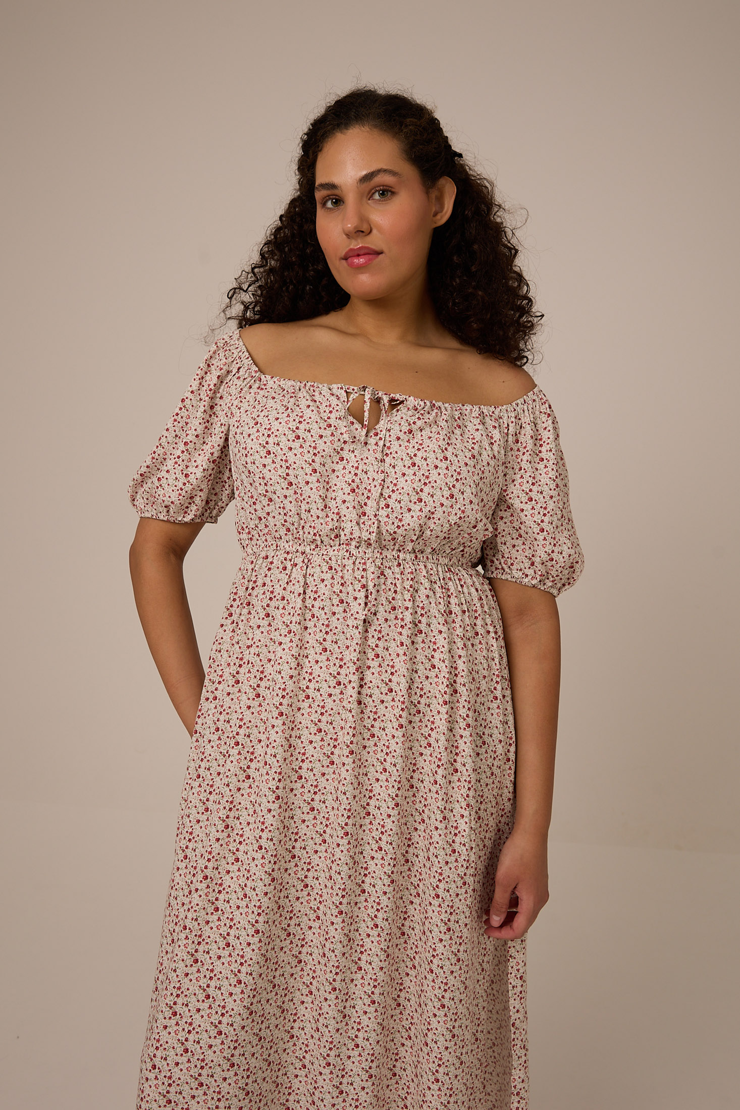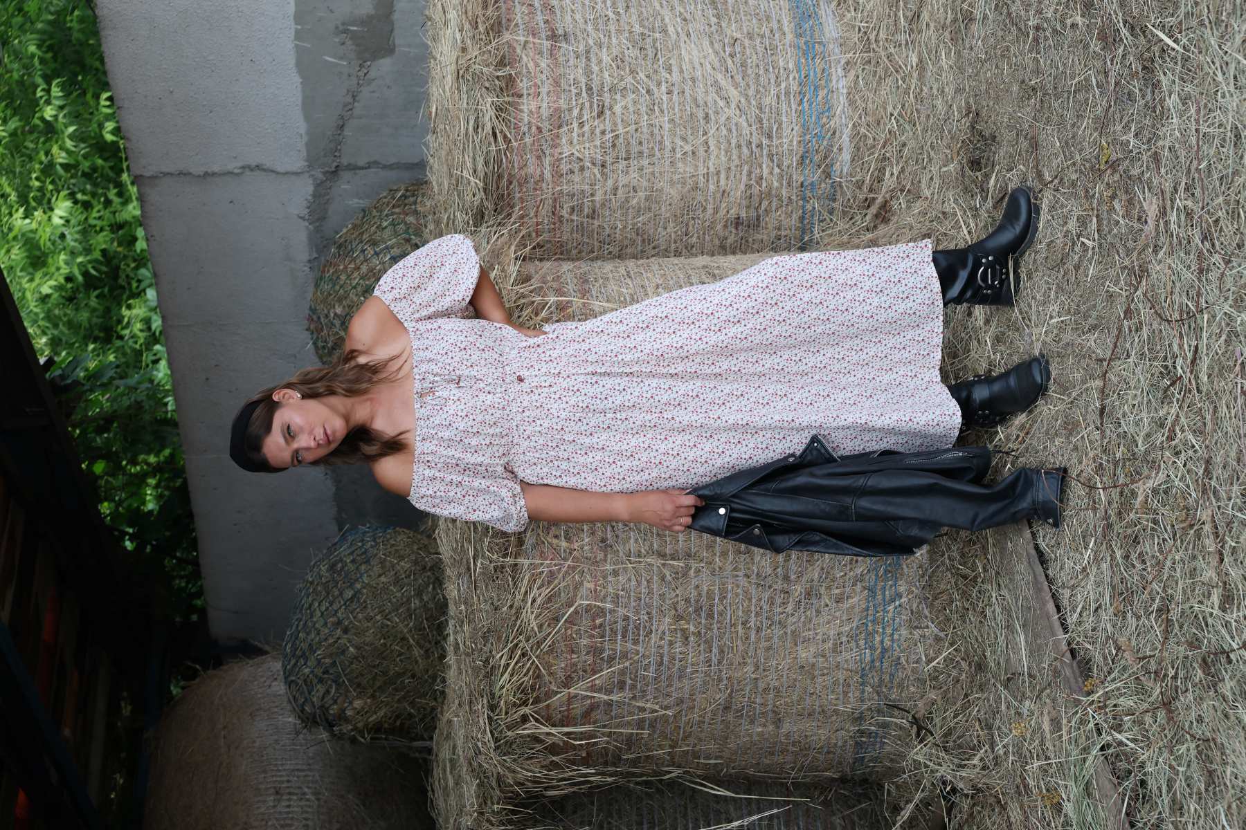Платье полуприлегающее, с широкими рукавами-фонариками. Горловина собрана на шнур и может регулироваться по глубине. По линии талии платье собрано на резинку. В боковых швах выполнены разрезы. Изделие выполнено из струящейся вискозы в двух вариантах: синий принт и молочный принт.