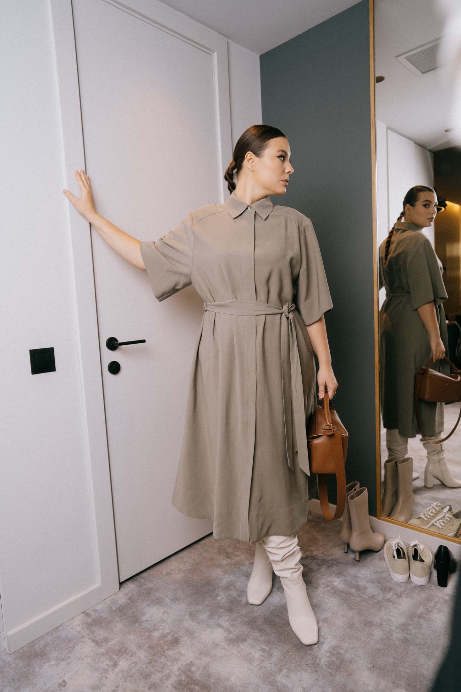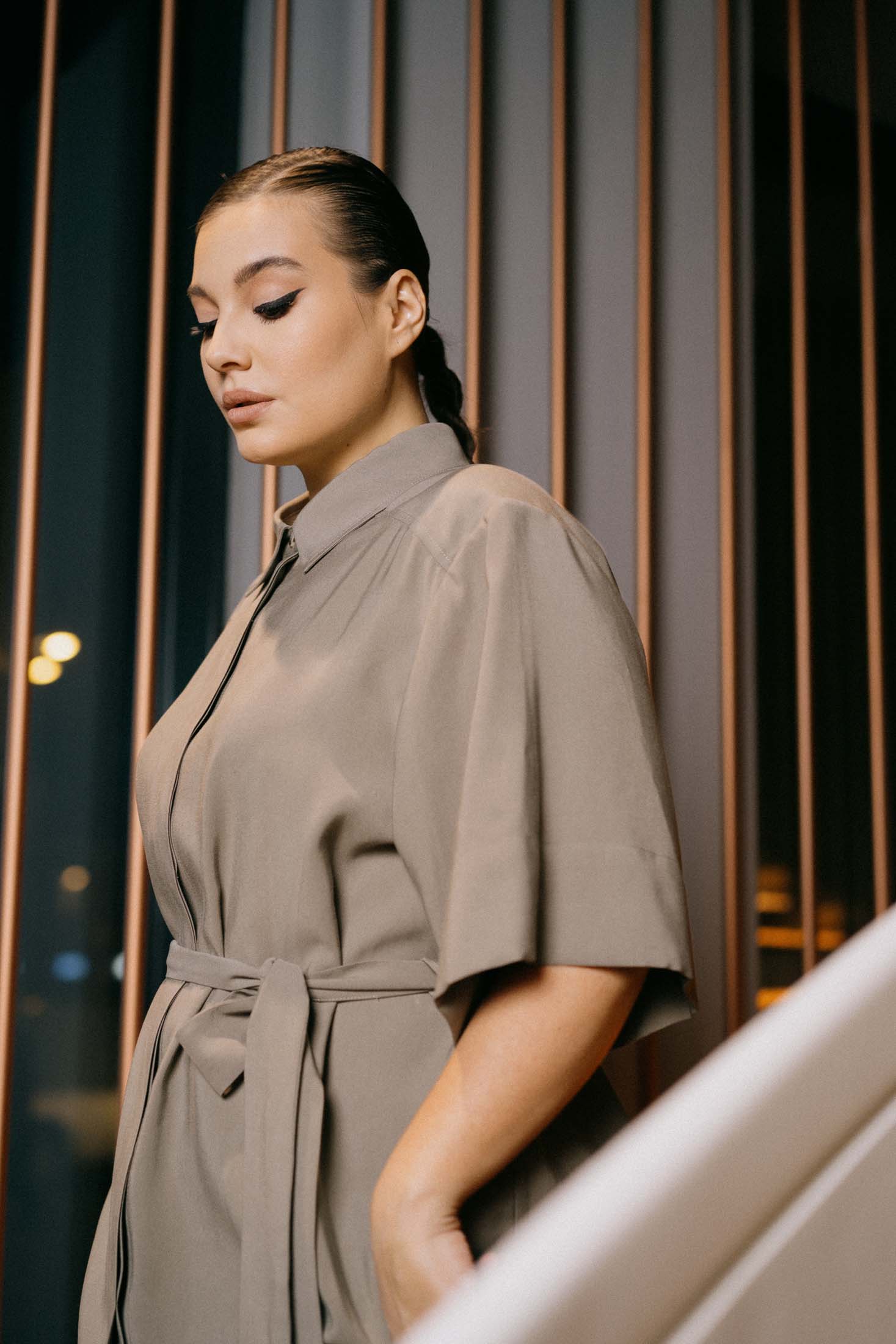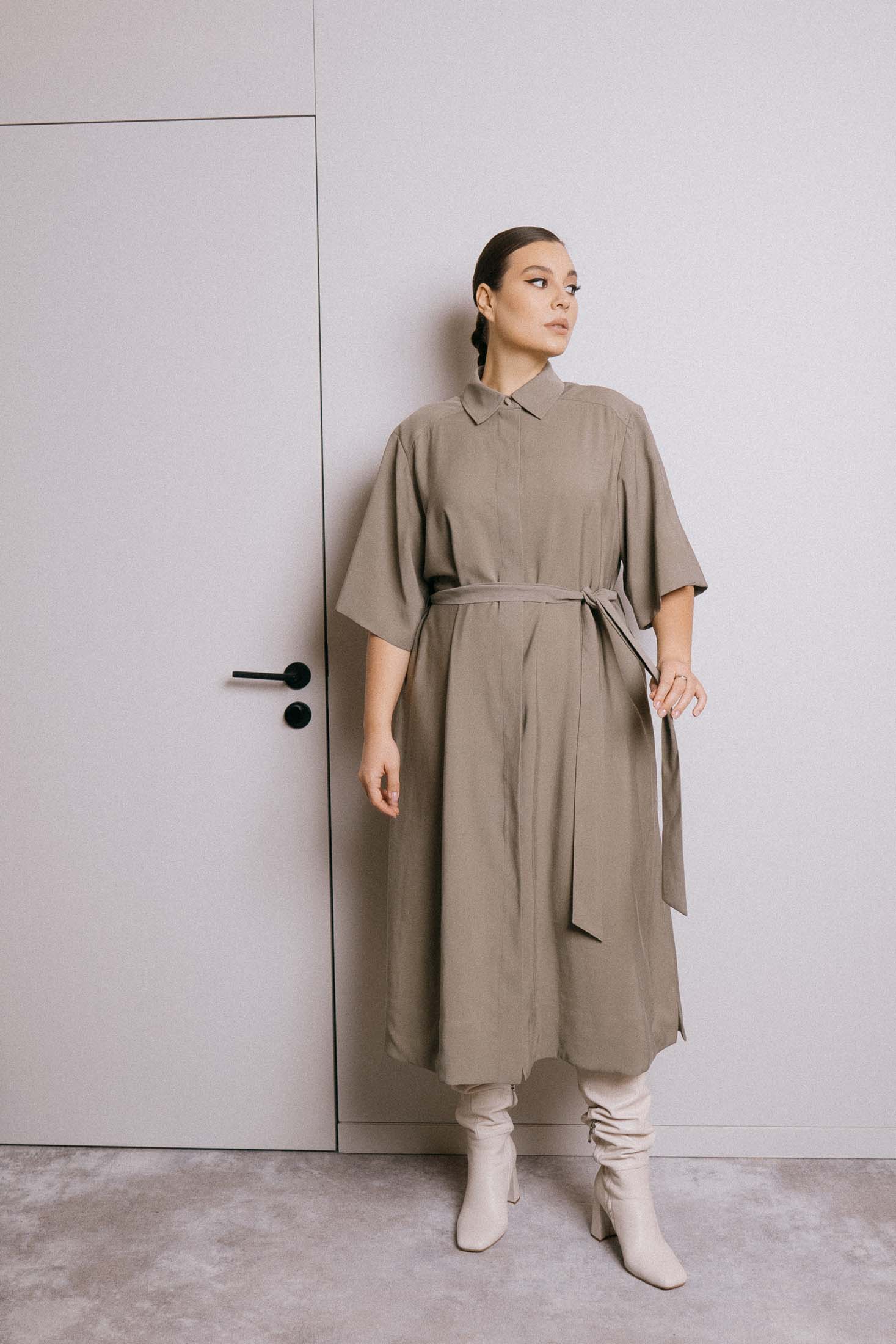 Длинное платье-рубашка свободного кроя с поясом. Воротник рубашечного типа - отложной на стойке. Плечевой пояс спущен, рукава широкие, длиной до локтя. В боковых швах выполнены высокие разрезы. Платье с отрезной кокеткой по полочке и по спинке, низ изделия и рукавов имеют эффектную, широкую подгибку. Застежка супатная на петли и пуговицы.