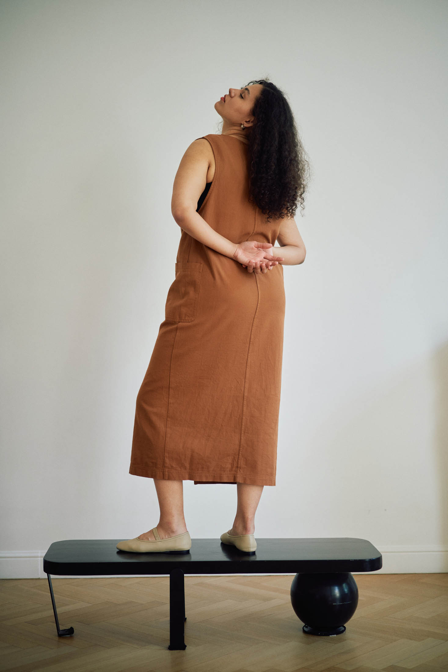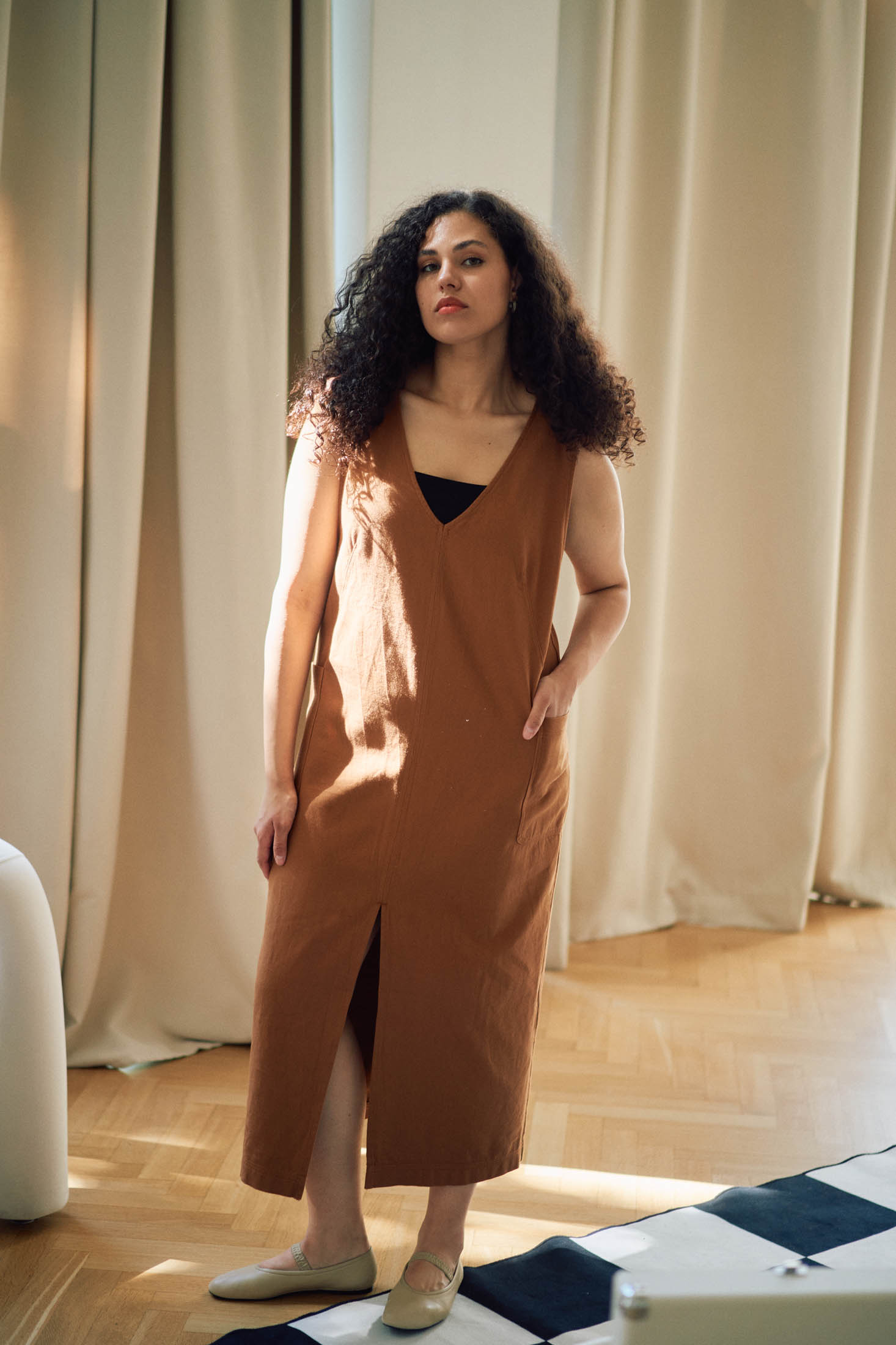 Сарафан свободный, прямого кроя, длиной миди. Глубокий вырез горловины спереди и глубокие проймы. Карманы накладные. Спереди разрез. Нагрудные вытачки обеспечивают хорошую посадку. Сарафан выполнен из плотного хлопка в коричневом и св. зеленом цвете.