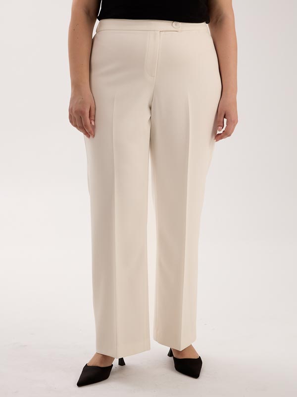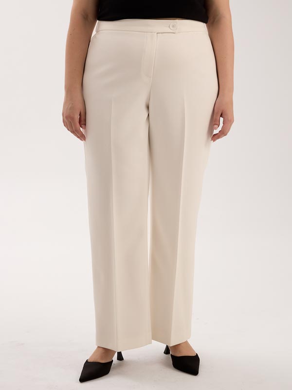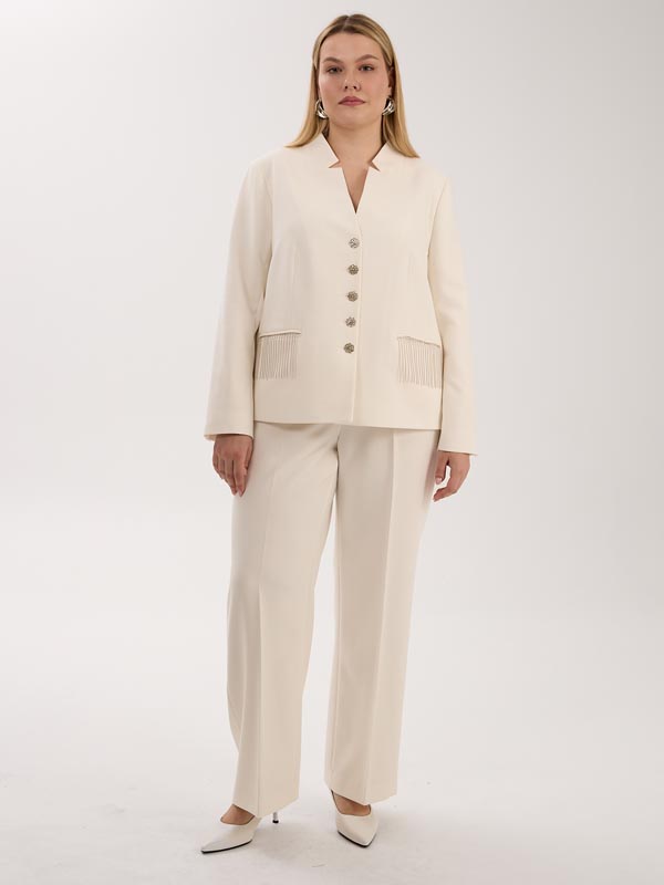 Брюки является частью костюма ЖАНЕ. Брюки полуприлегающие в области бедер, умеренно широкие по всей длине. Пояс притачной, частично (по спинке) с эластичной тесьмой внутри. Карманы на брюках не предусмотрены. Застежка на молнию и пуговицу. Выполнены из костюмной ткани в черном и молочном цветах.