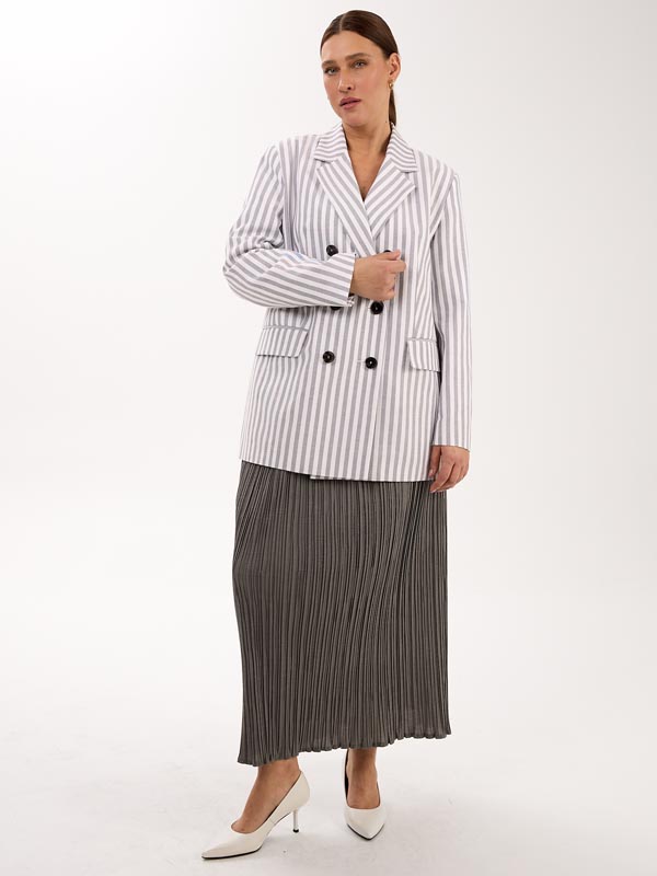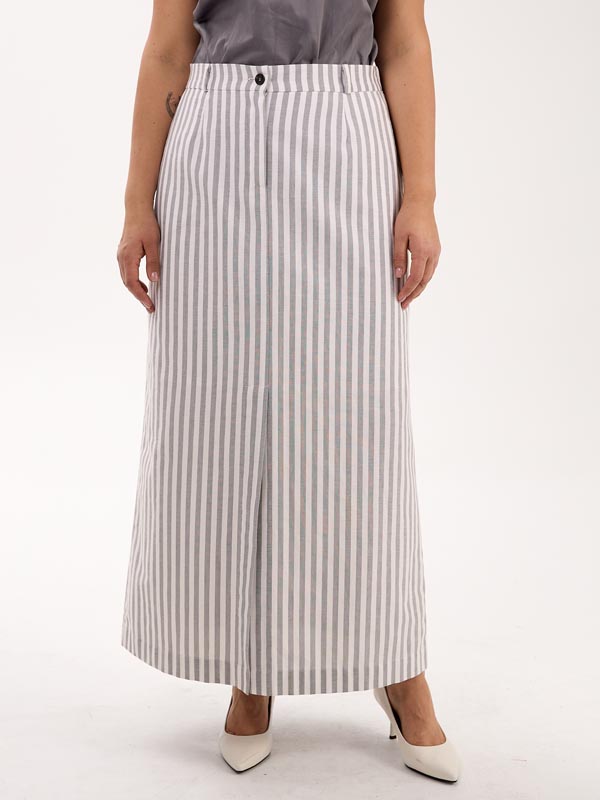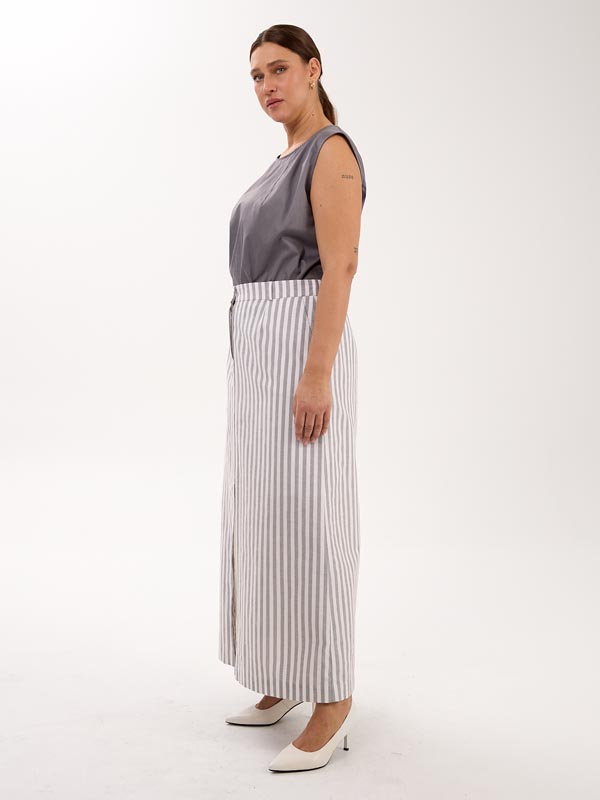 А-образная юбка длиной макси. Пояс притачной, частично ( по спинке) с эластичной тесьмой внутри. Юбка с функциональным гульфиком, и шлицей спереди. Есть боковые карманы. Изделие выполнено из испанской хлопковой ткани на подкладке. Цвета: серо-голубой, эффектная серо-белая полоска.