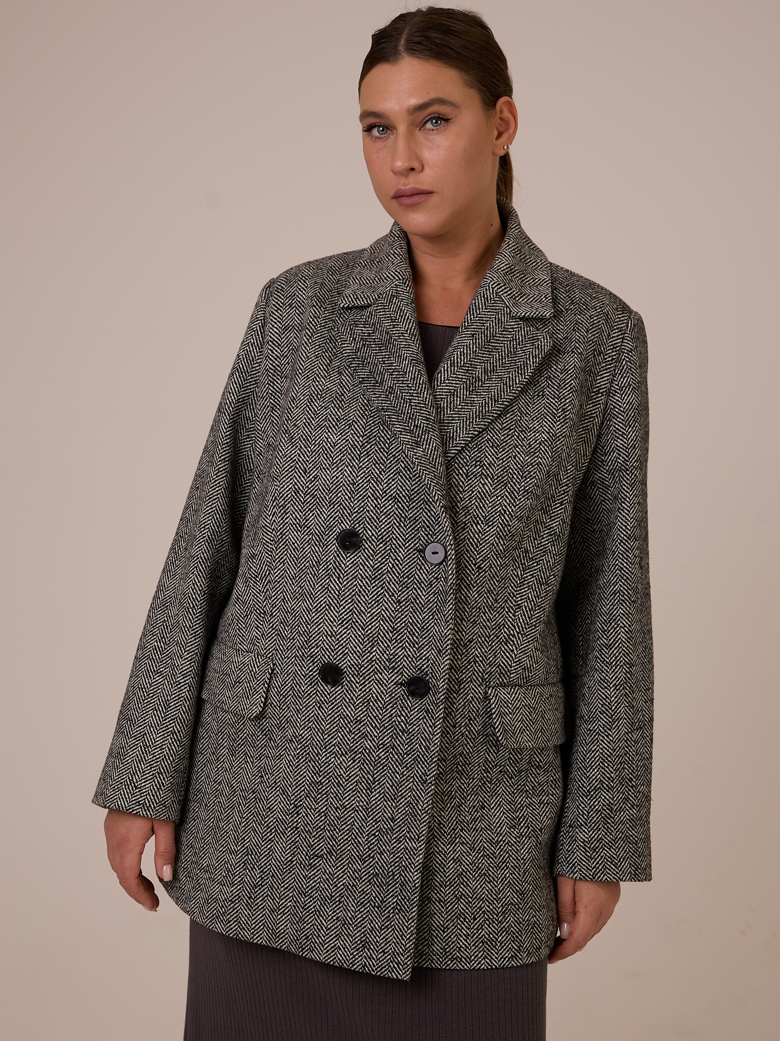 Двубортный жакет полуприлегающего силуэта с английским воротником. Карманы прорезные с клапанами, расположены горизонтально. Рукава двухшовные с ложной шлицей. Изделие застегивается на петли и пуговицы. Жакет выполнен из пальтового твида с высоким содержанием шерсти, на вискозной подкладке. Цвет серый (елочка). и коричневый (клетка).