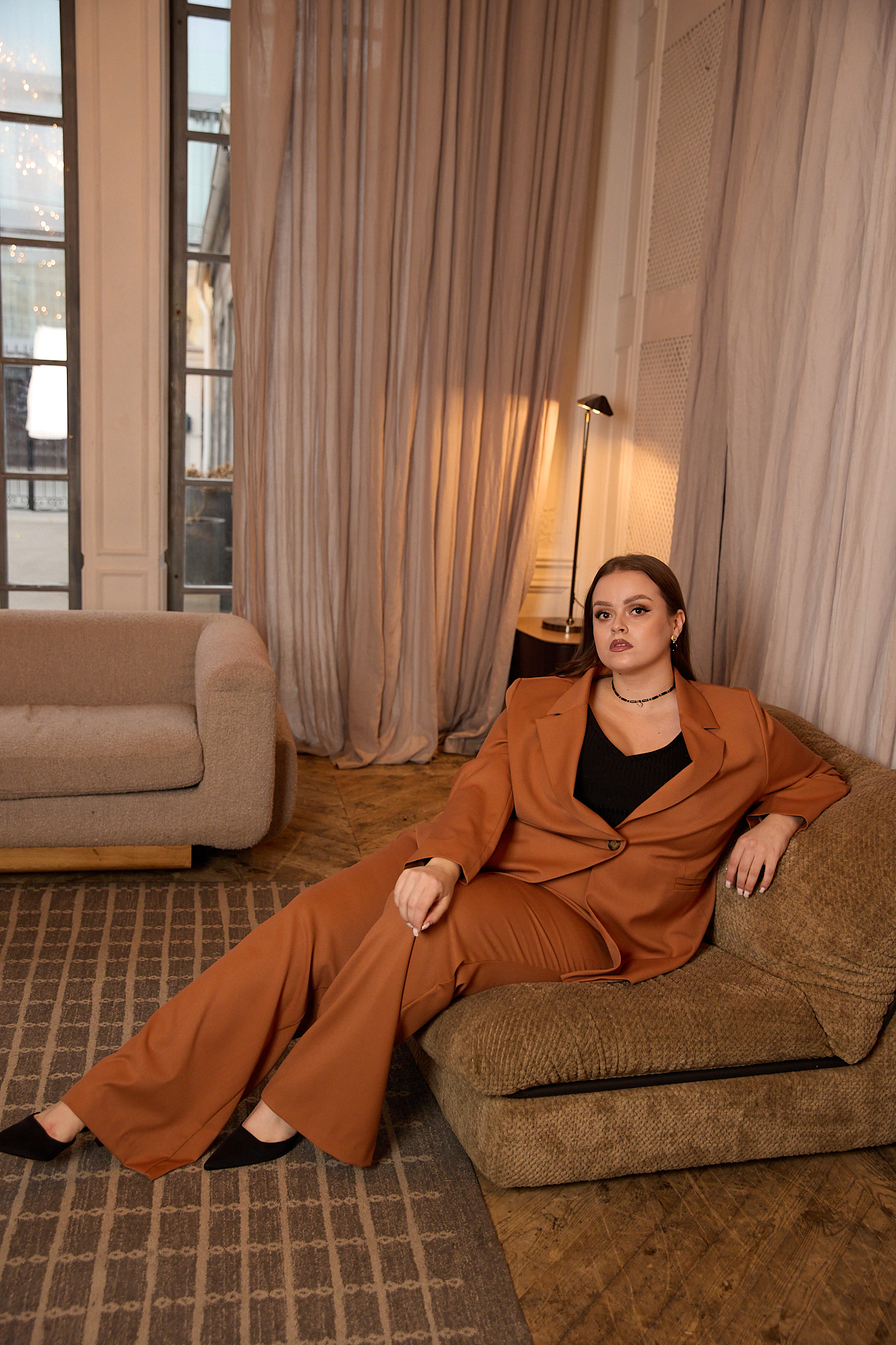 Жакет является частью костюма SHADE. Пиджак и брюки приобретаются по отдельности. Костюм представлен в двух цветах - терракотовый и черничный. Выполнен из вискозосодержащей костюмной ткани высшего класса.