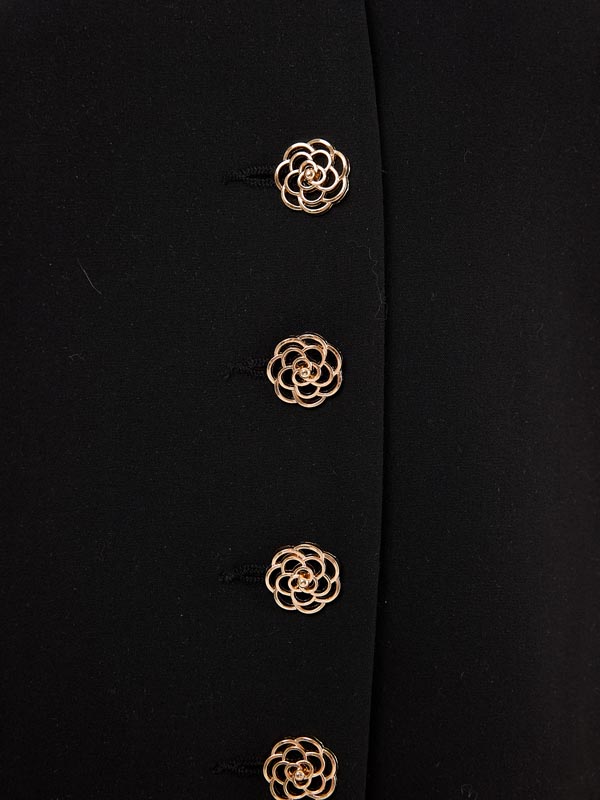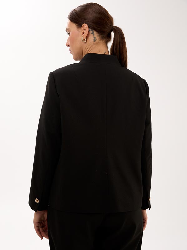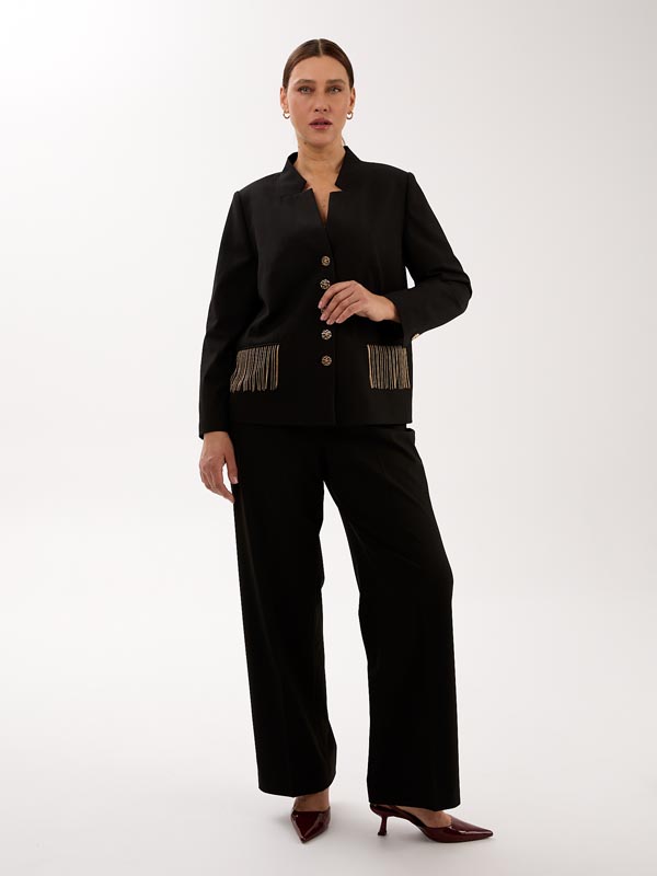 Жакет  является частью костюма ЖАНЕ. Жакет полуприлегающего силуэта с фантазийным воротником. Рукава втачные, двухшовные со шлицей и декоративной пуговицей. Боковые карманы прорезные «в рамку». Бахрома-цепочка имитирует клапан. Жакет элегантной длины-до линии бедер. Выполнен из костюмной ткани, на вискозной подкладке. Изысканные детали и фурнитура делают жакет уникальным. Цвета: черный и молочный.