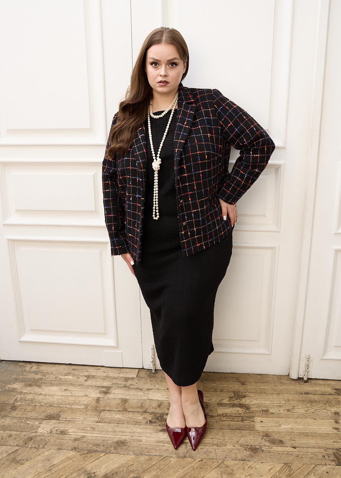 Платье полуприлегающего силуэта, длиной макси, без рукавов. Вырез горловины маленькое «каре». Рельефы и нагрудные вытачки обеспечивают хорошую посадку. В среднем шве спинки выполнен разрез и потайная застежка-молния. Платье выполнено из костюмной ткани типа «шанель» с содержанием хлопка на подкладе. Цвет черный.