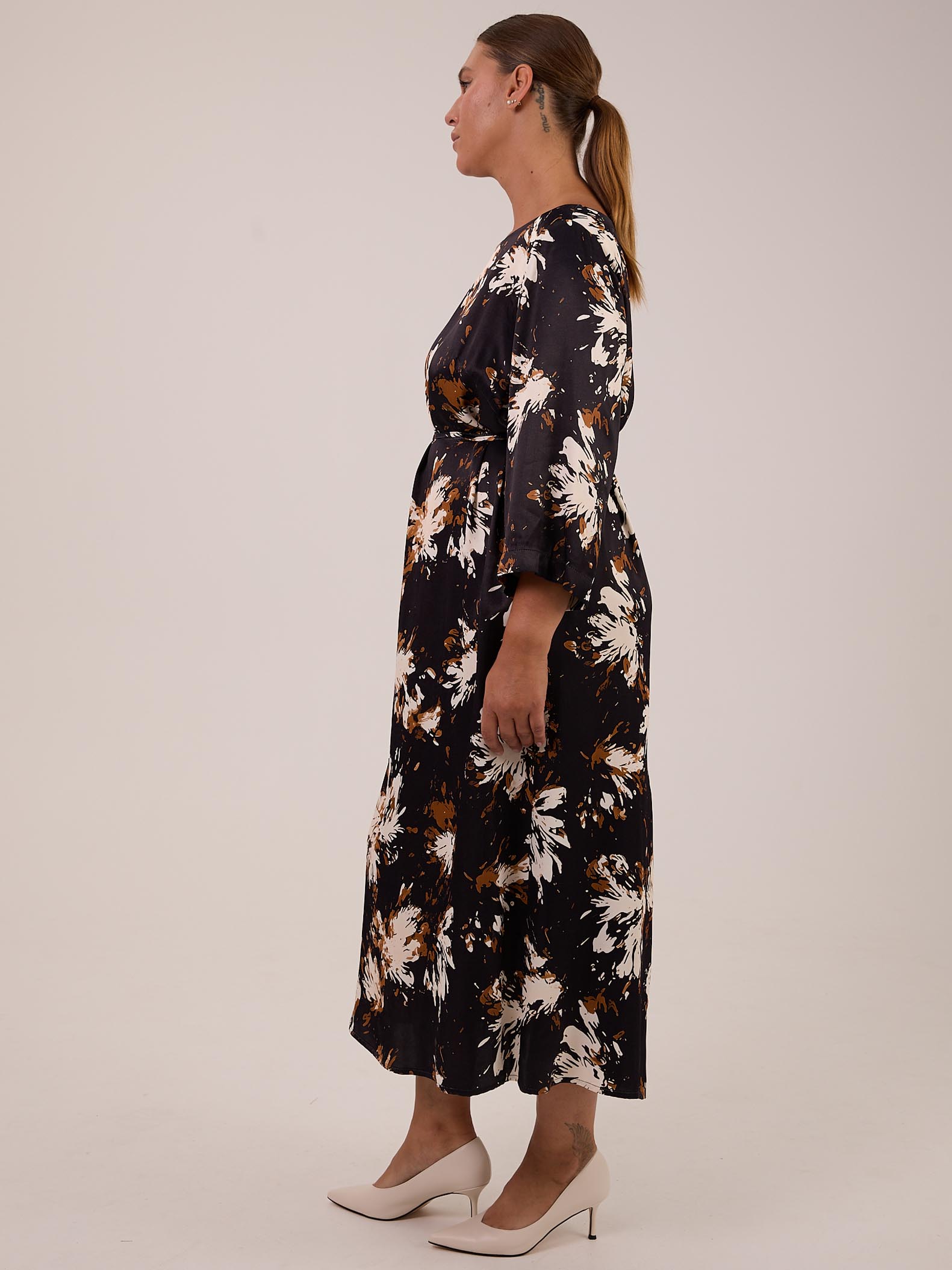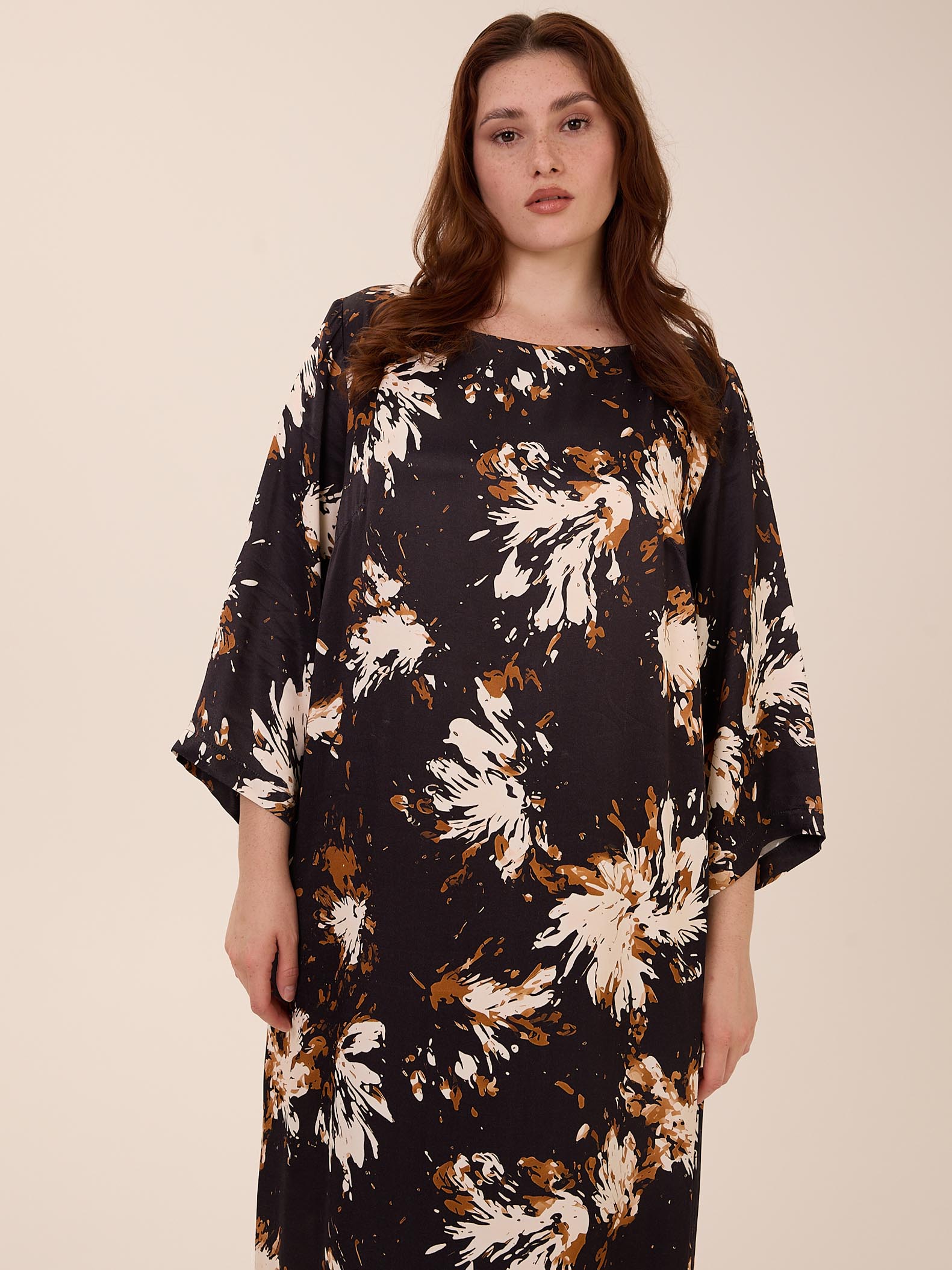 Длинное, полуприлегающее платье с незначительным расклешением к низу. Горловина оформлена широкой «лодочкой». Рукава широкие, длиной 7/8. Нагрудные вытачки обеспечивают хорошую посадку. В среднем шве спинки выполнена шлица. Есть съемный пояс-шнур. Платье выполнено из струящейся, плотной, вискозной ткани в двух принтах: черно-бежевый (цветы), черный (веревки).