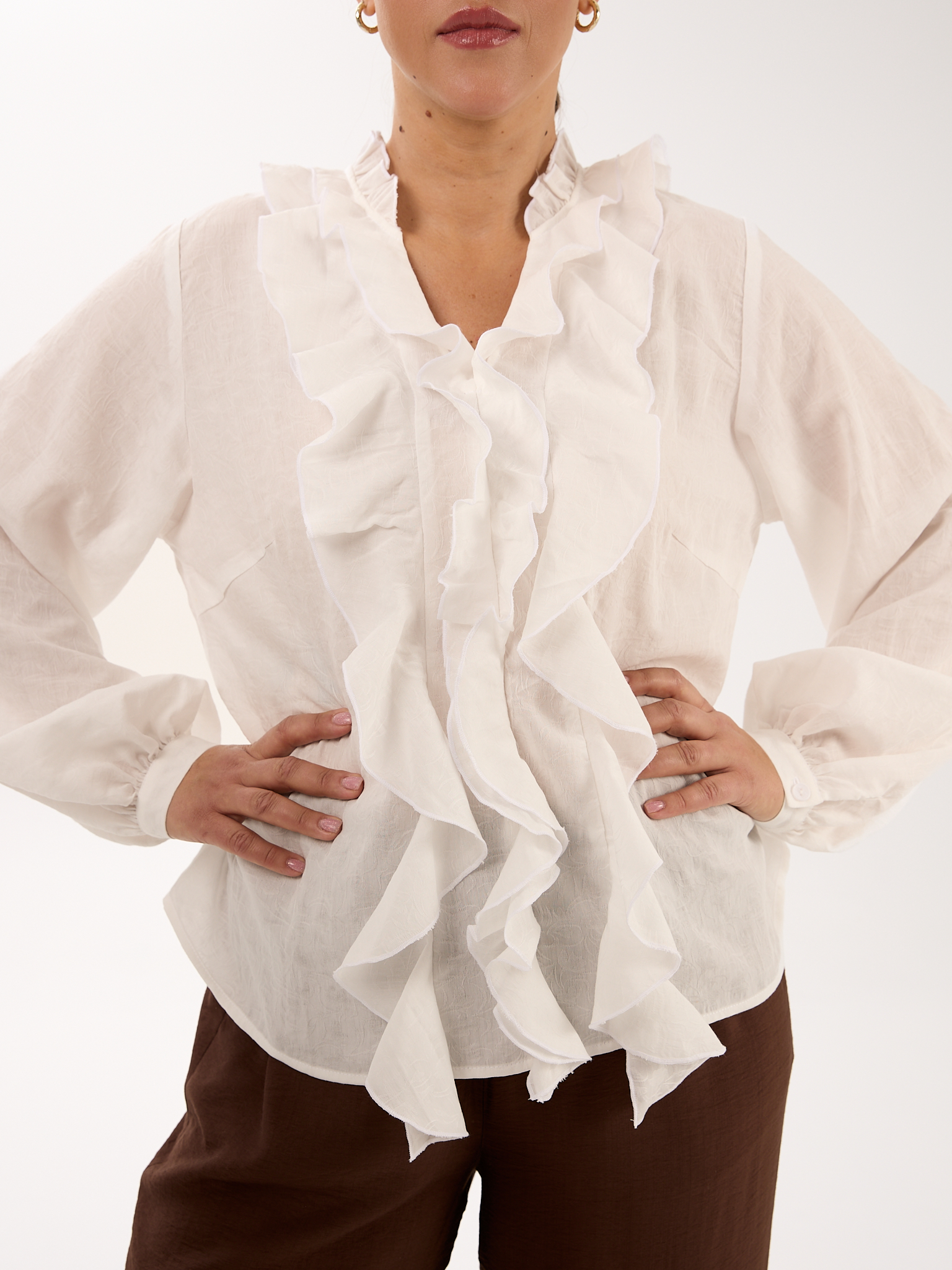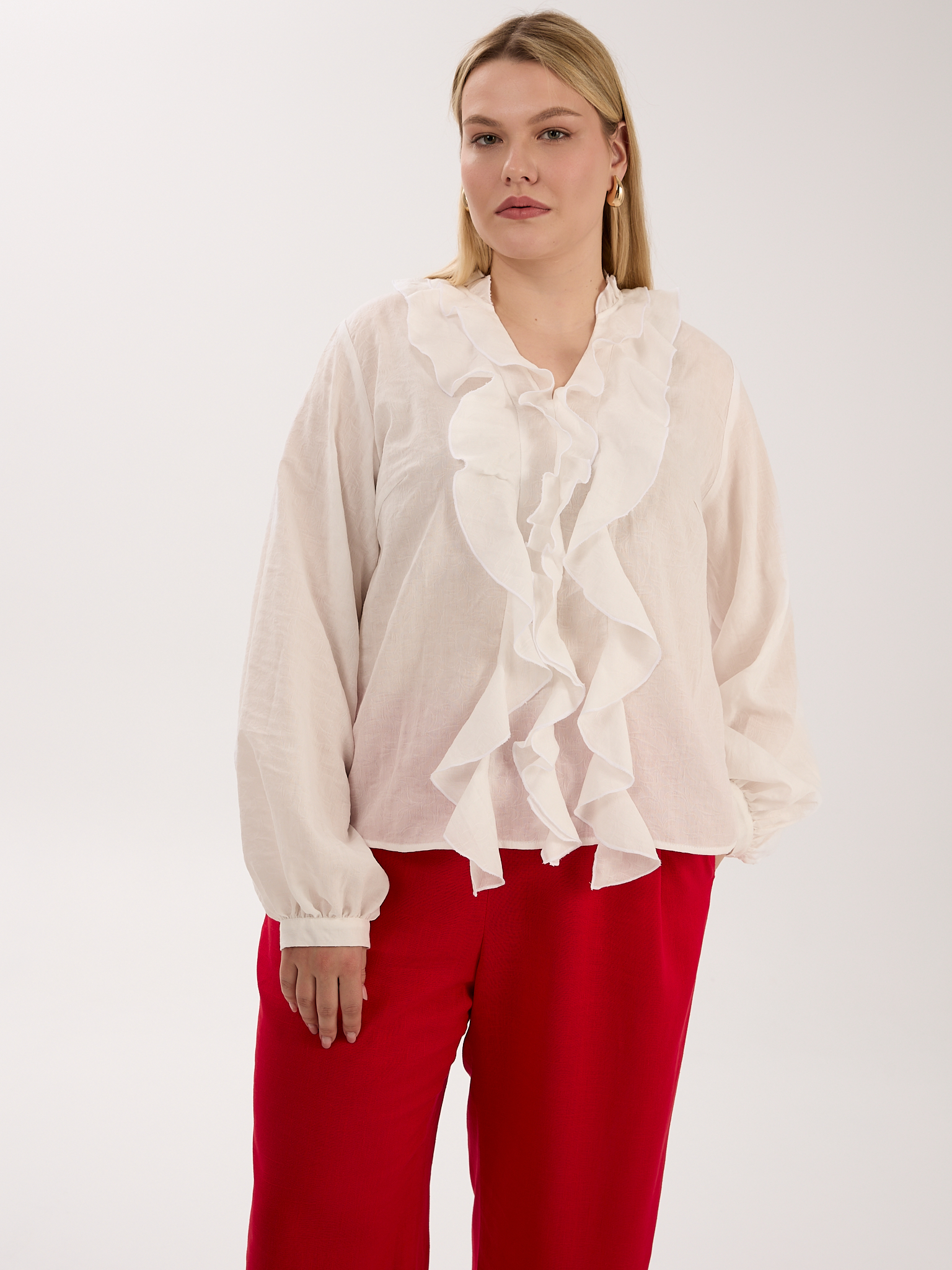 Легкая блузка прямого кроя без застежки. (надевается через голову). Горловина V-образная, оформлена оборками и воланами разной ширины, переходящими на полочку. Рукава объемные с манжетами.