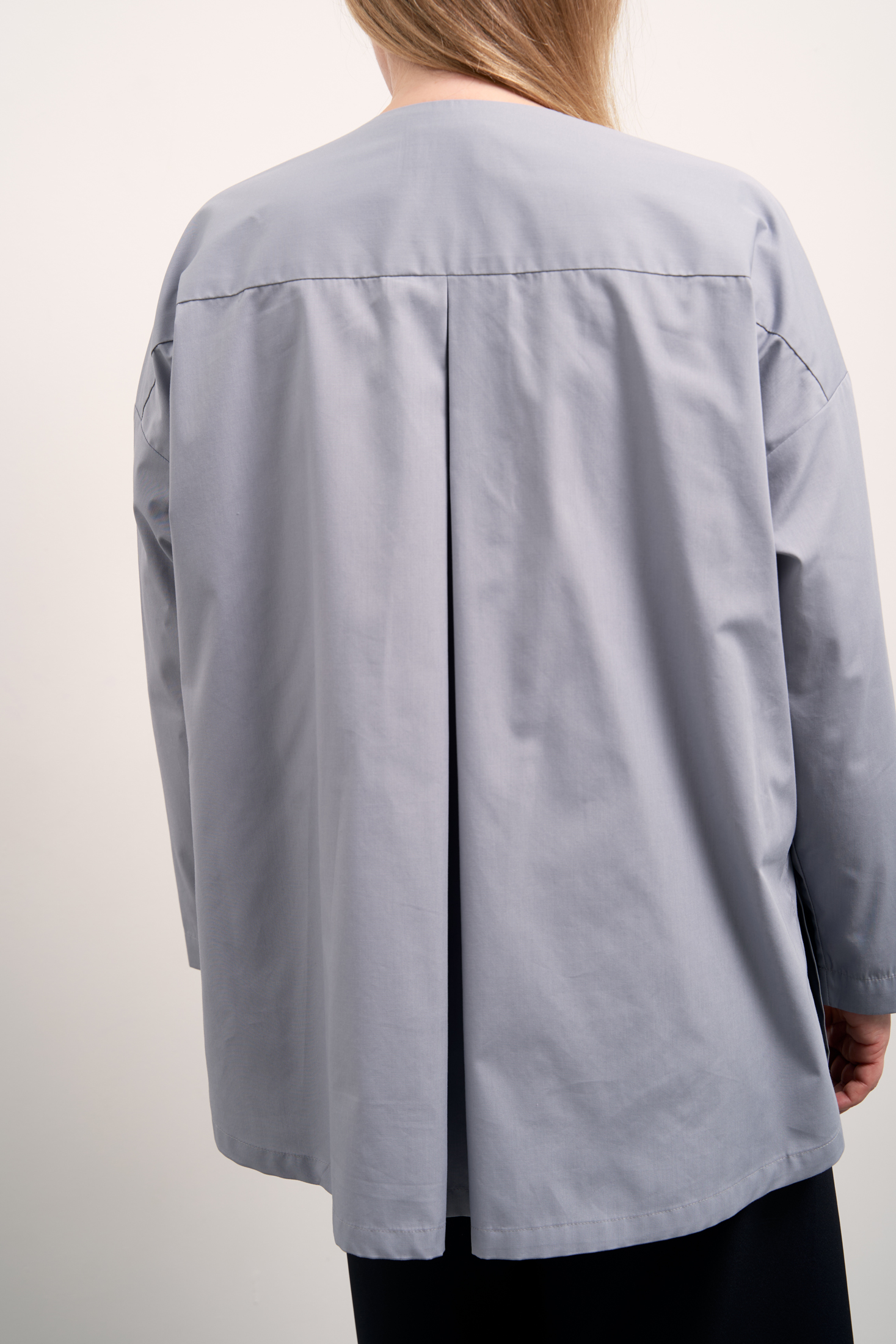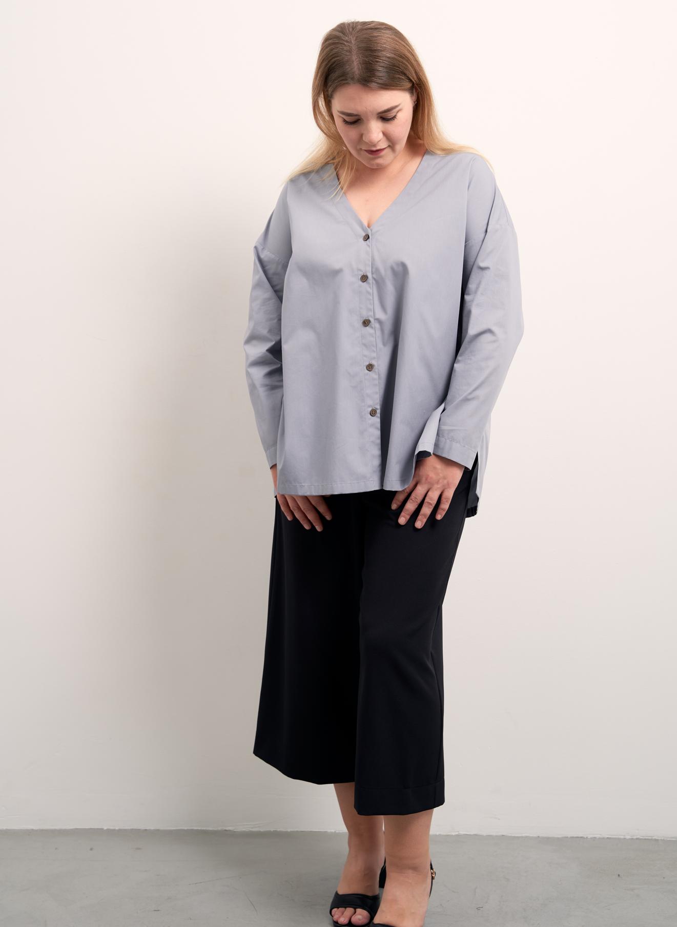Рубашка А-образного силуэта без воротника. Вырез горловины V-образный. Рукава спущенные, длинные. На спинке отрезная кокетка и встречная складка. Низ оформлен плавной линией с удлинением по спинке. В боковых швах высокие разрезы. Застегивается рубашка на петли и пуговицы. Выполнена из ткани с высоким содержанием хлопка в сером и черном цветах.