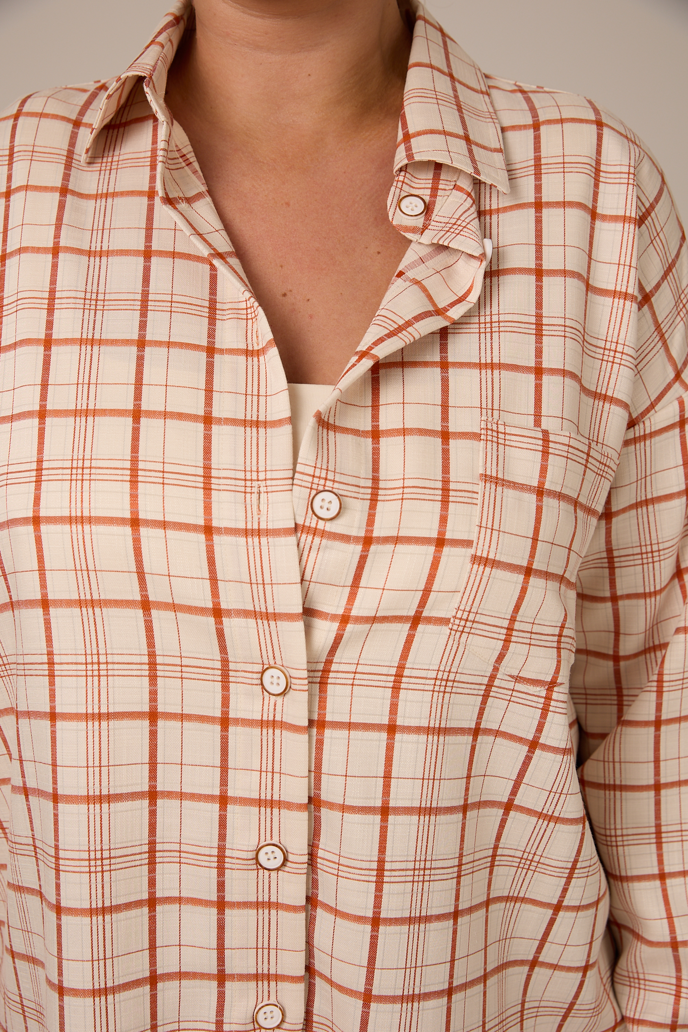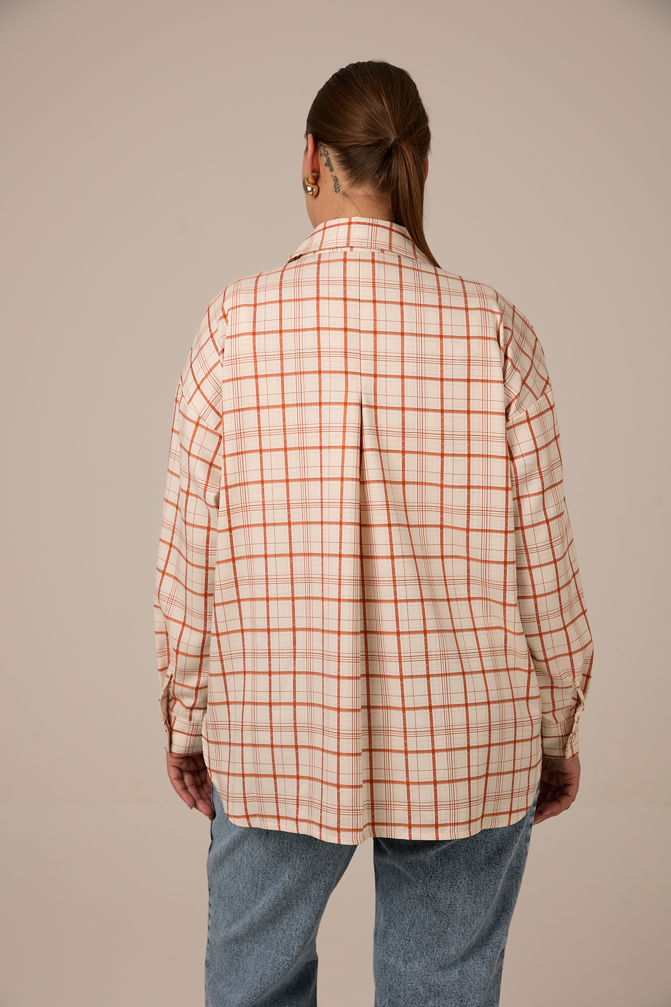 Классическая рубашка свободного кроя со спущенным плечевым поясом. Воротник отложной на стойке. Рукава длинные с манжетами. На спинке выполнена встречная складка, которая обеспечивает дополнительный объем. На левой полочке нагрудный карман. Низ оформлен плавной линией с закругленными боками. Застегивается рубашка на петли и пуговицы. Выполнена из мягкой ткани с высоким содержанием вискозы в двух цветах серая полоска и оранжевая клетка.