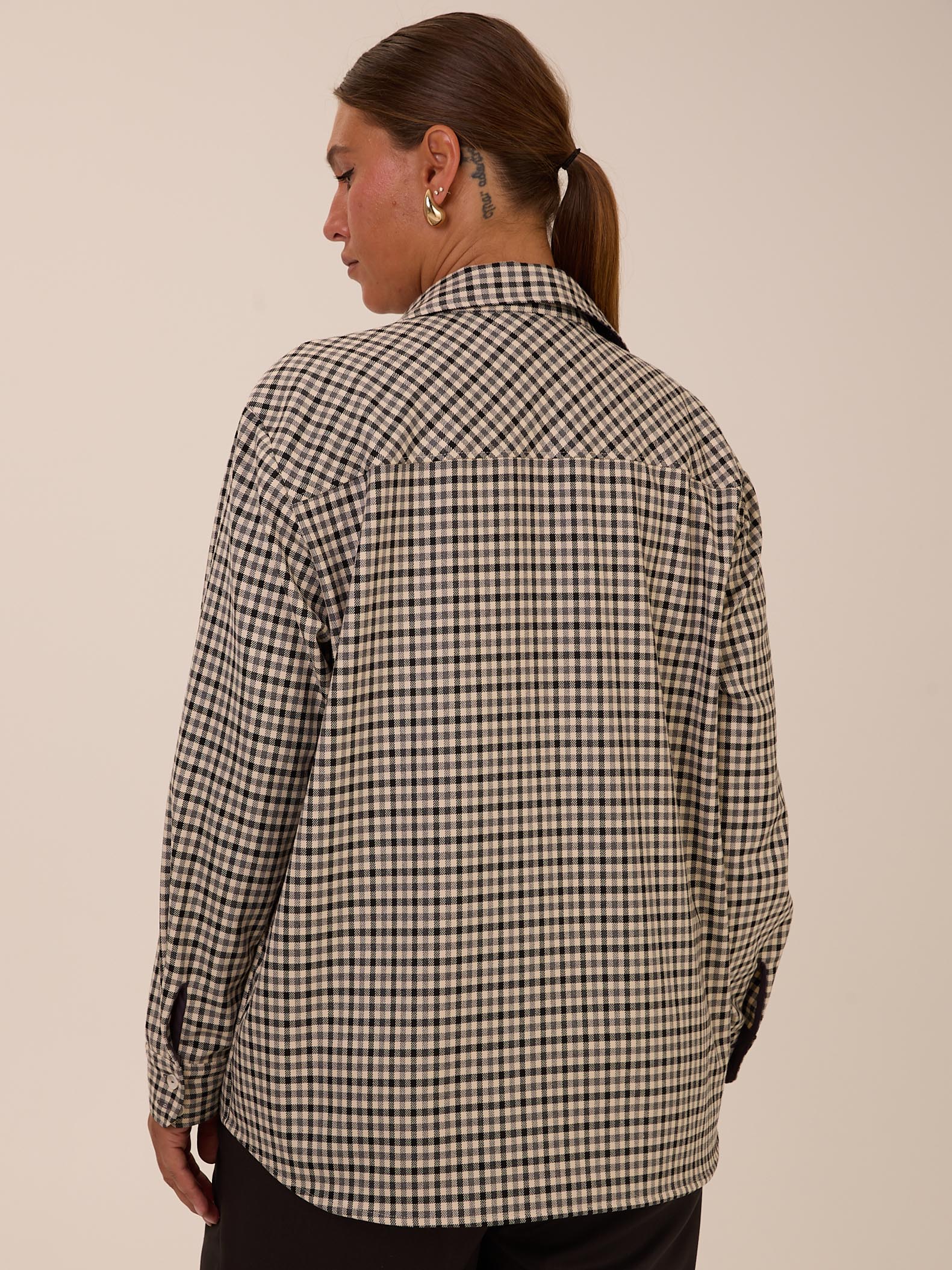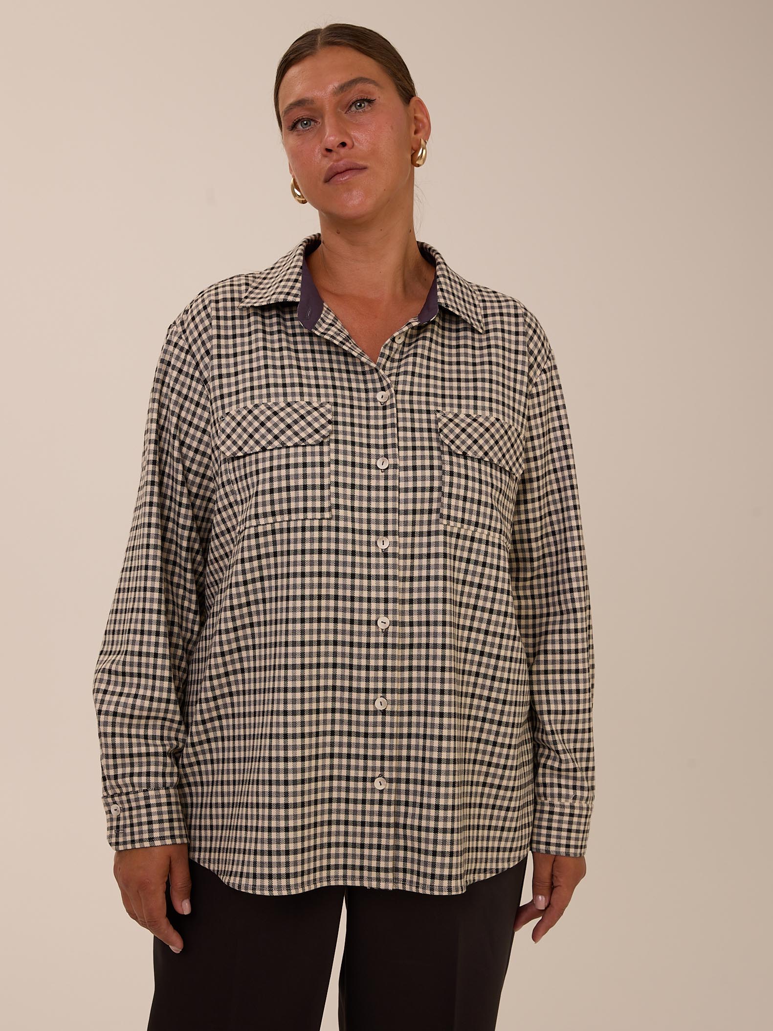 Рубашка прямого кроя со спущенным плечевым поясом. Воротник отложной на стойке. Рукава с манжетами. Нагрудные карманы накладные с клапанами. Низ изделия оформлен плавной линией с закругленными разрезами. Рубашка застегивается на петли и пуговицы. Выполнена из мягкой поливискозной клетчатой ткани в двух цветах с отделкой в тон: бежево-коричневый и серо-черный.