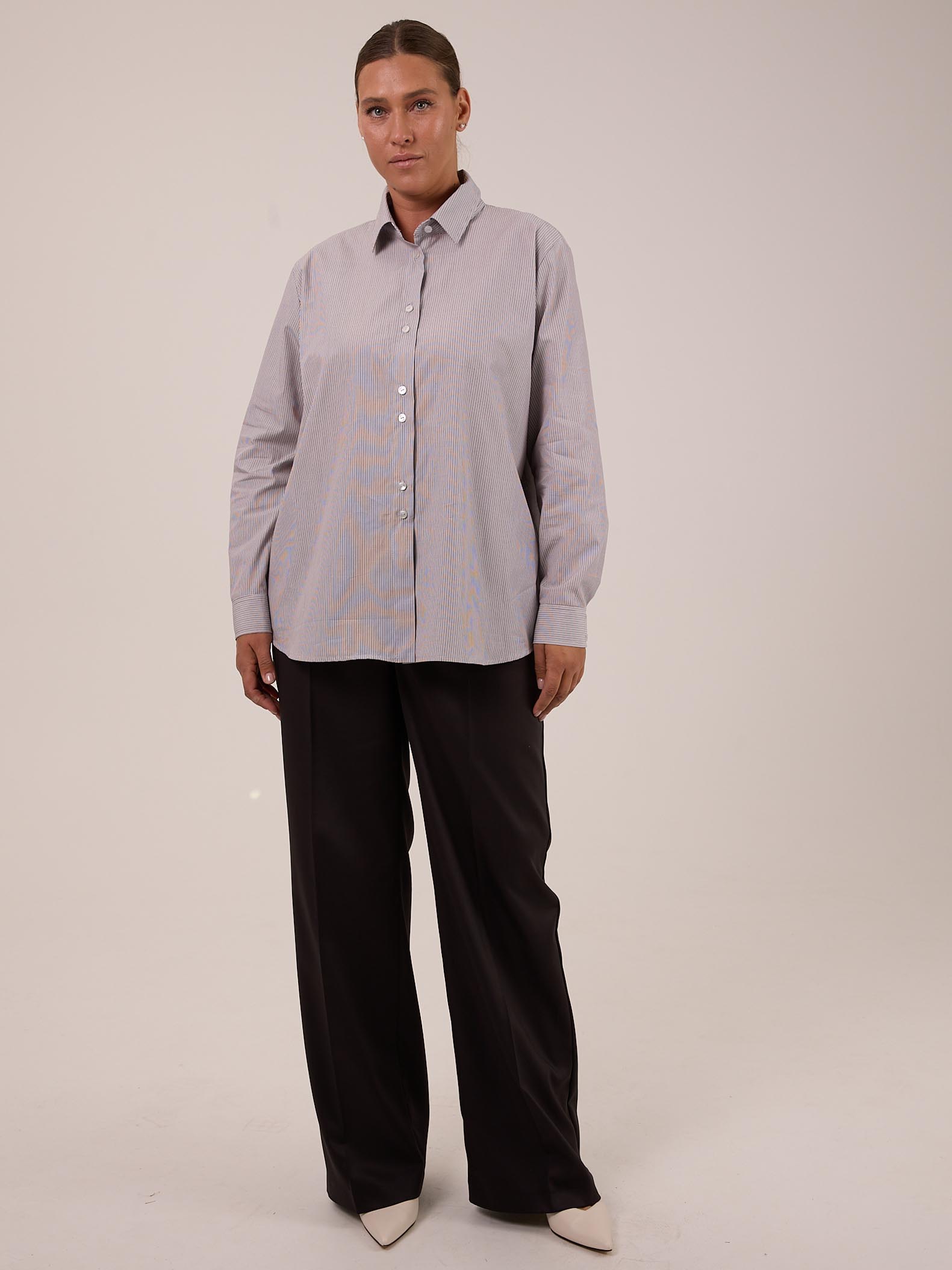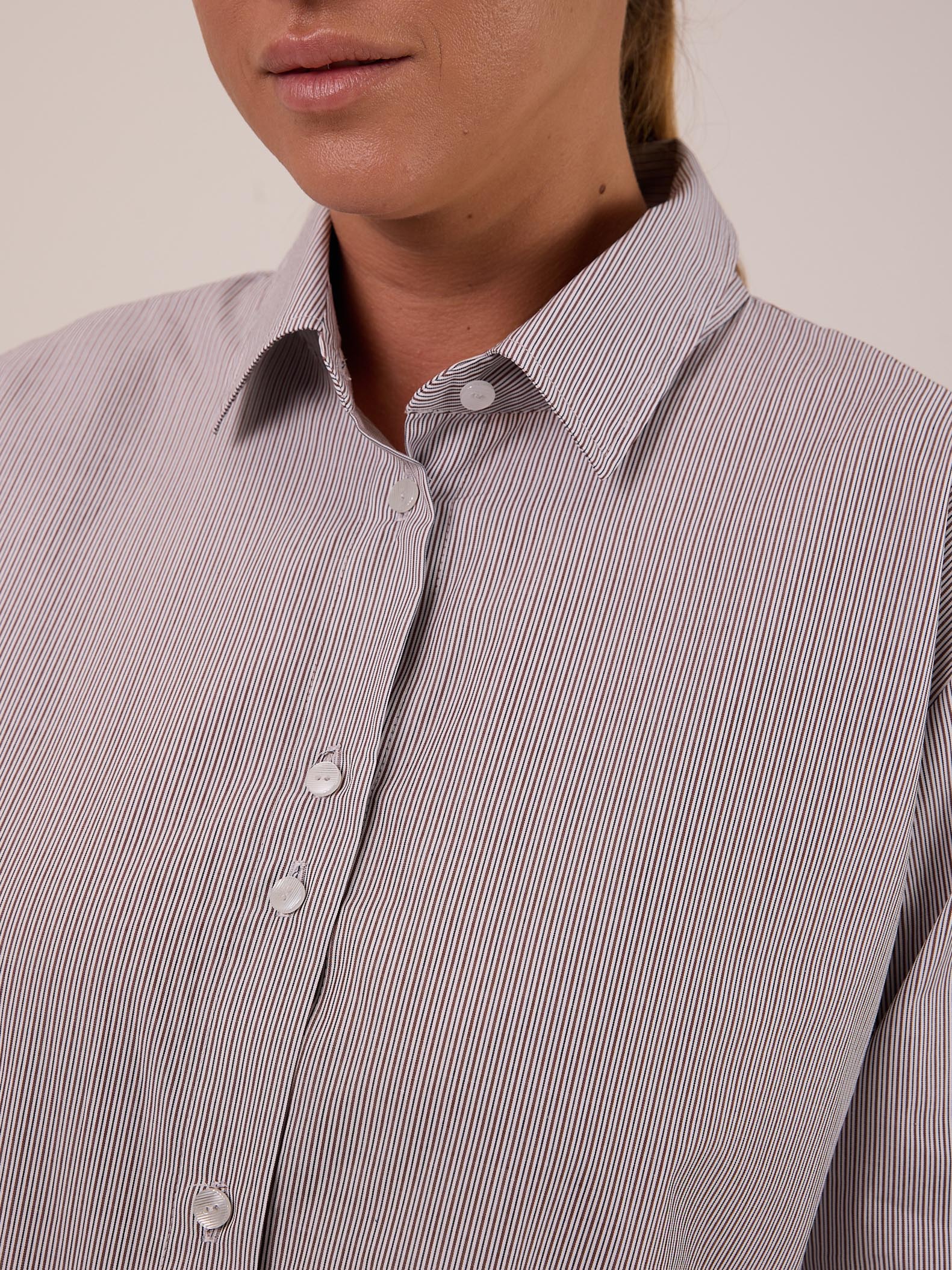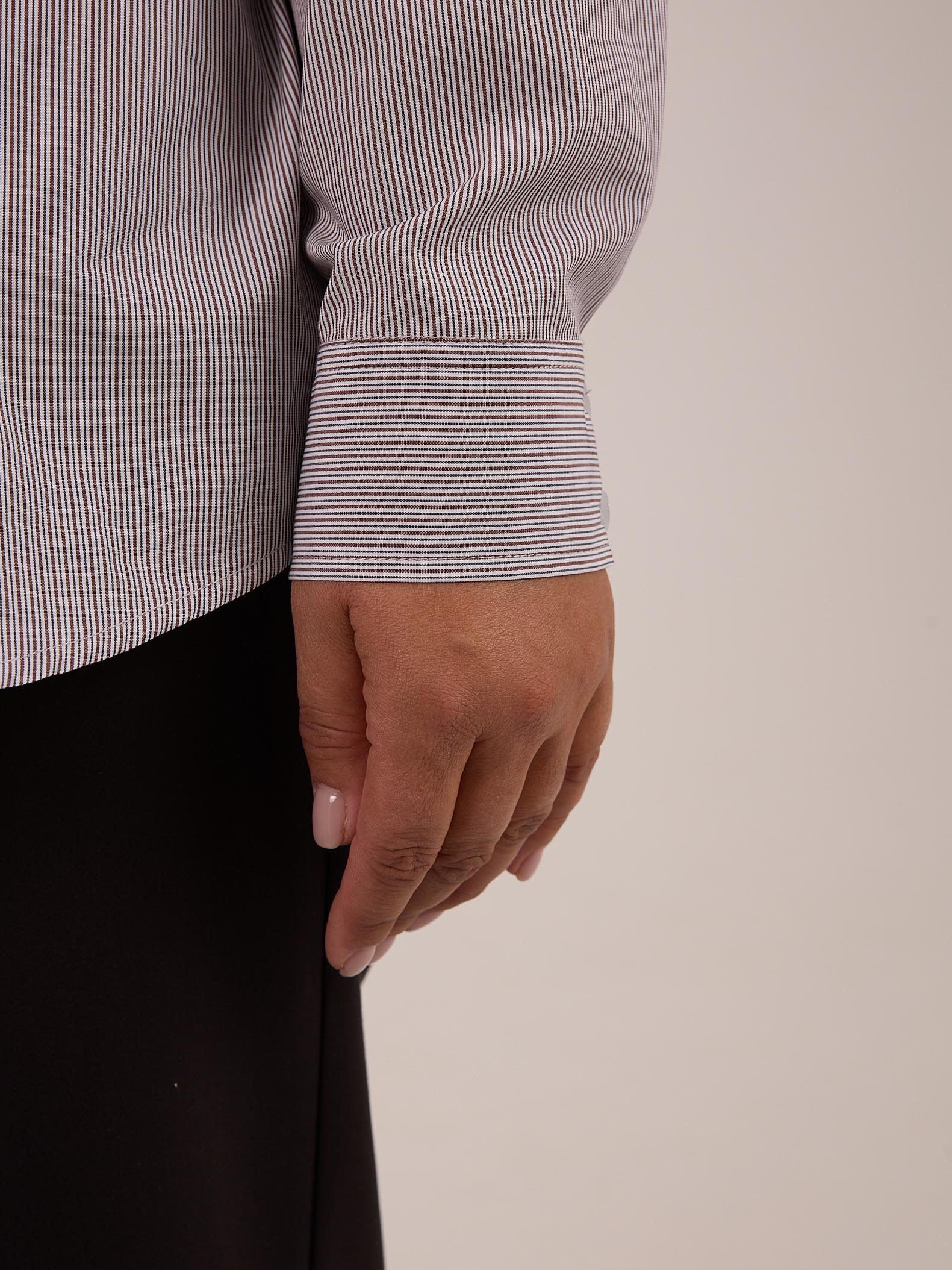 Классическая рубашка прямого кроя с приспущенным плечевым поясом. Воротник отложной на стойке. Рукава длинные с манжетами. На спинке, под кокеткой выполнена небольшая сборка, которая обеспечивает дополнительный объем. Низ оформлен плавной линией с закругленными боками. Застегивается рубашка на петли и пуговицы. Выполнена из хлопковой ткани в двух цветах: розовом и бежевом.