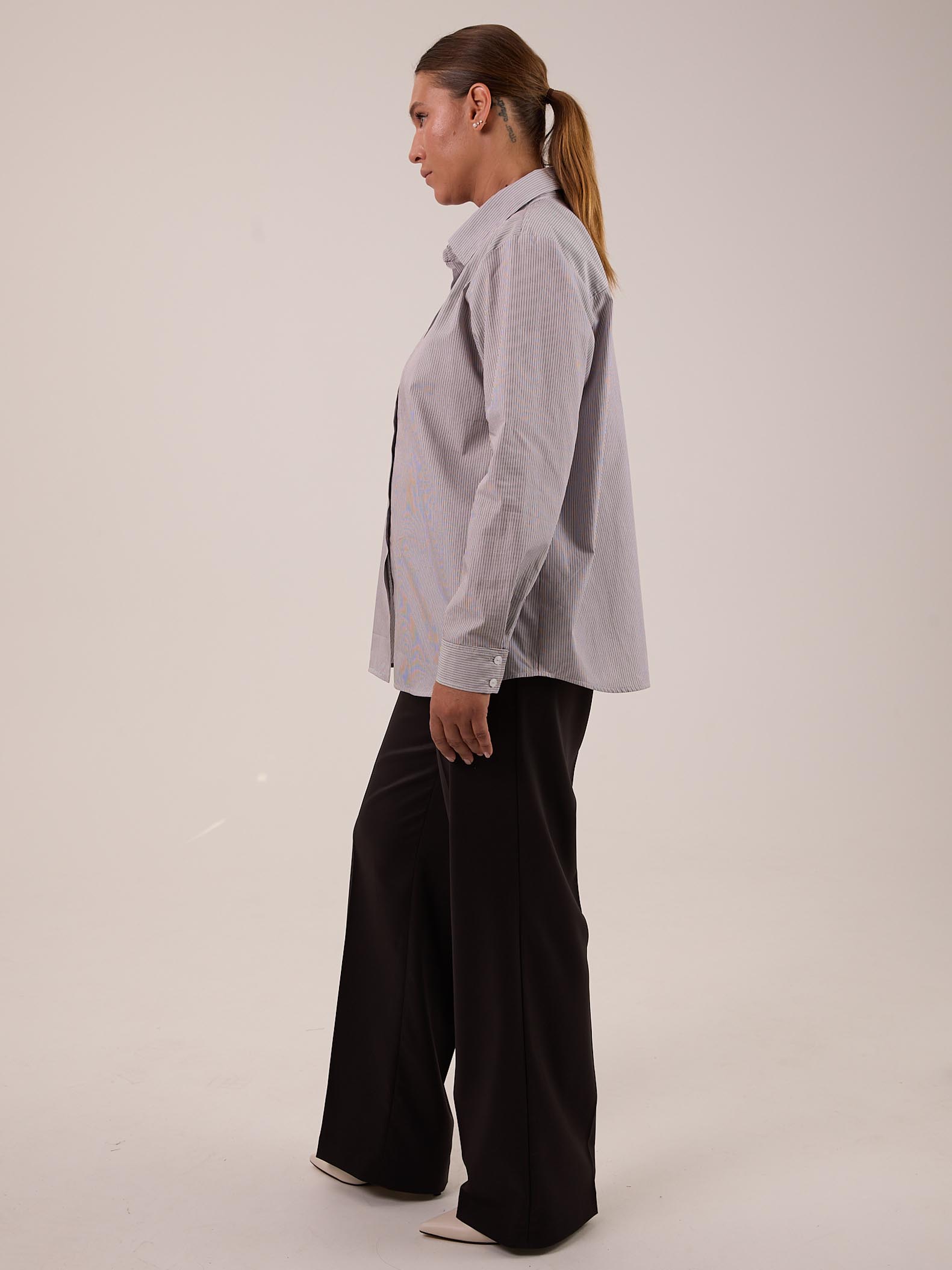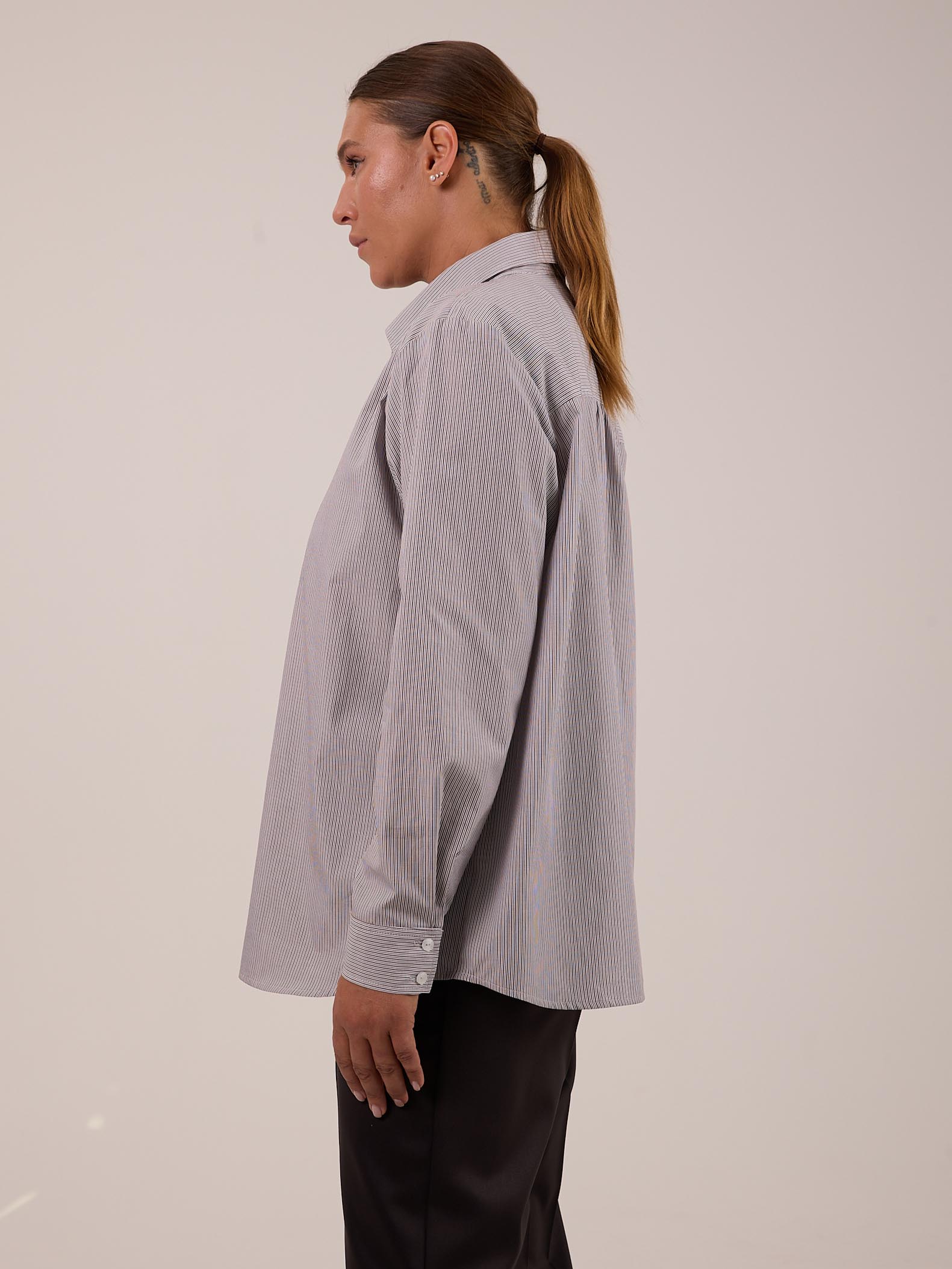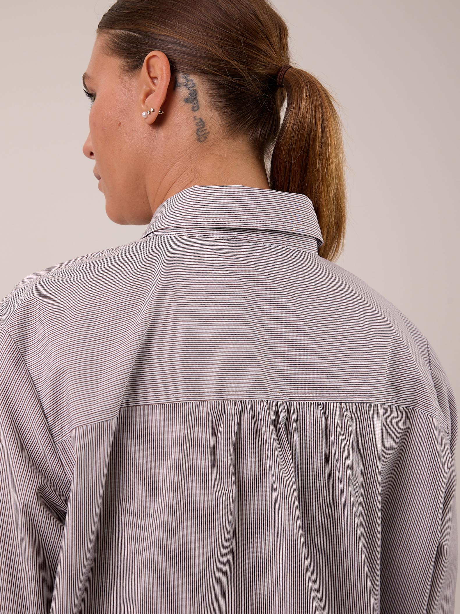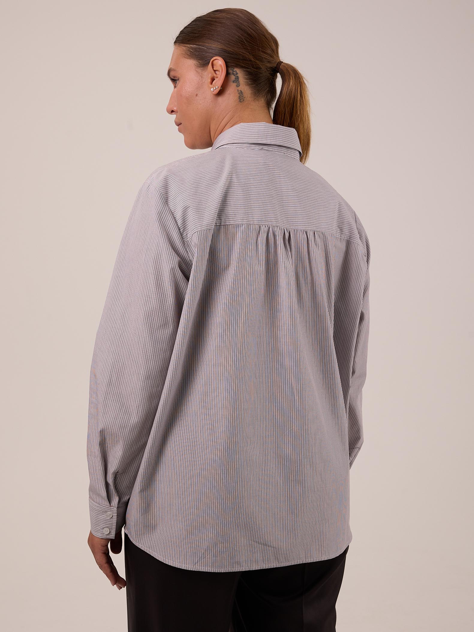Классическая рубашка прямого кроя с приспущенным плечевым поясом. Воротник отложной на стойке. Рукава длинные с манжетами. На спинке, под кокеткой выполнена небольшая сборка, которая обеспечивает дополнительный объем. Низ оформлен плавной линией с закругленными боками. Застегивается рубашка на петли и пуговицы. Выполнена из хлопковой ткани в двух цветах: розовом и бежевом.