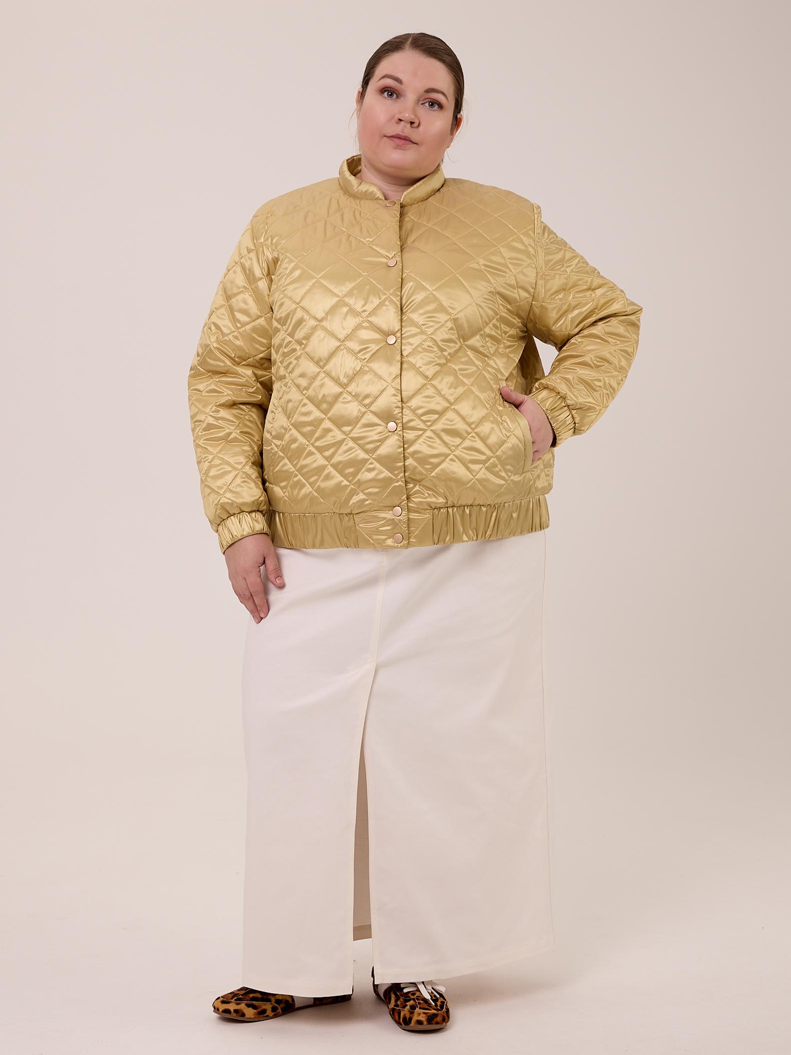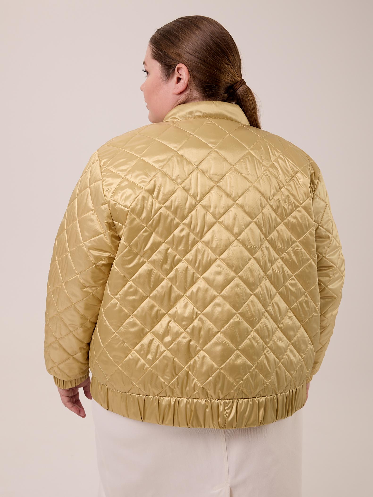 Куртка – бомбер – облегченная куртка из стеганной курточной с водоотталкивающем покрытием ткани с легким мерцанием, застежка на декоративные кнопки, по низу рукава и изделия – резинка.