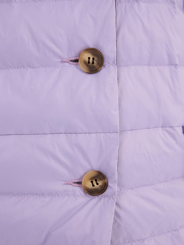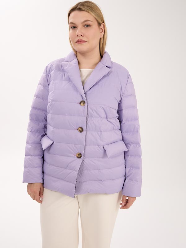 Легкий жакет-пуховик полуприлегающего силуэта, длиной до бедер. Воротник английский с лацканами. Рукава втачные двухшовные. Нагрудная вытачка обеспечивает хорошую посадку. Карманы горизонтальные, пиджачного типа, с клапанами. Изделие застегивается на петли и пуговицы. Выполнено из нейлоновой курточной ткани в трех цветах: темно-синем, серо-голубом, лиловом.