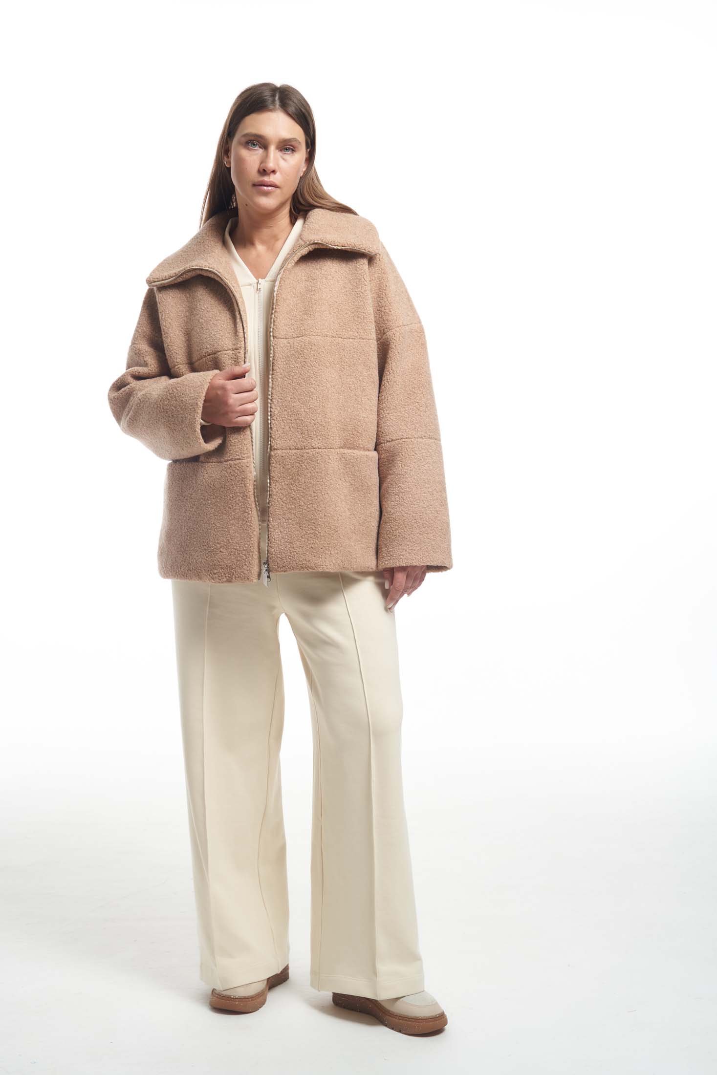 Меховой бомбер прямого свободного кроя со спущенным плечевым поясом. Воротник –высокая стойка. Карманы выполнены в горизонтальных подрезах. Длина изделия чуть ниже линии бедер. Застегивается на металлическую молнию. Внизу изделия есть кулиска с регулируемой резинкой. Бомбер выполнен из искусственного меха «овчинка» с содержанием шерсти. На утепленном подкладе есть внутренний накладной карман.