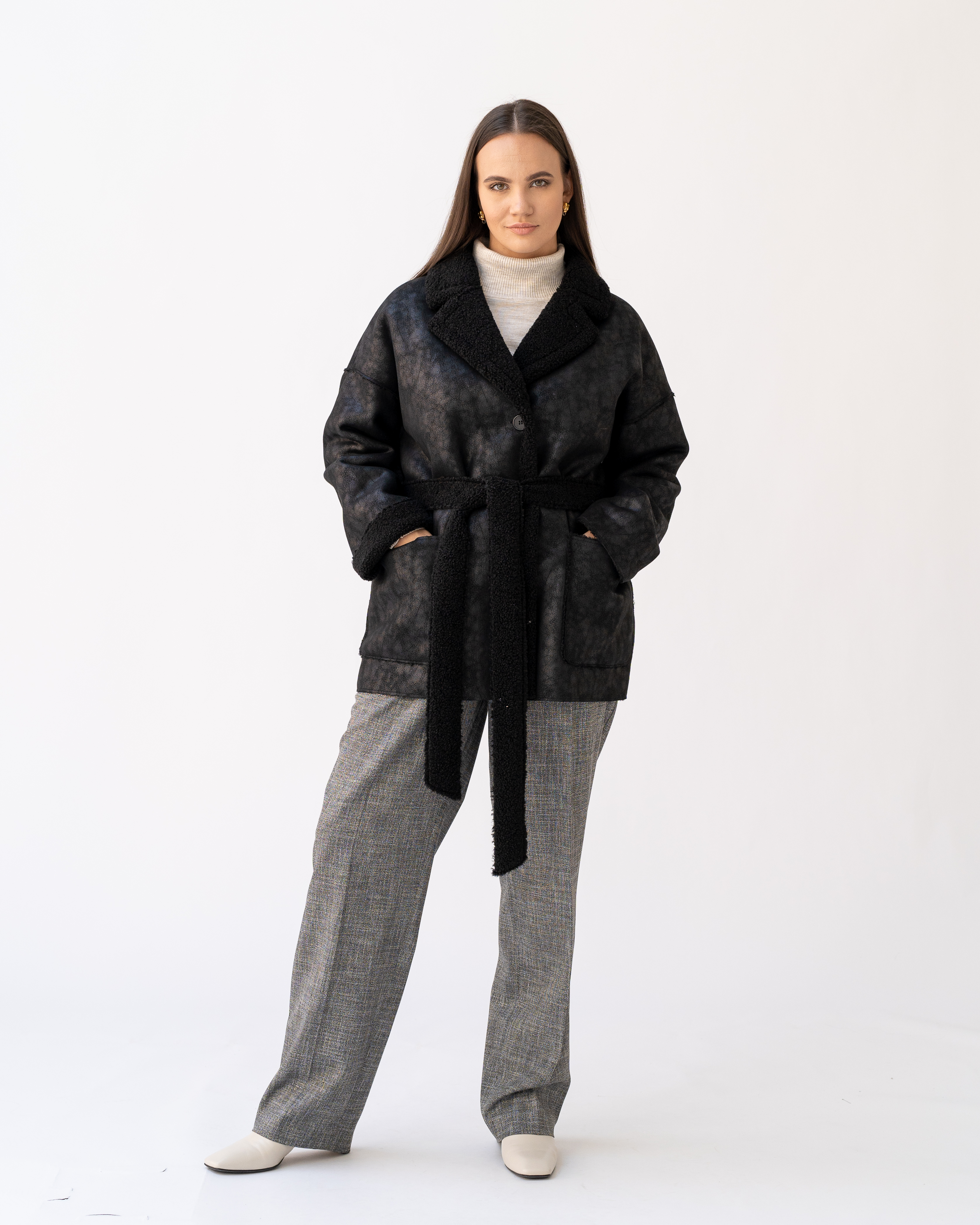 Короткая дубленка прямого кроя со спущенным плечевым поясом. Воротник английский с лацканами. Карманы накладные. Длина изделия чуть ниже бедер. Есть съемный пояс. Дубленка застегивается на петли и пуговицы. Выполнена из искусственной замши под овчину в черном цвете.