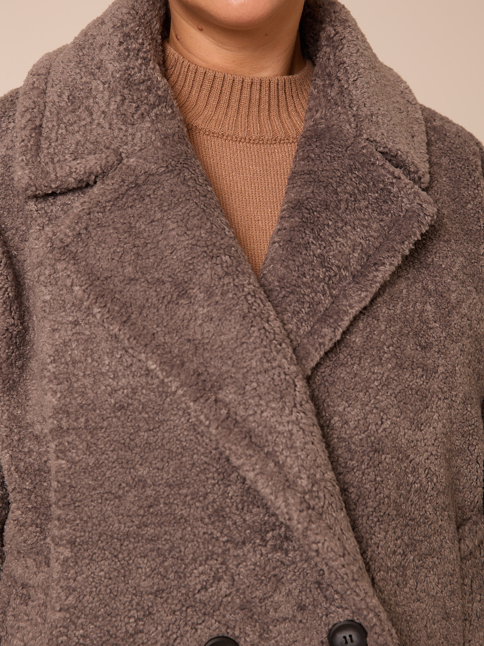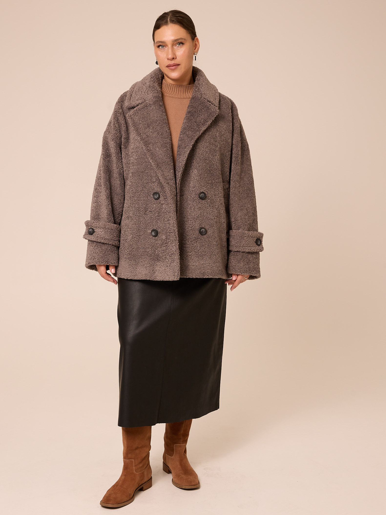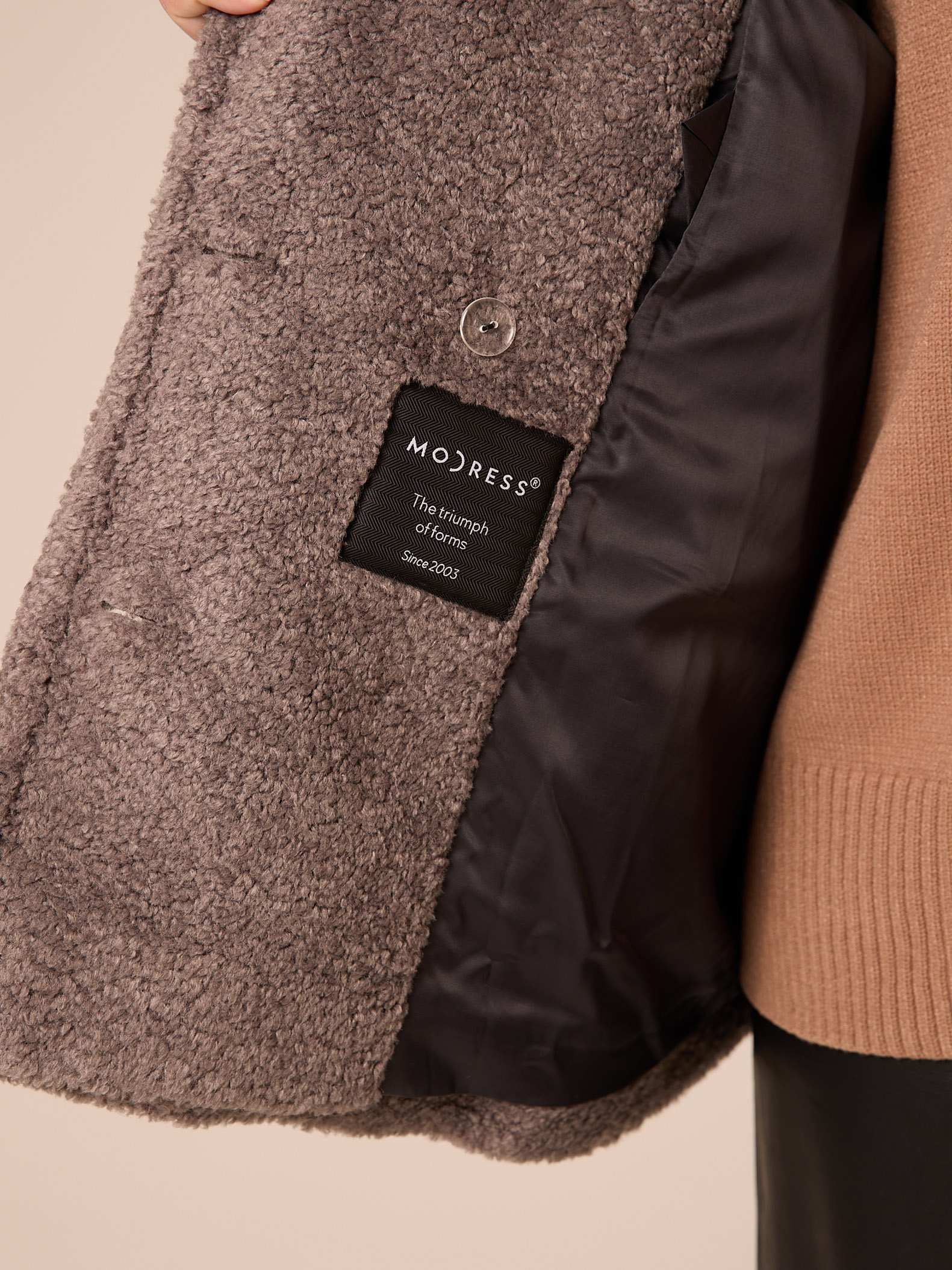 Короткое двубортное полупальто прямого свободного кроя. Воротник широкий «английский» с лацканами. Рукава спущенные с патами. Боковые карманы прорезные с широкими листочками. Длина изделия до линии бедер. Застегивается пальто на петли и пуговицы. Изделие выполнено на подкладке.