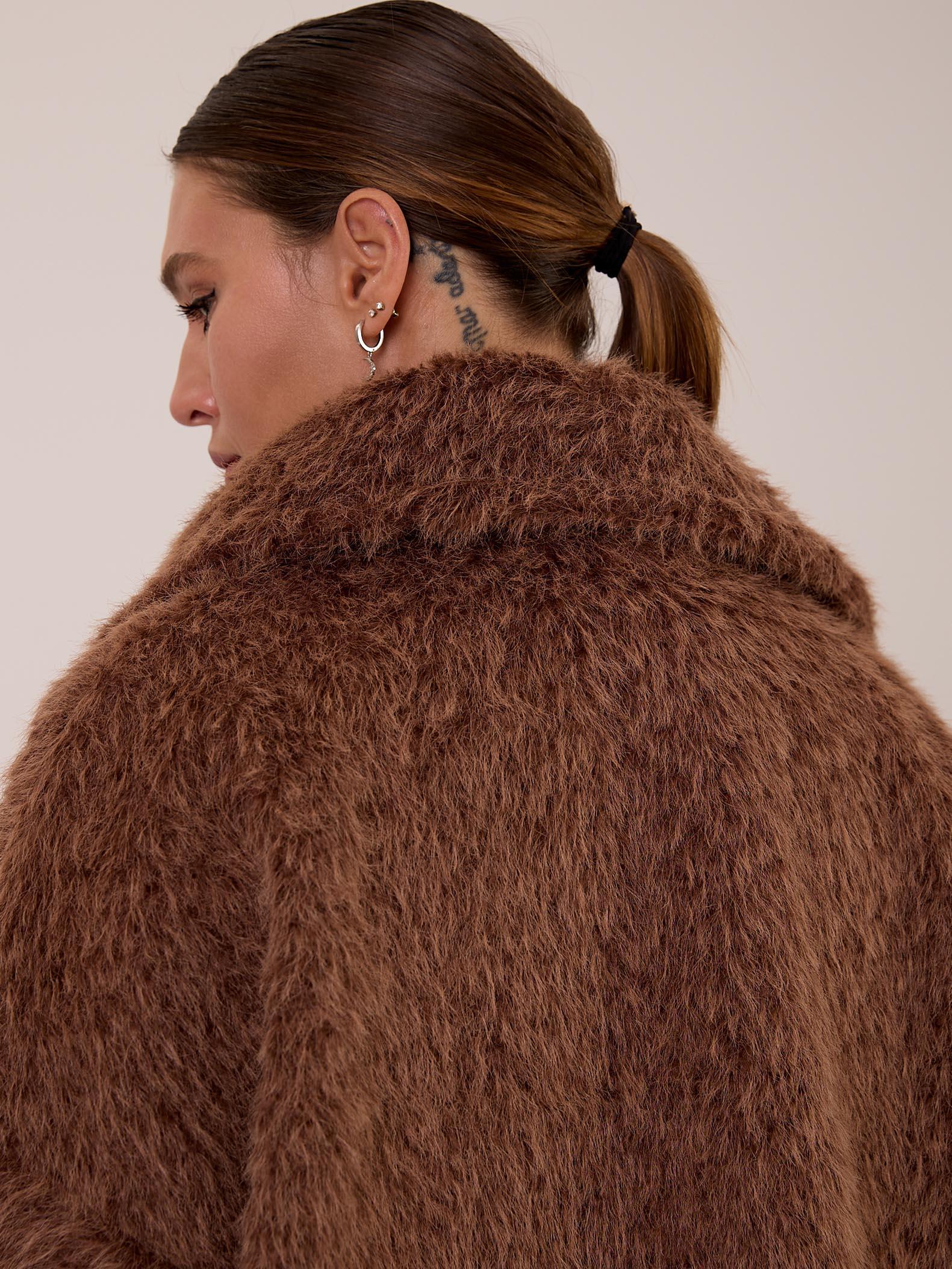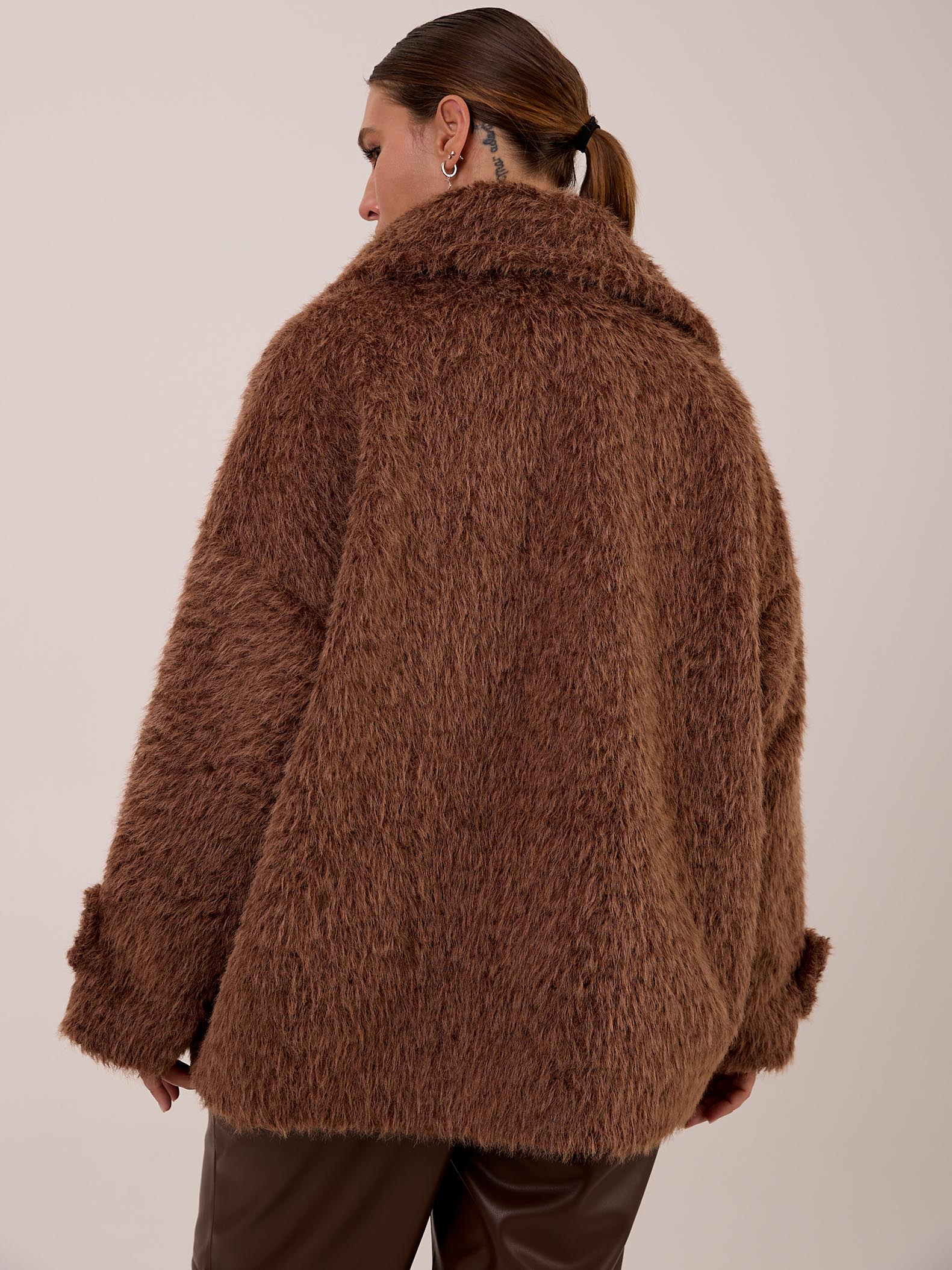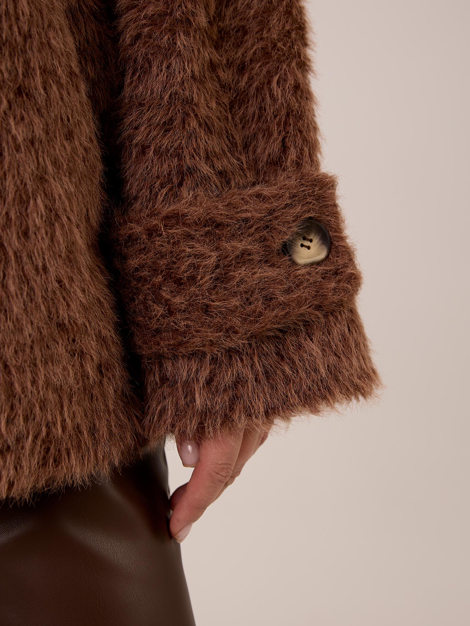 Короткое пальто свободного кроя со спущенным плечевым поясом. Эффектный отложной воротник. Рукава с широкими патами. Боковые карманы с листочками. Пальто имеет комбинированную застежку с верхней пуговицей и потайными пришивными кнопками. Изделие выполнено из пальтовой ткани с длинным ворсом ( имитация меха). Цвета: черный, коричневый, молочный.