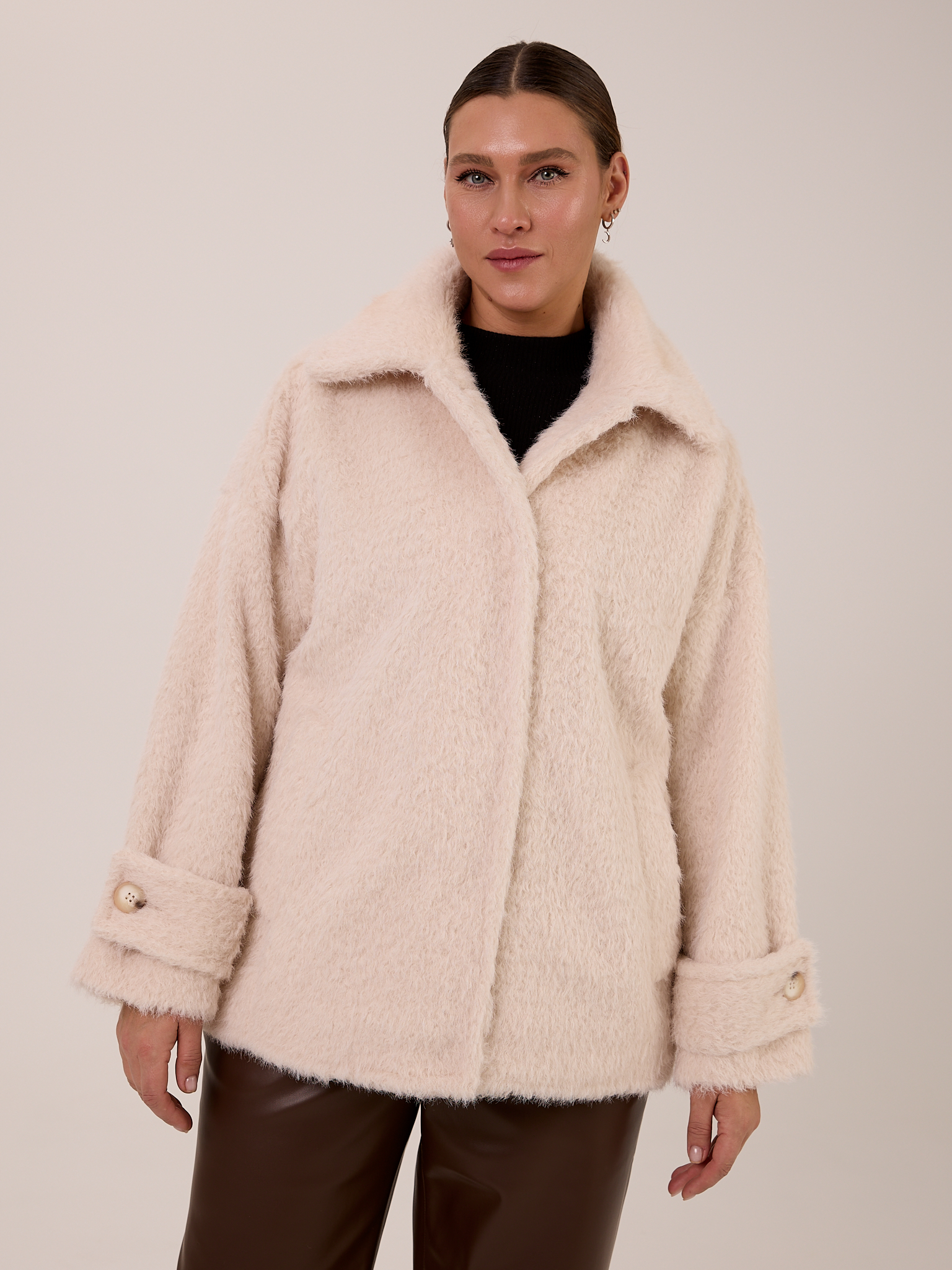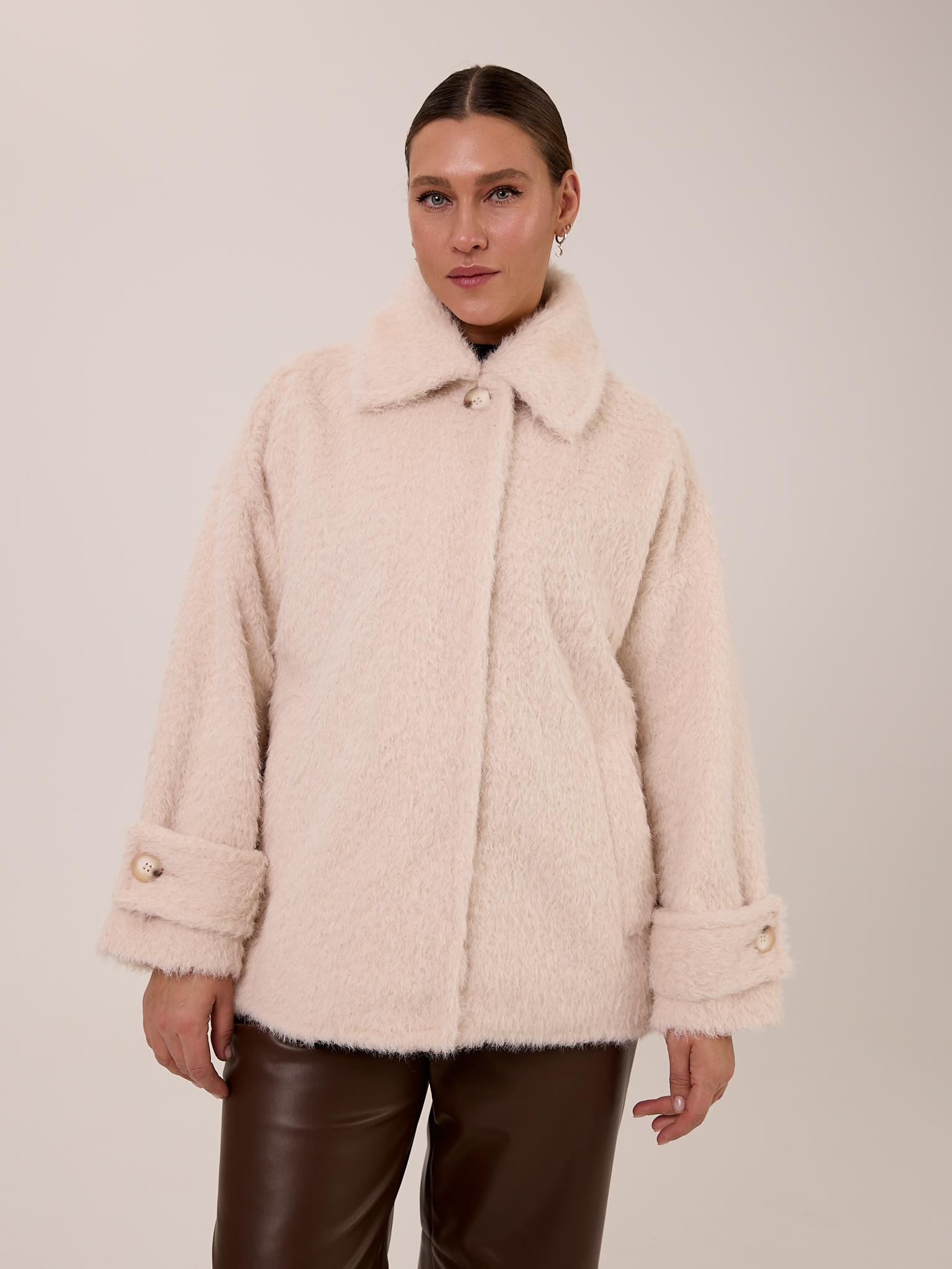 Короткое пальто свободного кроя со спущенным плечевым поясом. Эффектный отложной воротник. Рукава с широкими патами. Боковые карманы с листочками. Пальто имеет комбинированную застежку с верхней пуговицей и потайными пришивными кнопками. Изделие выполнено из пальтовой ткани с длинным ворсом ( имитация меха). Цвета: черный, коричневый, молочный.