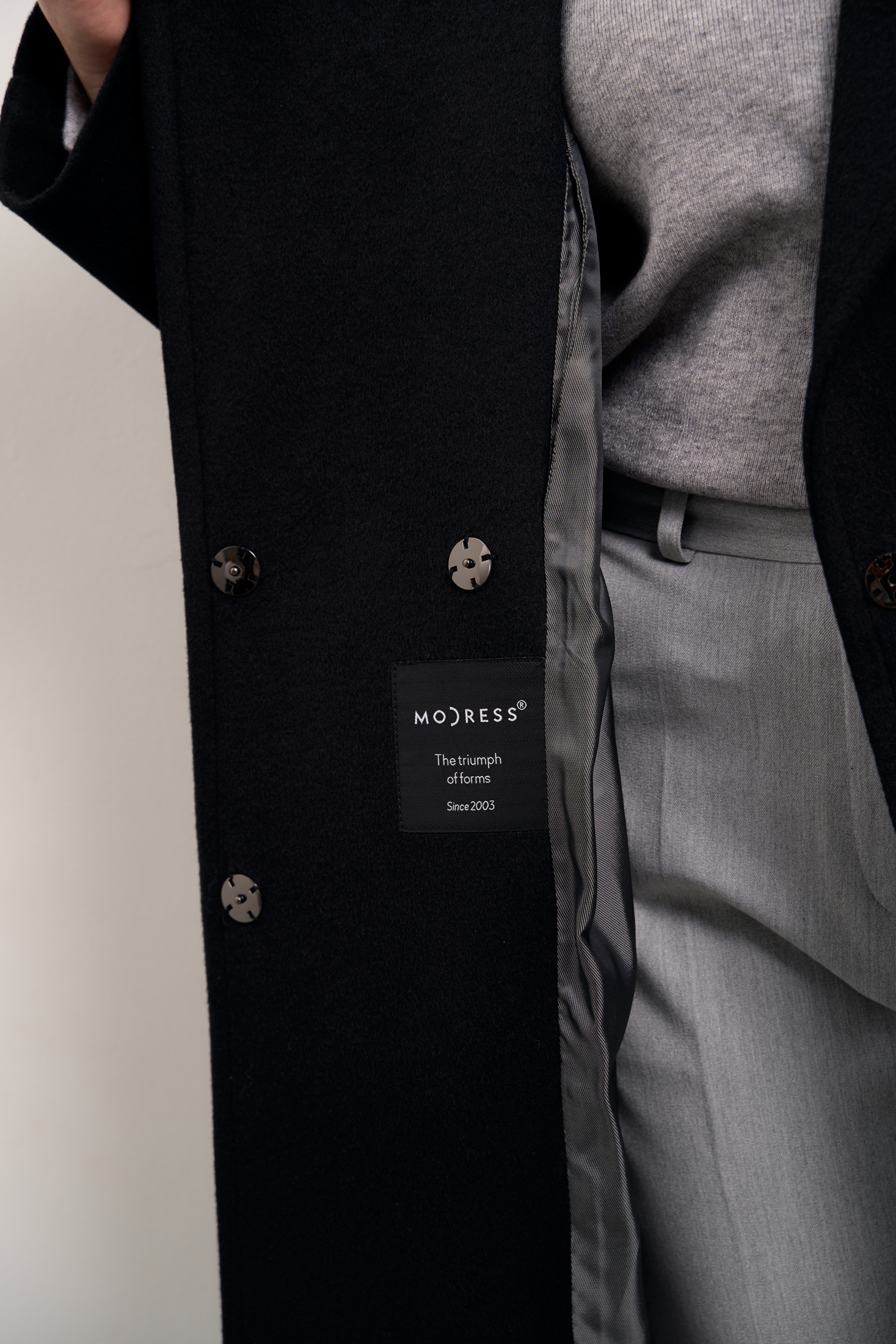 Драповое пальто-халат с английским воротником и съемным поясом. Рукава реглан. Боковые карманы прорезные с листочками. В боковых швах разрезы. Пальто застегивается на пришивные кнопки. По воротнику, краю борта, верхнему шву рукава и листочкам выполнена широкая эффектная отстрочка. Пальто выполнено из ткани с высоким содержанием шерсти на поливискозной подкладке.