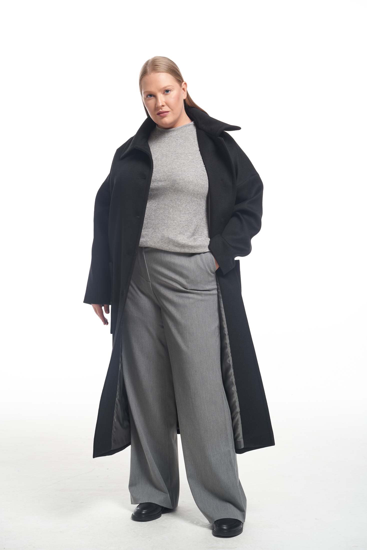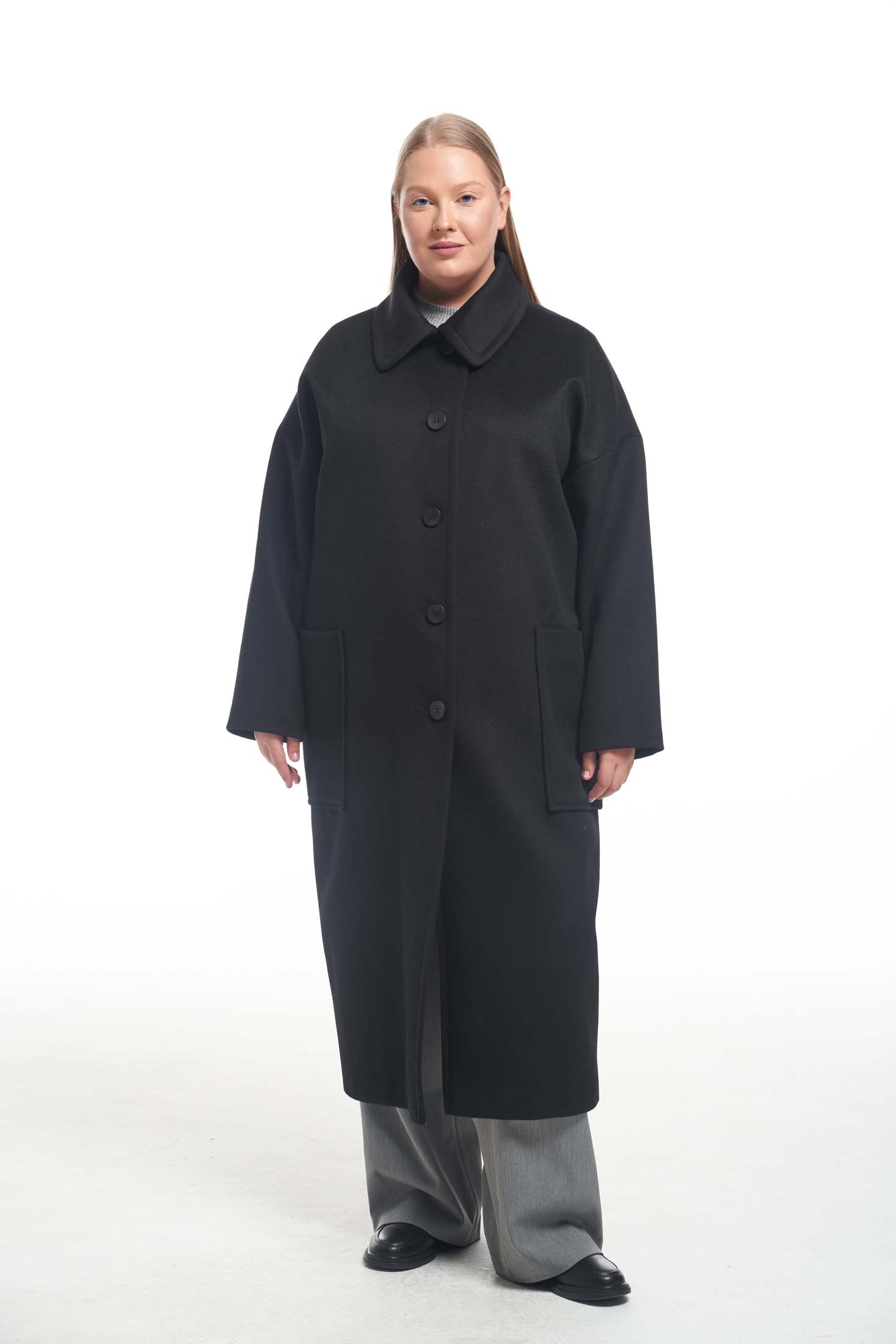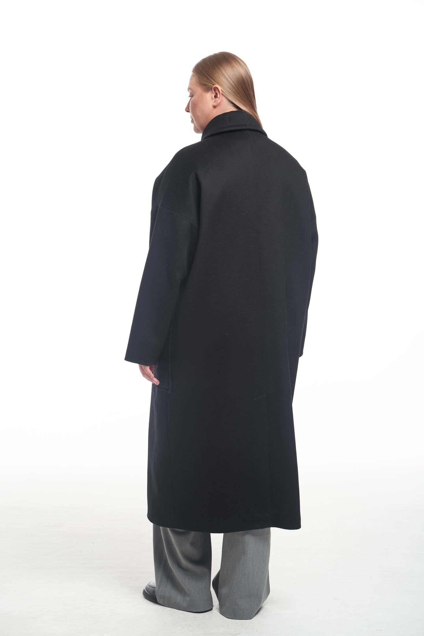 Драповое длинное пальто свободного кроя типа «овер». Воротник отложной с закругленными углами. По воротнику и краю борта эффектная широкая отстрочка. Плечевой пояс спущен, это обеспечивает отличную посадку на любую форму плеч. Боковые карманы накладные, большие. В среднем шве спинки выполнена шлица. Пальто застегивается на петли и пуговицы. Выполнено из ткани с высоким содержанием шерсти на поливискозной подкладке.