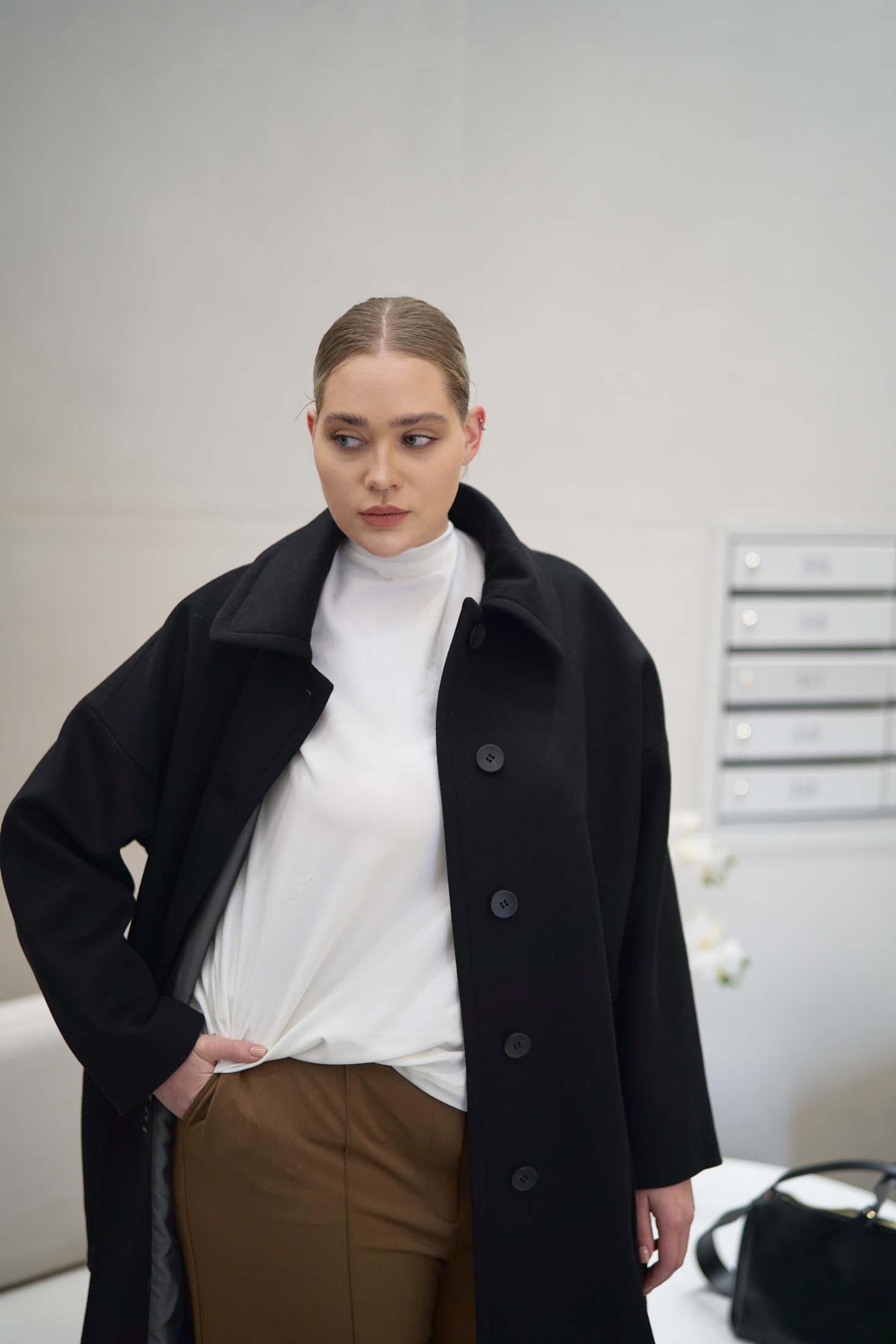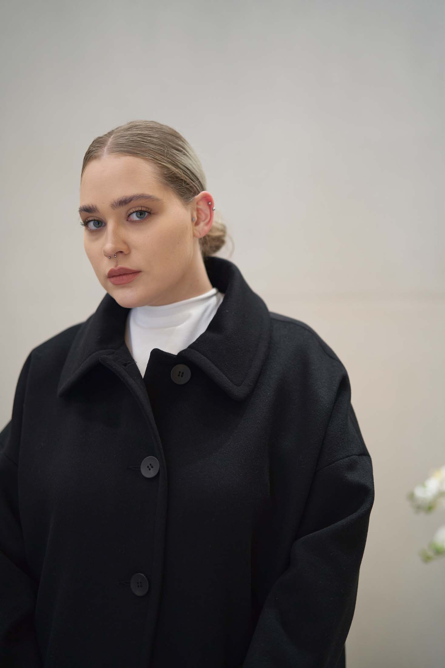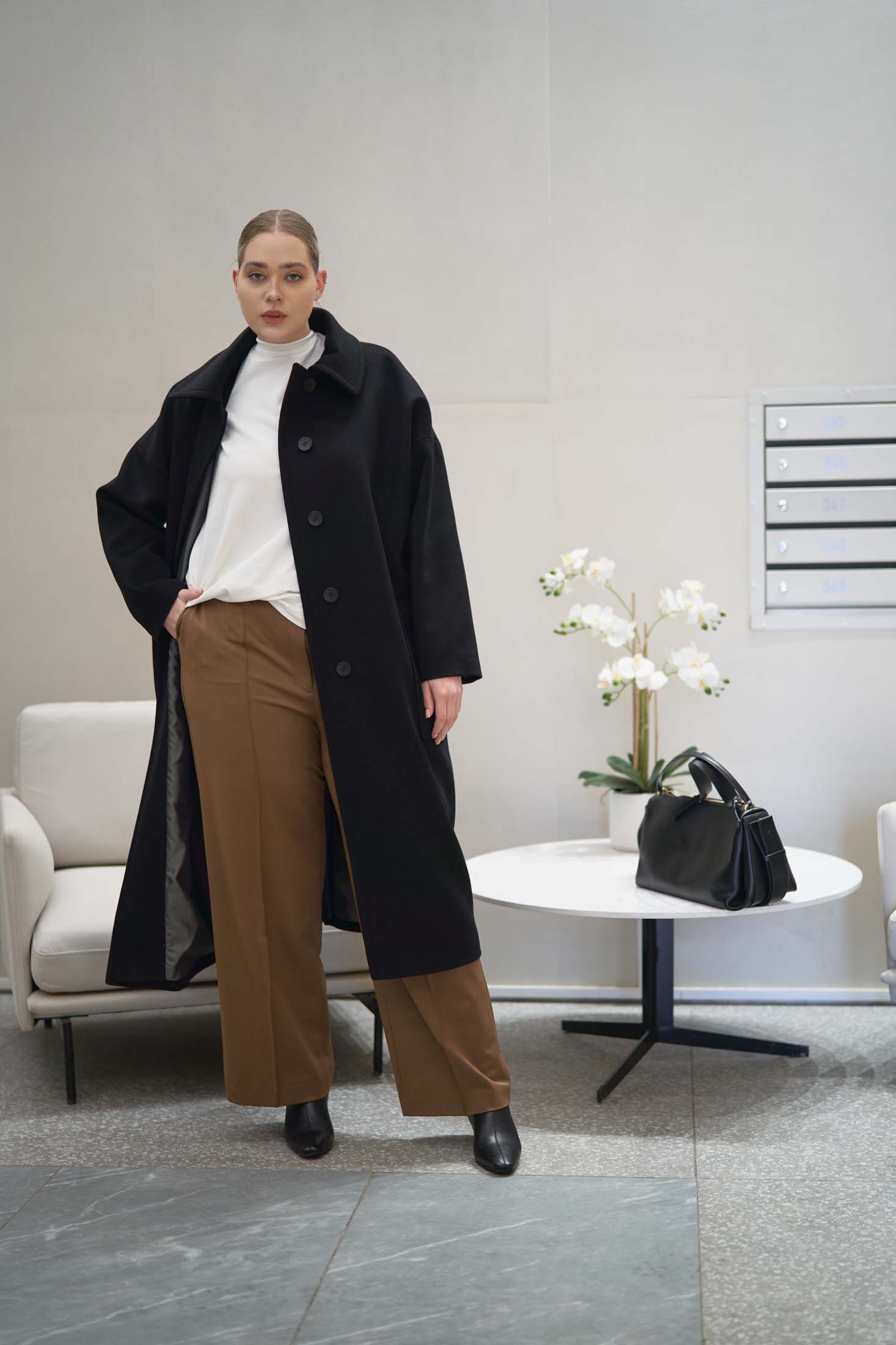Драповое длинное пальто свободного кроя типа «овер». Воротник отложной с закругленными углами. По воротнику и краю борта эффектная широкая отстрочка. Плечевой пояс спущен, это обеспечивает отличную посадку на любую форму плеч. Боковые карманы накладные, большие. В среднем шве спинки выполнена шлица. Пальто застегивается на петли и пуговицы. Выполнено из ткани с высоким содержанием шерсти на поливискозной подкладке.