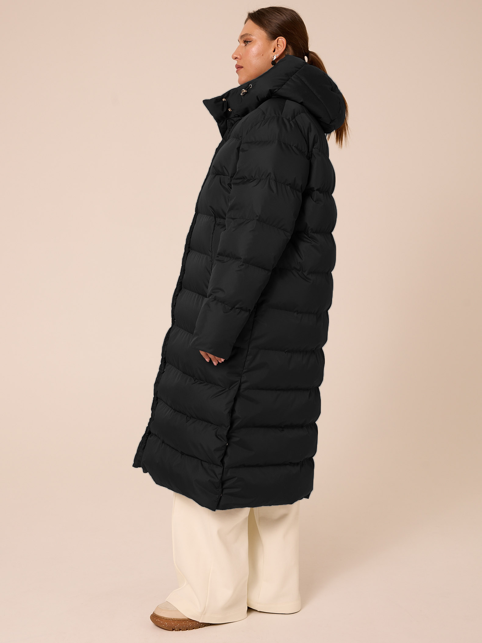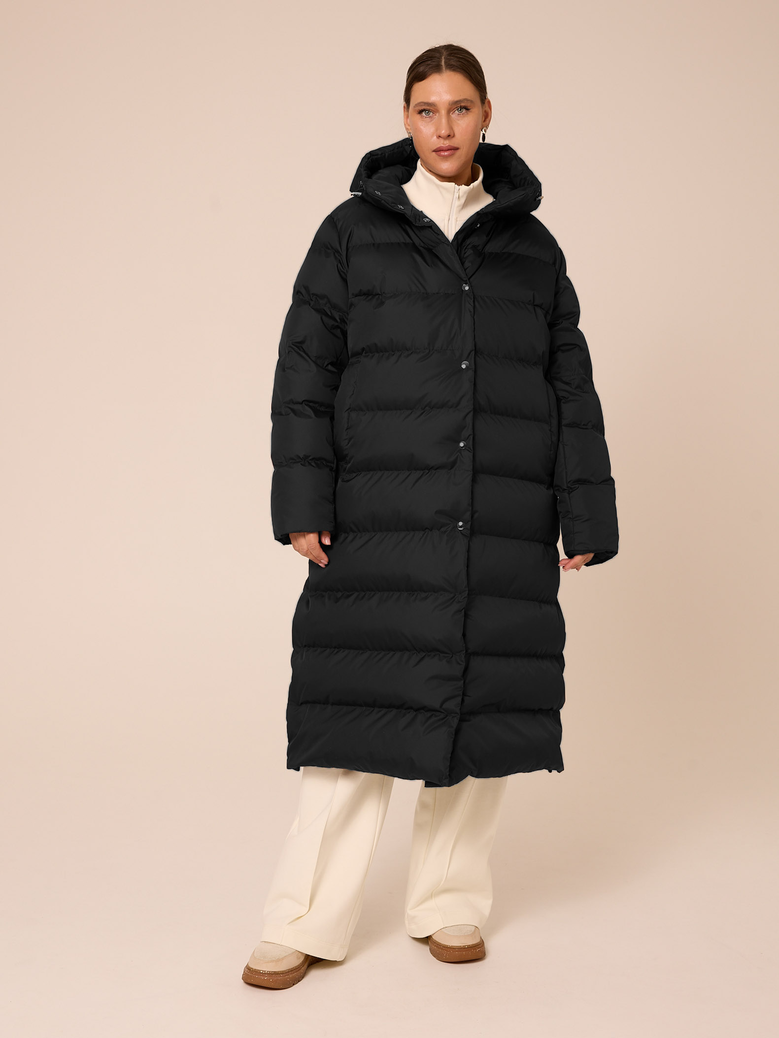 Утеплитель лебяжий синтепух 165-180гр/м2 +термофин 60гр/м2. Длинное пальто прямого кроя. Плечевой пояс немного спущен. Капюшон втачной с кулиской. Боковые карманы прорезные с листочками. Есть внутренний накладной карман на подкладке. В боковых швах выполнены разрезы на кнопках. Пальто застегивается на внутреннюю молнию и кнопки. Выполнено из курточной ткани с водоотталкивающей пропиткой. Цвета: черный, бордовый, св. желтый.