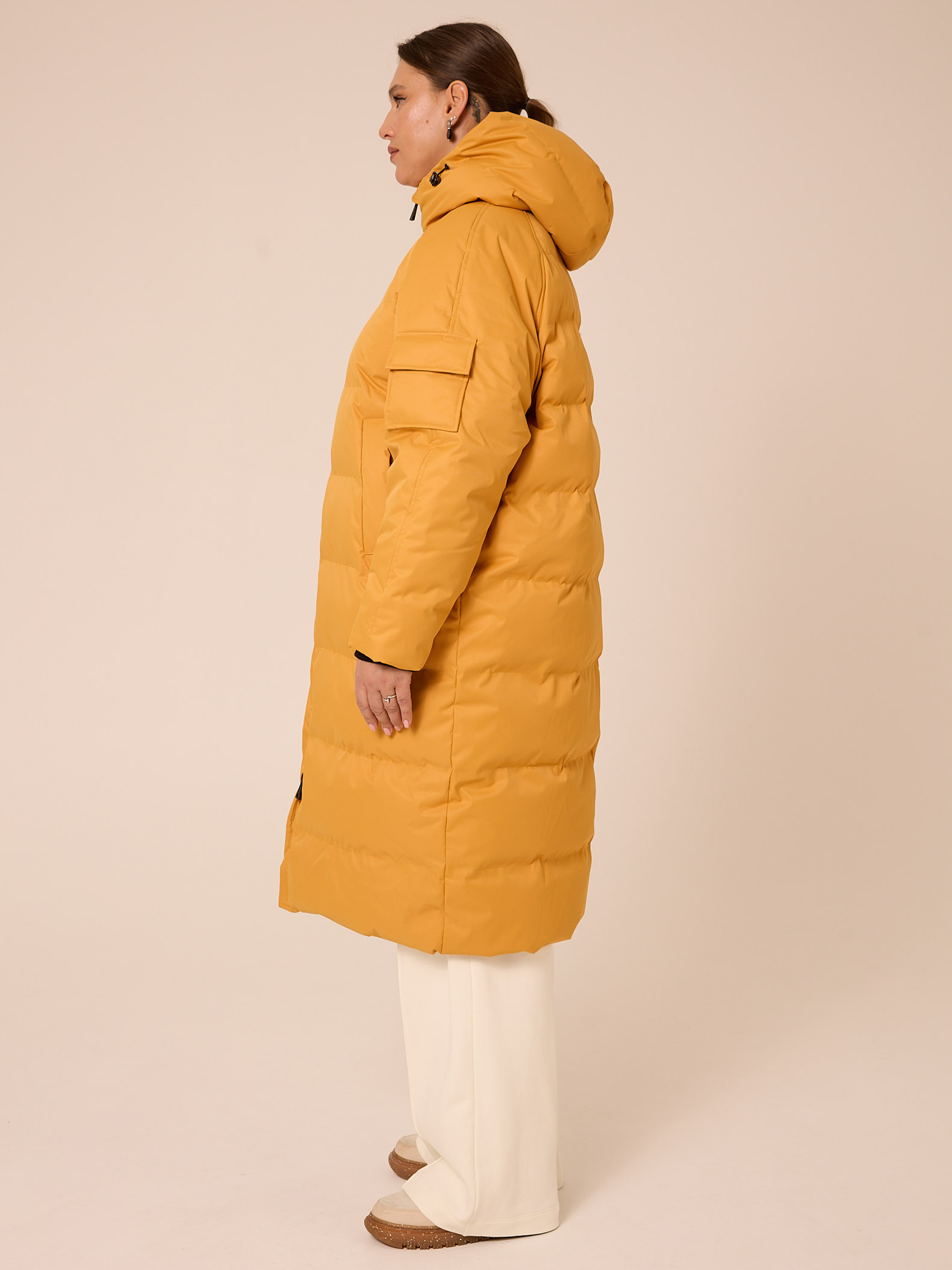 Утеплитель лебяжий синтепух 150-180гр/м2 +термофин 60гр/м2. Пальто прямого кроя, длиной Капюшон втачной с кулиской. Боковые карманы прорезные с листочками. Есть внутренний накладной карман на подкладке. По низу изделия выполнена кулиска с регулируемой резинкой. Пальто застегивается на широкую тракторную молнию. Выполнено из плотной курточной ткани с мембраной, и с водоотталкивающей пропиткой. Цвета: сиреневый, черный, желтый.