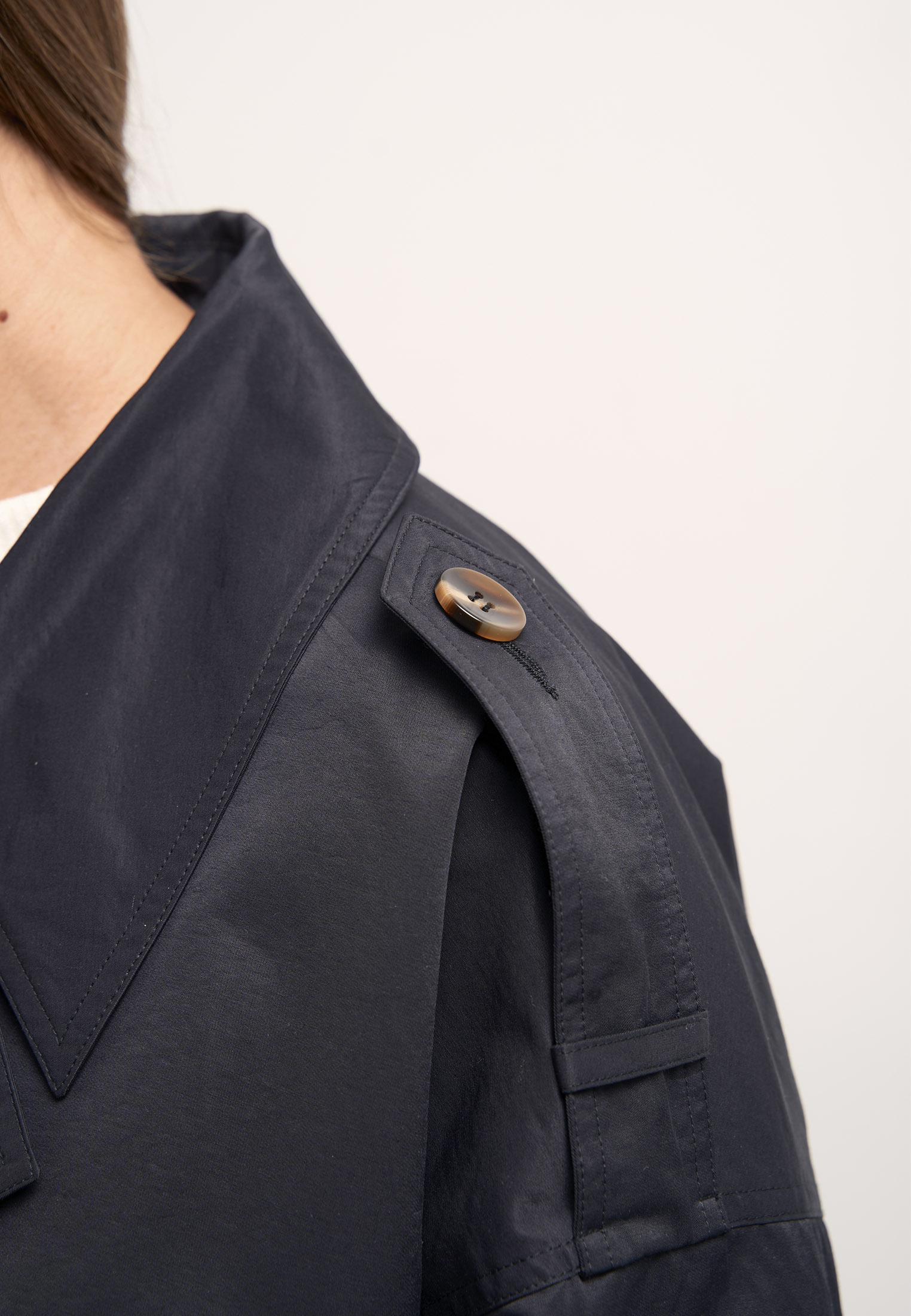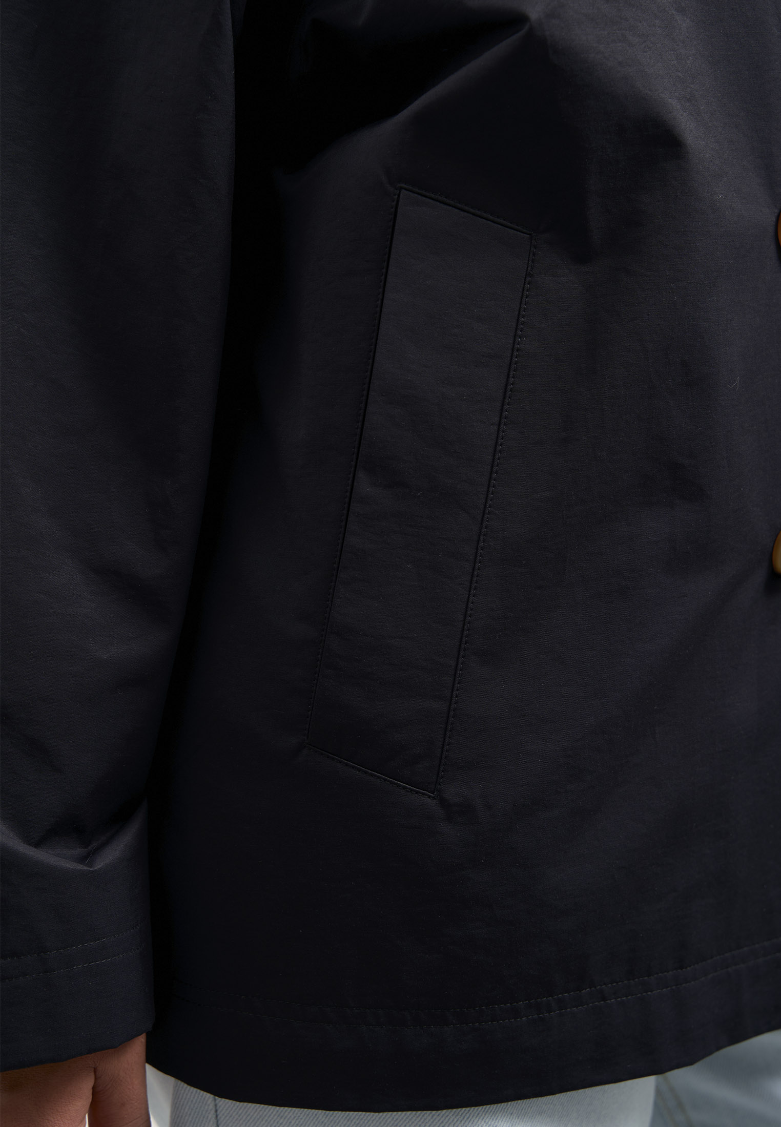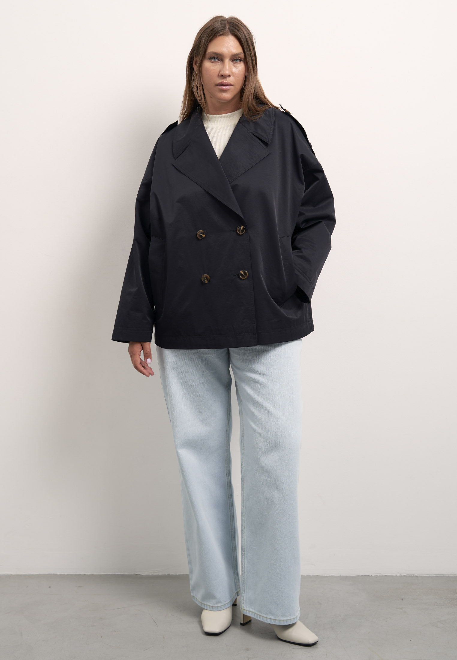 Двубортный укороченный тренч прямого свободного кроя. Воротник широкий «английский» с лацканами. Рукава спущенные с погонами - элемент тренча. Боковые карманы прорезные с листочками. Длина изделия до линии бедер. Застегивается изделие на пуговицы. Жакет выполнен из плащевой ткани с содержанием хлопка. Цвета: черный, серый, св. коричневый.
