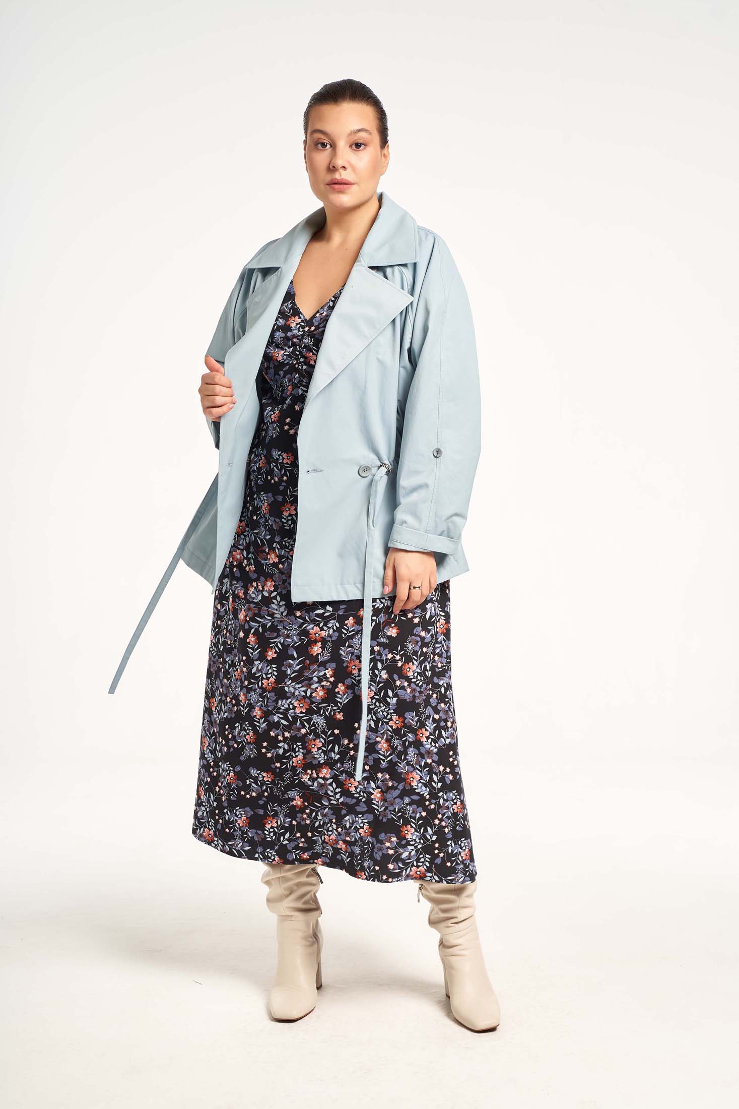 Жакет двубортный прямого силуэта с кулиской на талии. Длина чуть ниже линии бедер. Широкий английский воротник с лацканами. Рукава реглан с патами для отворота рукава. Боковые карманы в рельефных швах. Застегивается изделие на петли и пуговицы. На спинке – отлетная кокетка. Жакет выполнен без подкладки из плащевой ткани с высоким содержанием хлопка.